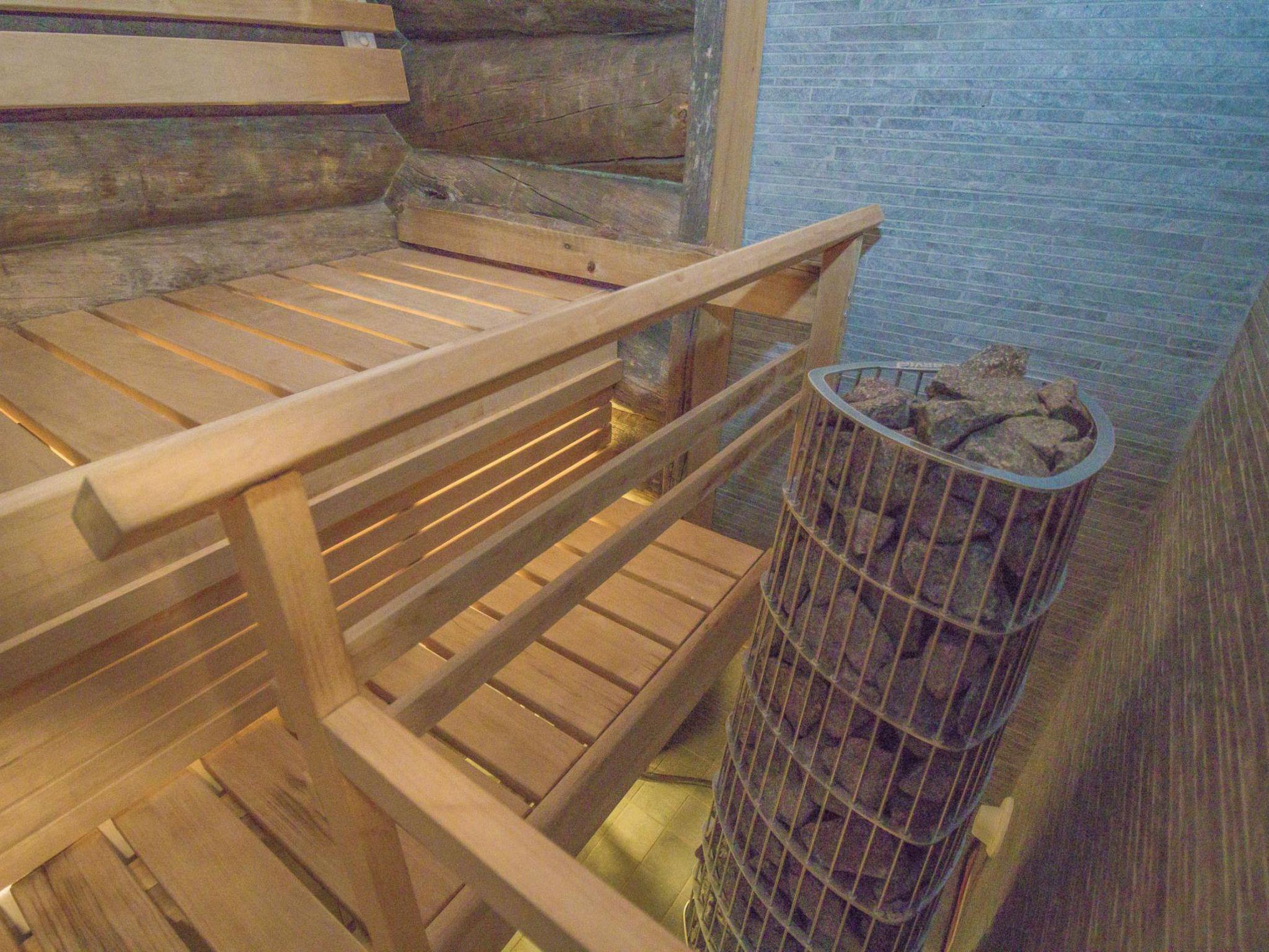 Inside the cabin, a comfortable living room/kitchen is combined with a relaxing electric sauna.