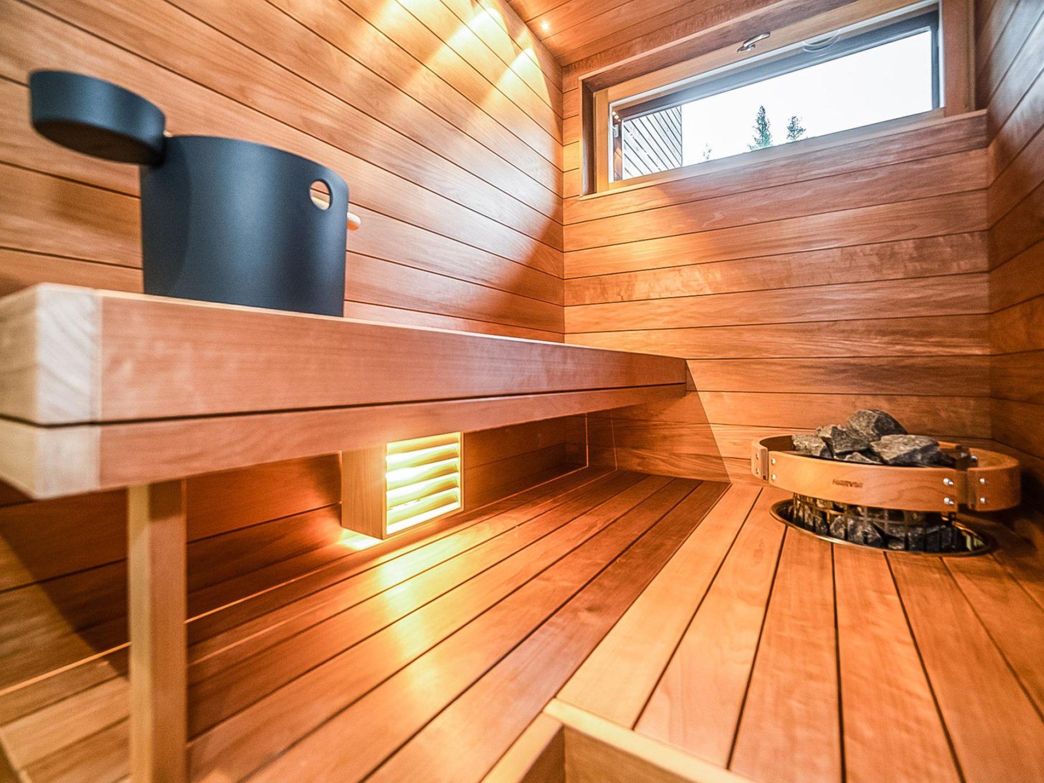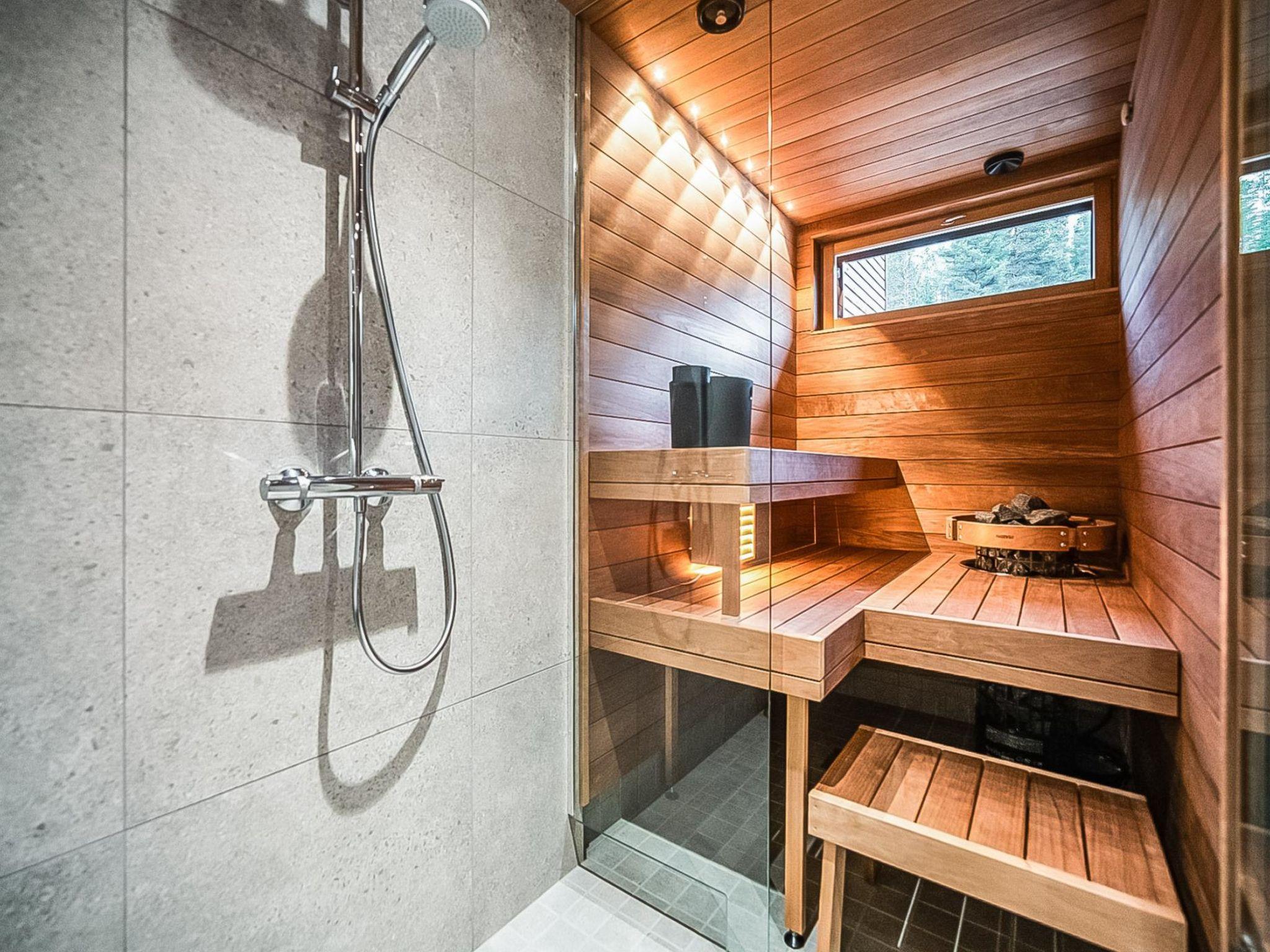 The cabin's spacious living room/kitchen provides an excellent setting for quality time with family and friends. Delight in delicious meals and relax in the comfortable living area. Moreover, the cabin features its own electric sauna, offering relaxation and rejuvenation after a long day.