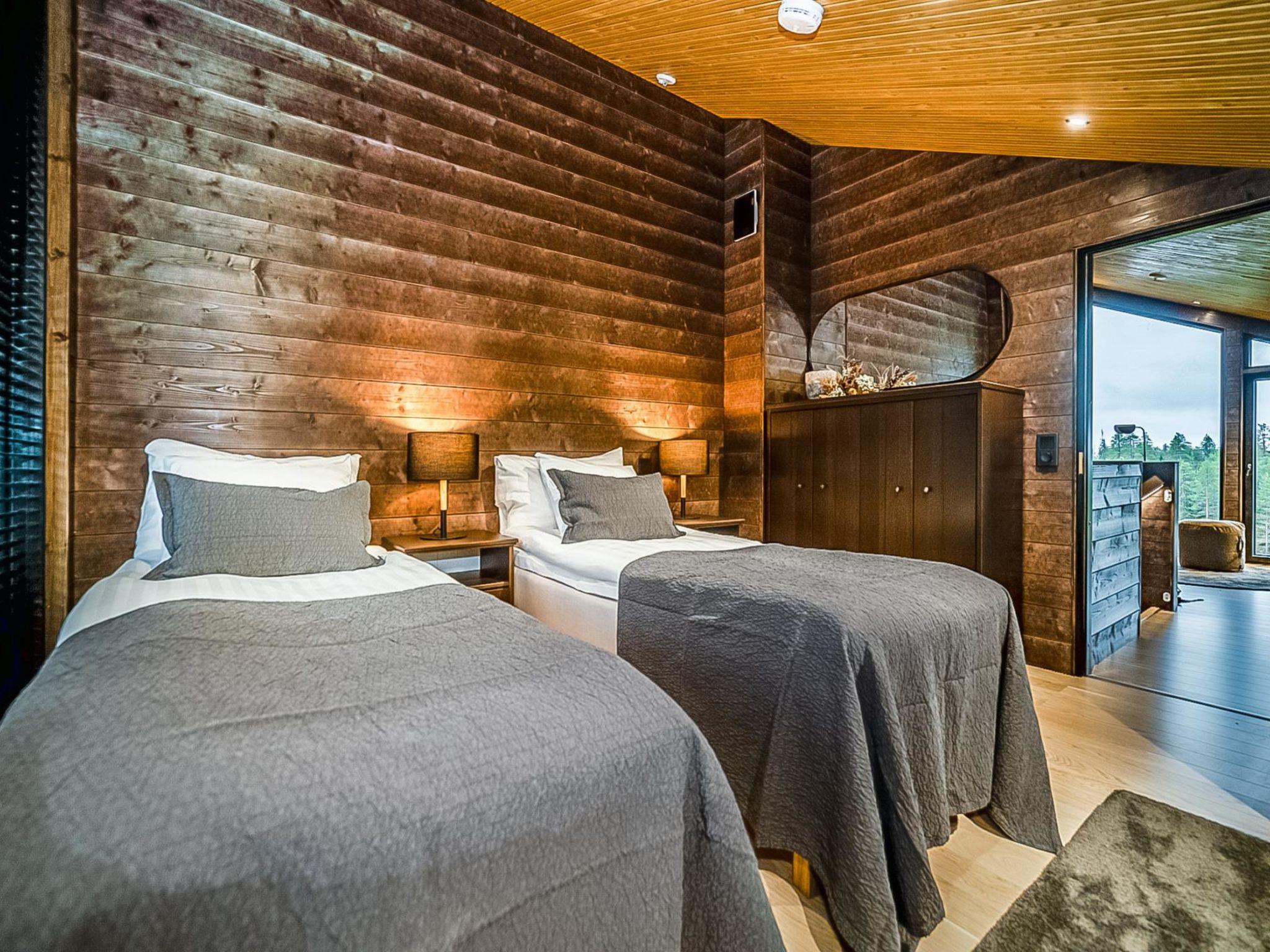 The cabin has three separate bedrooms, ensuring a comfortable and peaceful night's sleep for all guests. The two bedrooms on the ground floor feature spacious double beds, while the upper-floor bedroom accommodates three beds, ensuring ample space and comfort for everyone.