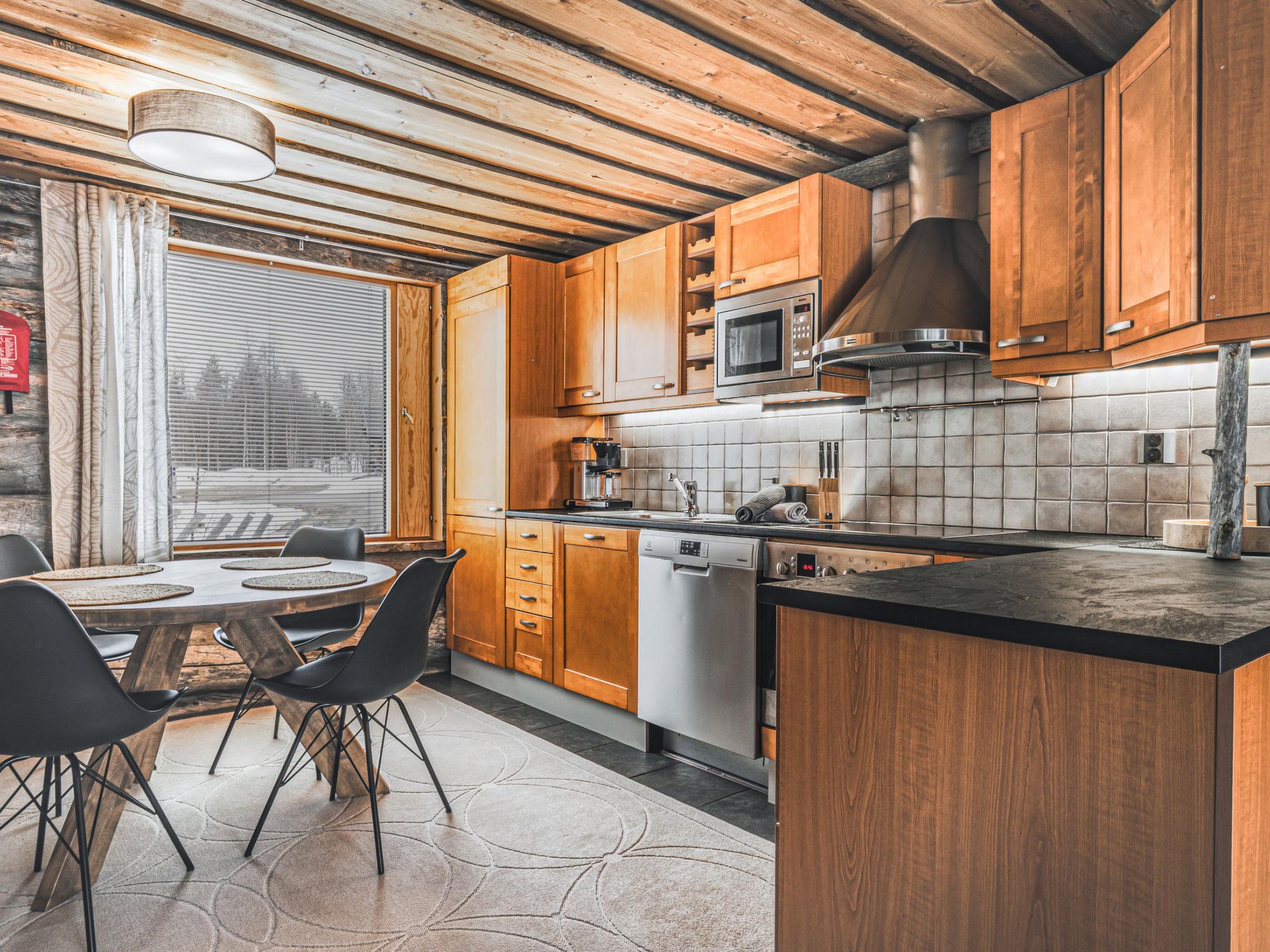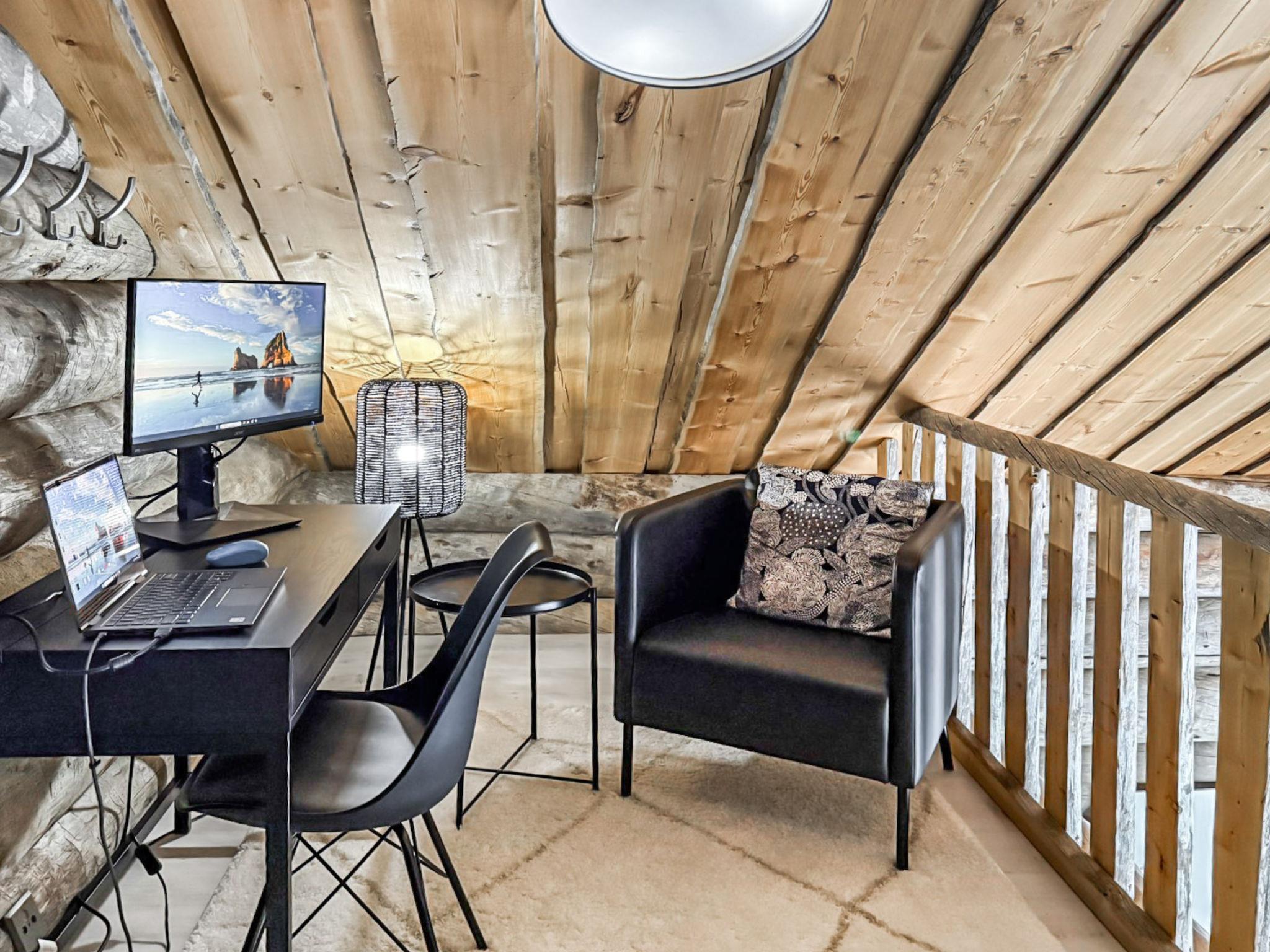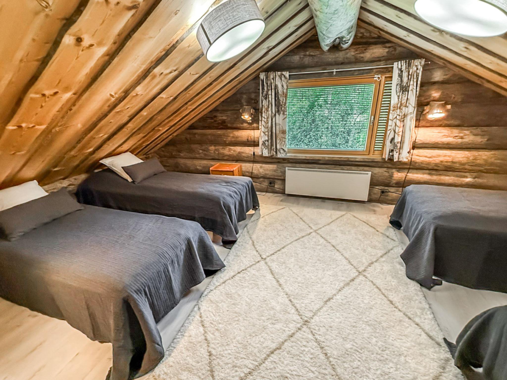 Cozy and spacious log cabin in Ruka. The property sleeps eight and was built in 2004. The property has three bedrooms, two of which are downstairs. One bedroom has a double bed 160cm, the other bedroom has two 80 cm wide beds. Downstairs there is a well-equipped kitchen and a cozy living area. Spacious washroom and sauna area. The cottage has two toilets, one of which is in the washroom and the other is separate. The washroom and sauna were renovated in 2024. Upstairs there is a bedroom as well as a small living area with a work station. The bedroom has four 80 cm wide beds.