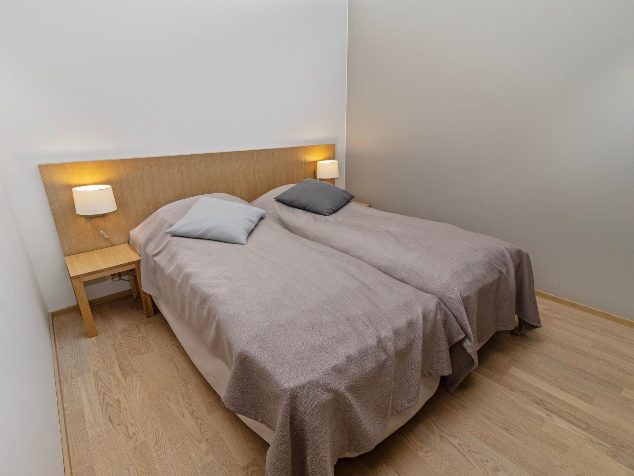 The three-bedroom apartment comfortably accommodates a family or a group of friends. One bedroom features a double bed, the second has two separate beds, and the third includes a bunk bed with a 120 cm wide lower bed. The open-plan kitchen and living area provide a welcoming space for socializing, and at the end of the day, you can unwind in the spacious electric sauna.
