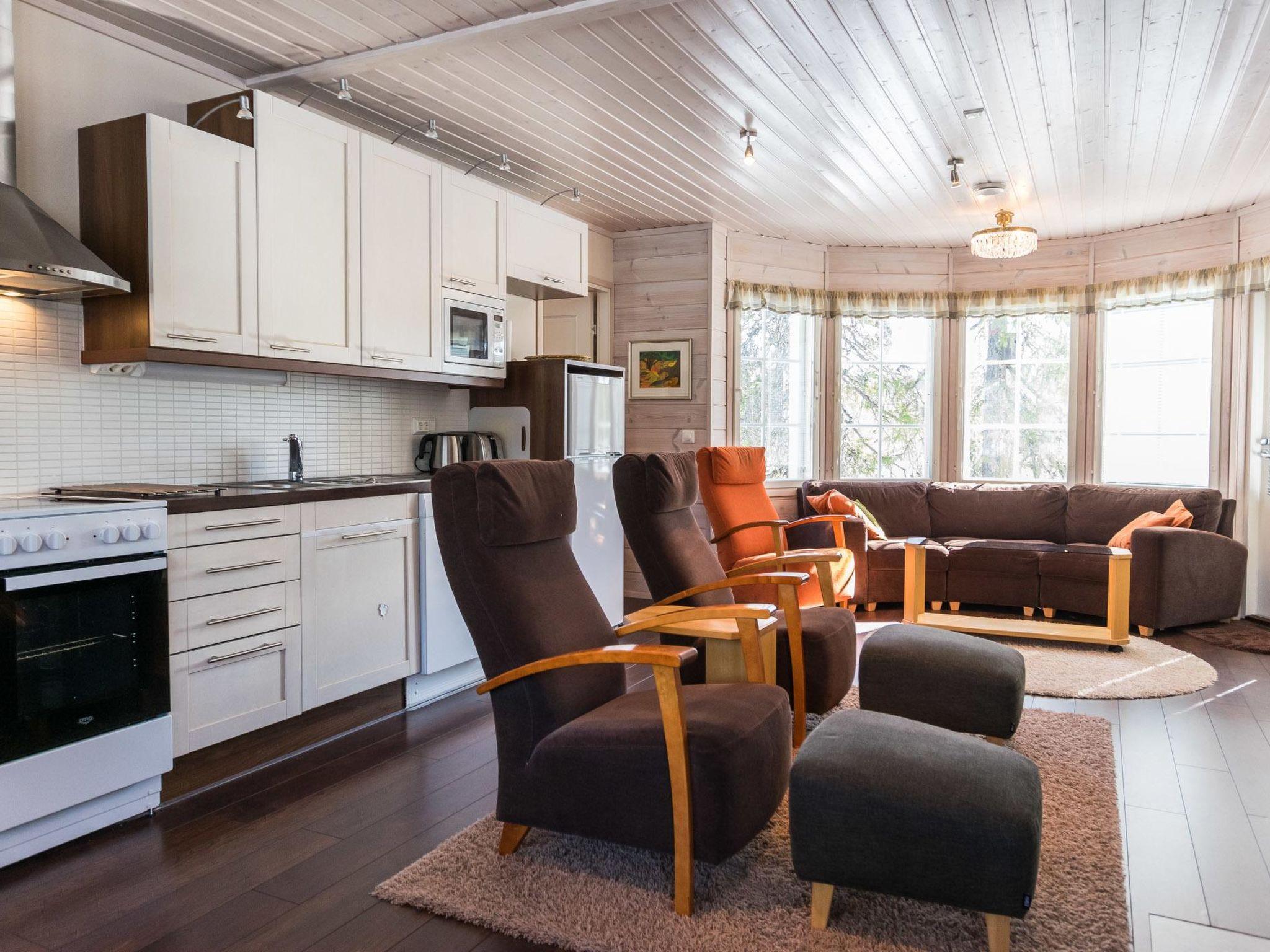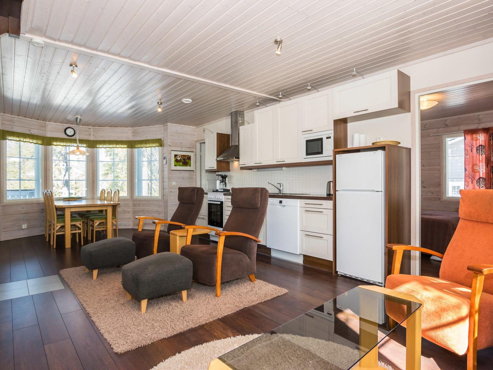 25 km north of Kuusamo, Vuosseli (Eastern Ruka) 1.2 km, Ruka village (Western Ruka) 4 km. Log-panelled cottage, built in 2006, bedrooms 1-2: 2 spring mattress beds, room on loft (floor area 40 m², height 160 cm): 4 spring mattress beds, combined kitchen/living room, electric sauna. Area 78 m², additionally loft 40 m² with low room height. Internet/4G