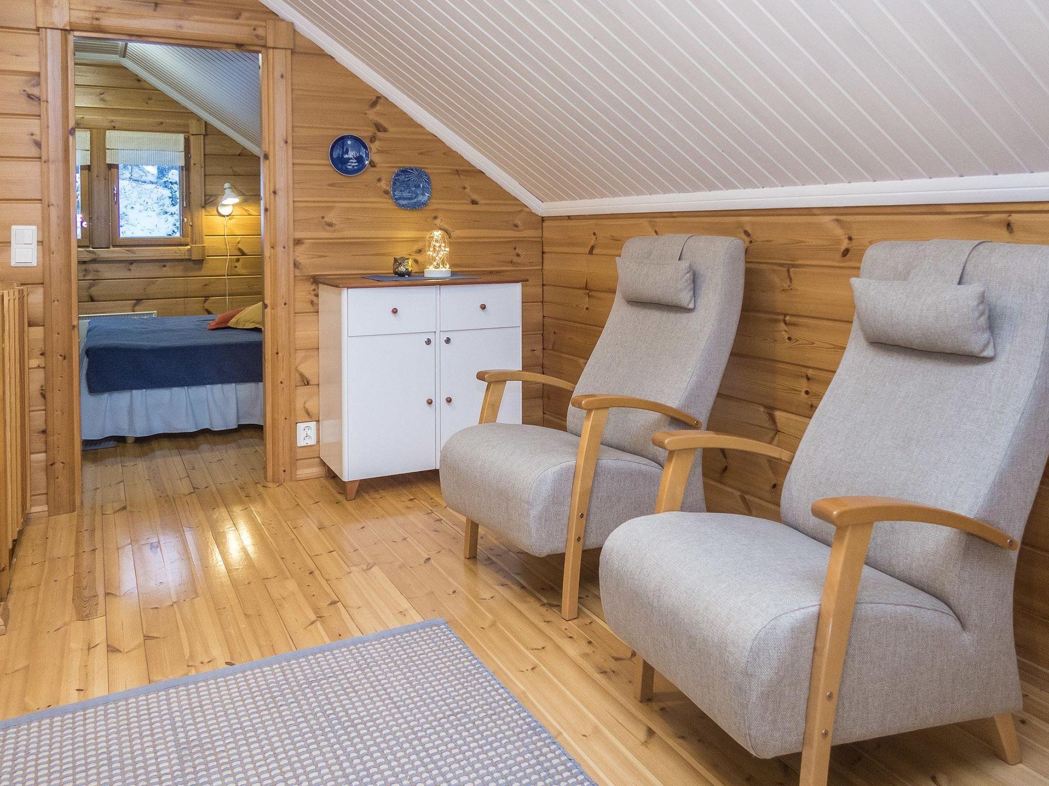 Log chalet 2004, living room/kitchen, bedroom double bed, utilities room/ dressing room, washroom, sauna (elec. stove), open porch, upstairs bedroom 2 beds (á 80 cm wide), recreation loft convertible sofa/ bed for two and balcony.