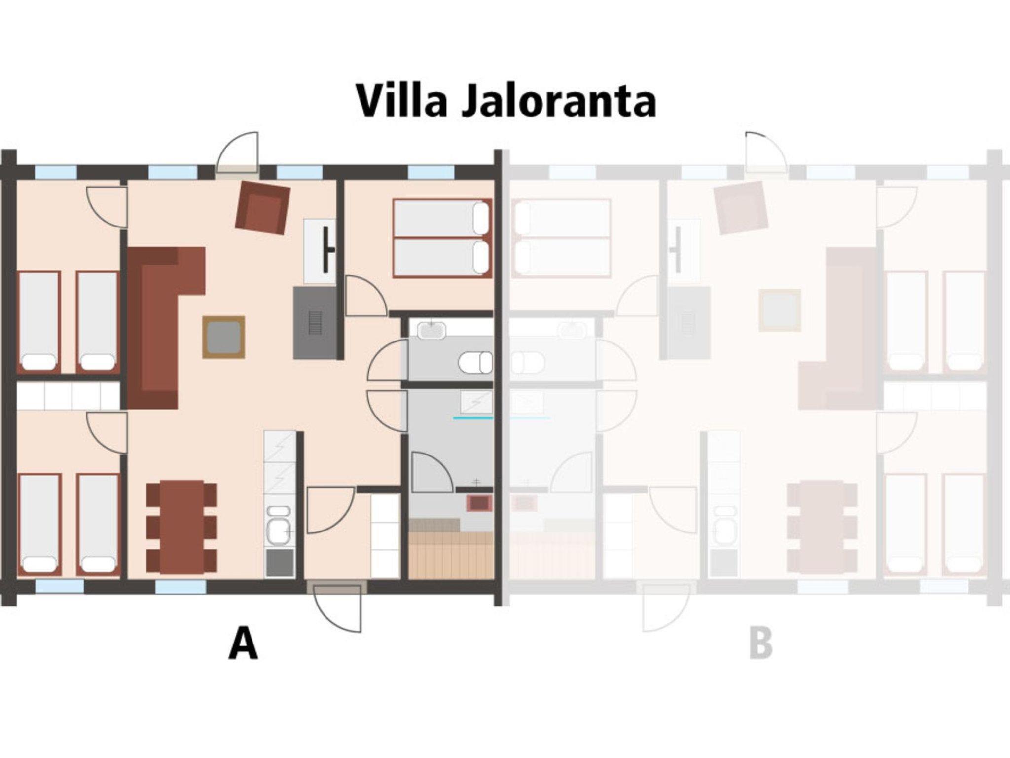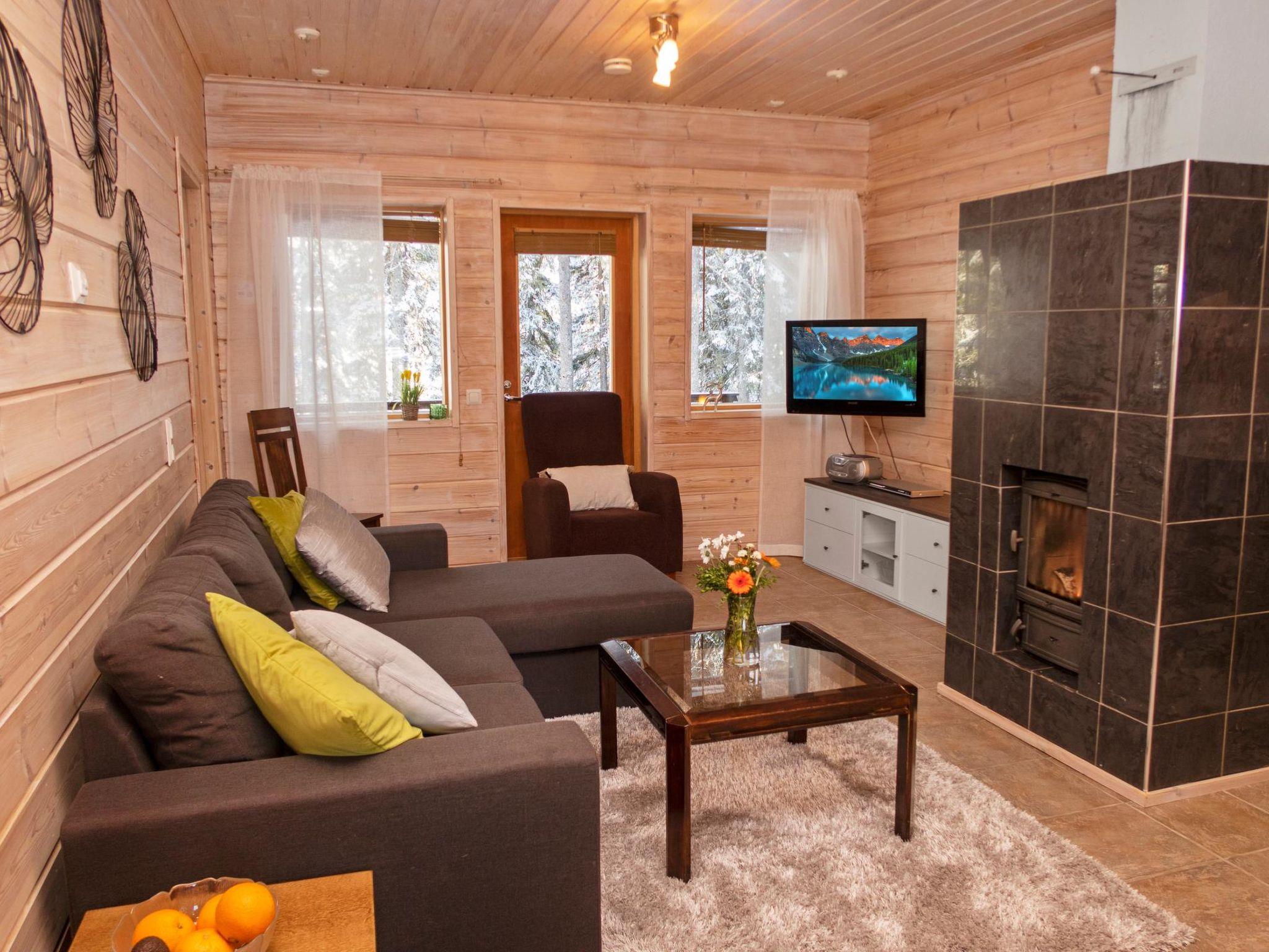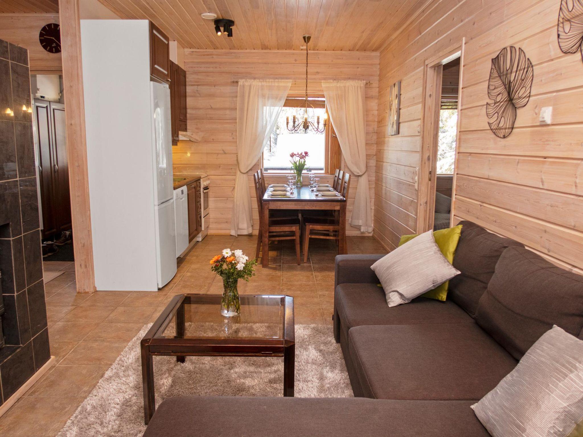 30 km north from Kuusamo, Vuosseli (East Ruka) 4 km, Ruka village (West Ruka, Ruka square) 8 km, Lake Vuosselijärvi 40 m. Semi-detached log cottage built in 2007, bedrooms 1-3: 2 beds in each, combined kitchen/living room, electric sauna.
