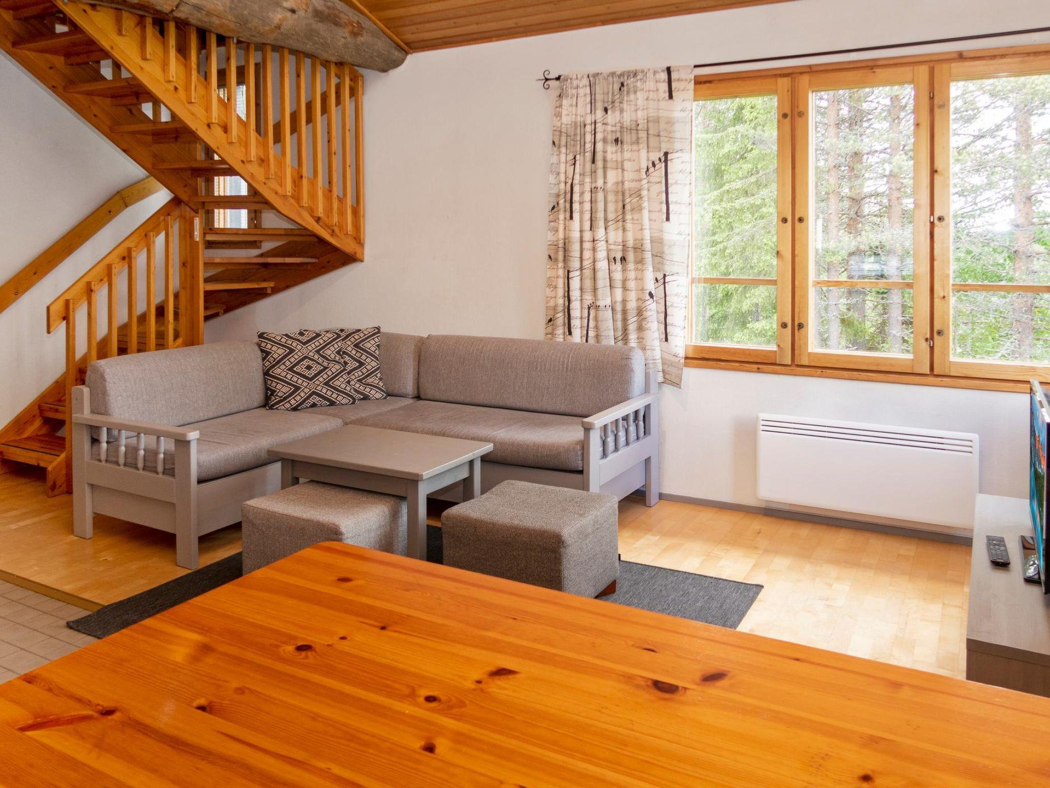 26 km north of Kuusamo, Ruka village (Western Ruka) 1.5 km. Two-storey apartment in row house, built in 1988. Upstairs: double bed and bunk bed, living room: convertible sofa, combined kitchen/living room, electric sauna. Small storeroom.