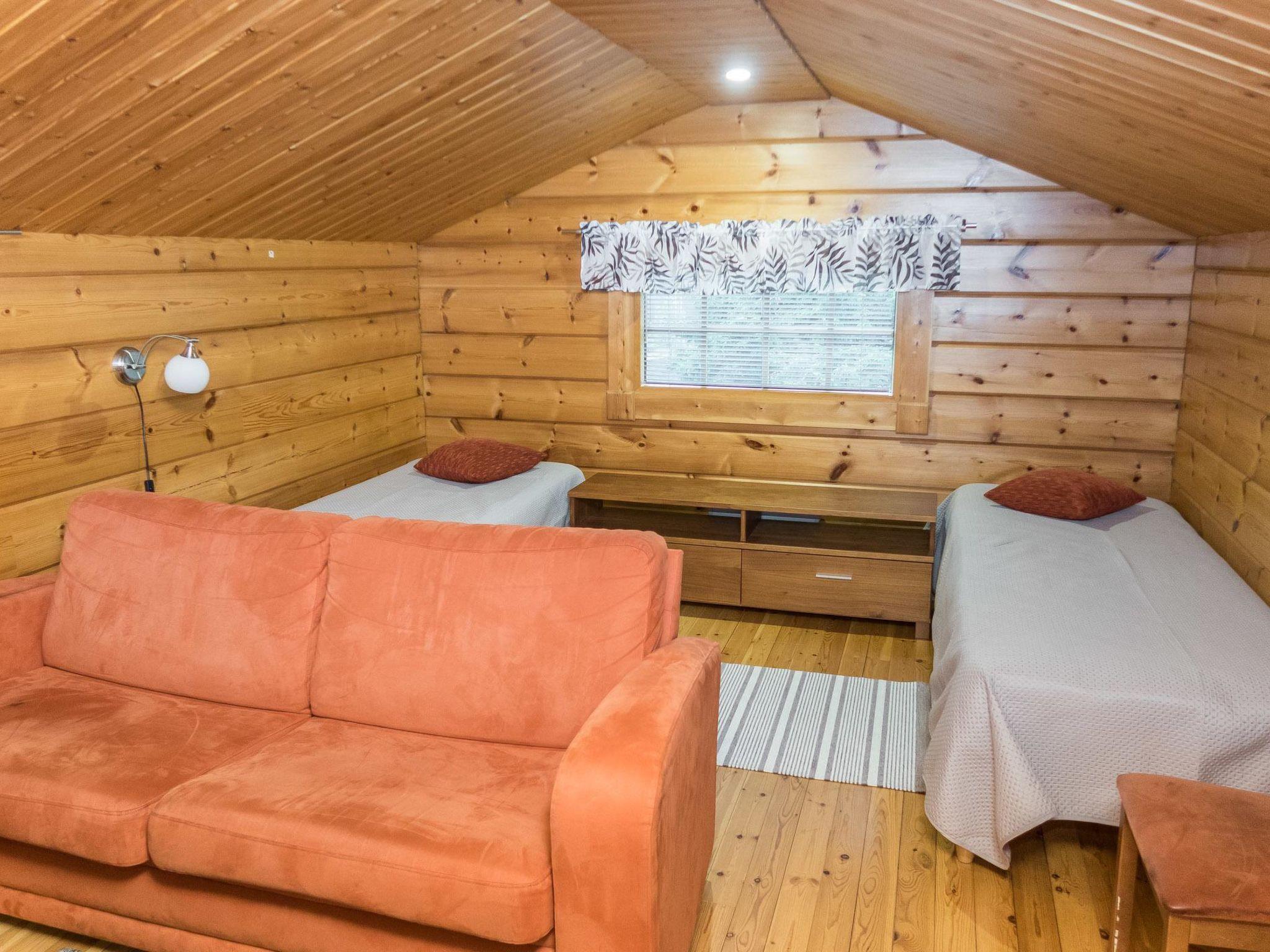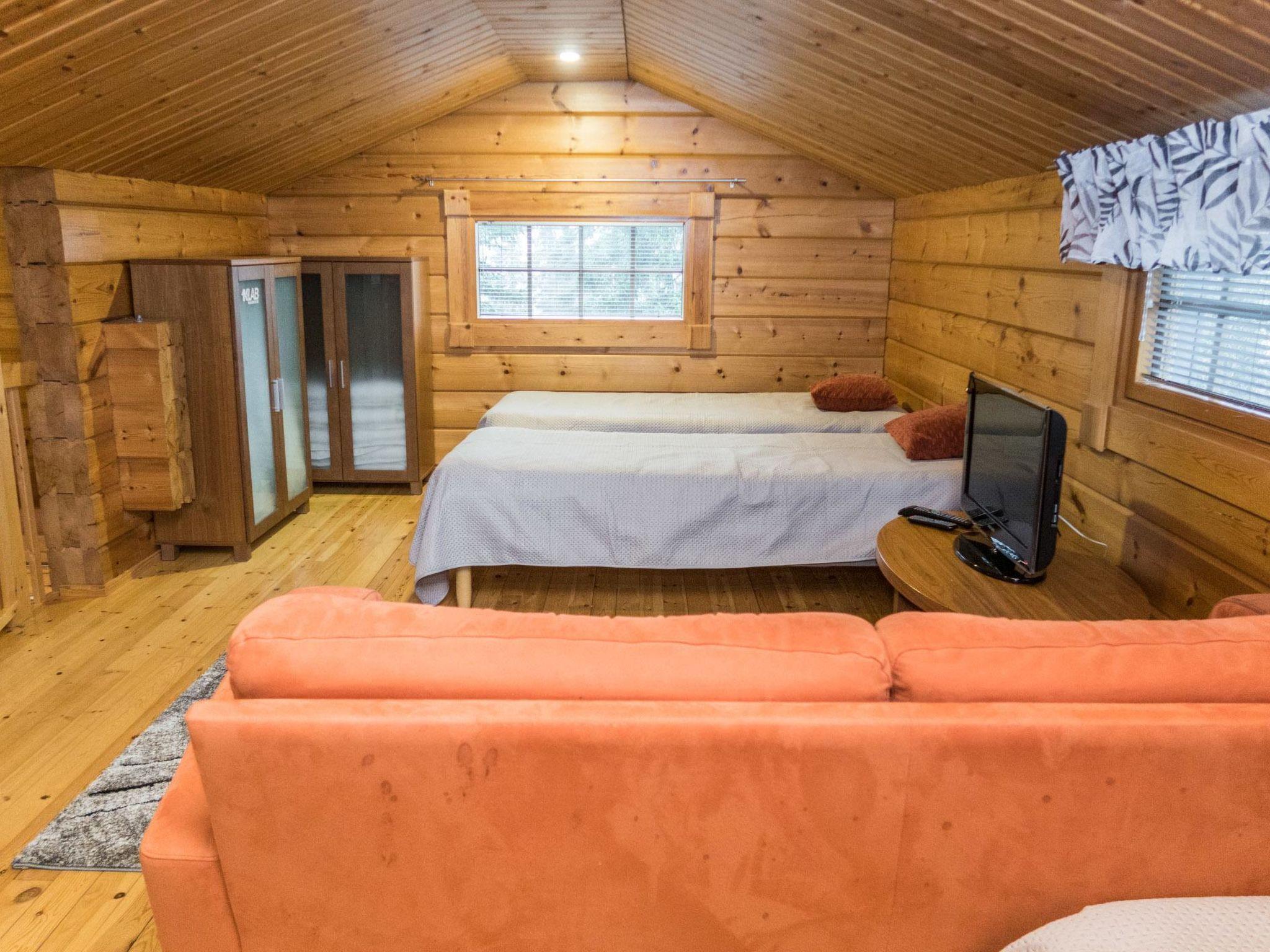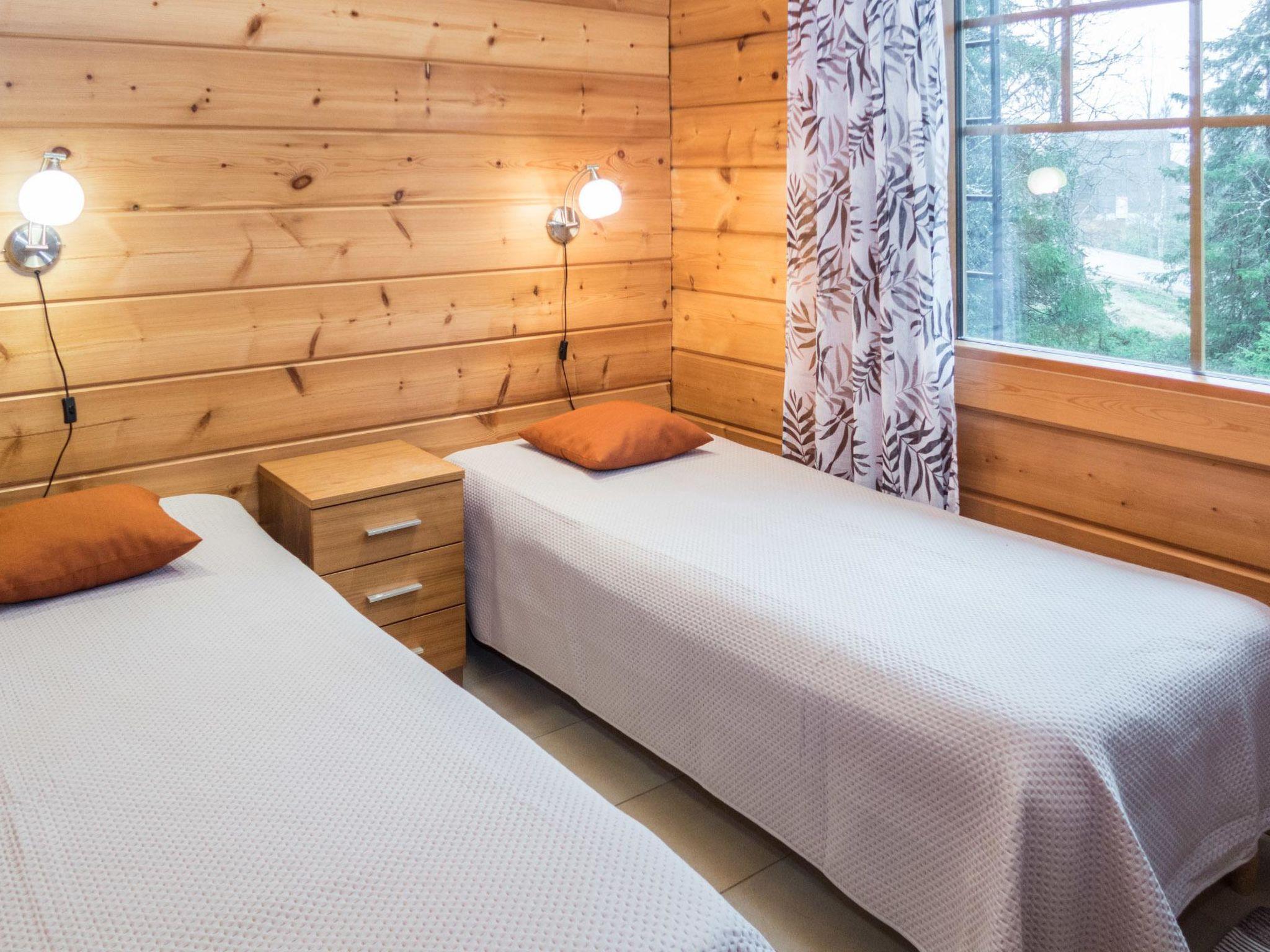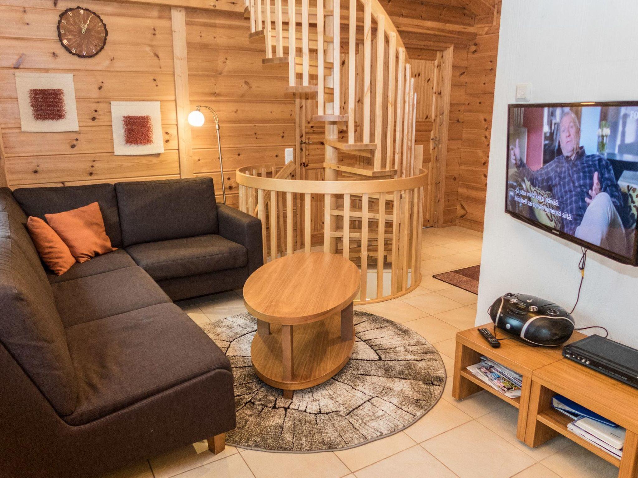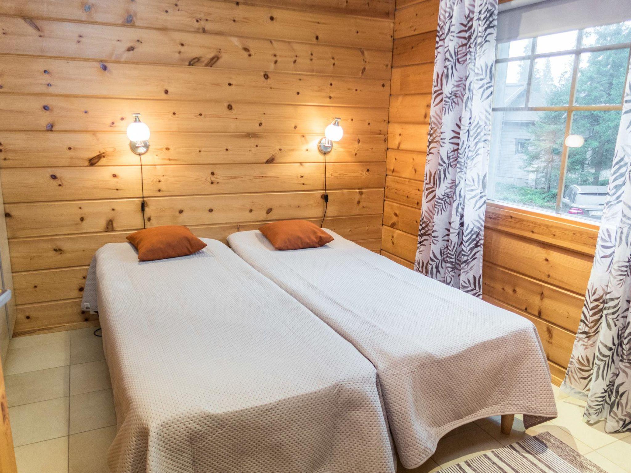25 km north of Kuusamo, Vuosseli (Eastern Ruka) 300 m. Apartment in three-storey log-built row house of three apartments (end-of-house apartment) built in 2005, bedrooms 1-4: 2 spring mattress beds, loft: 4 spring mattress beds, steep and narrow spiral stairs, bathroom downstairs, combined kitchen/living room, electric sauna. Area 98 m², loft 21 m² (loft 160 cm, partly 210 cm high).