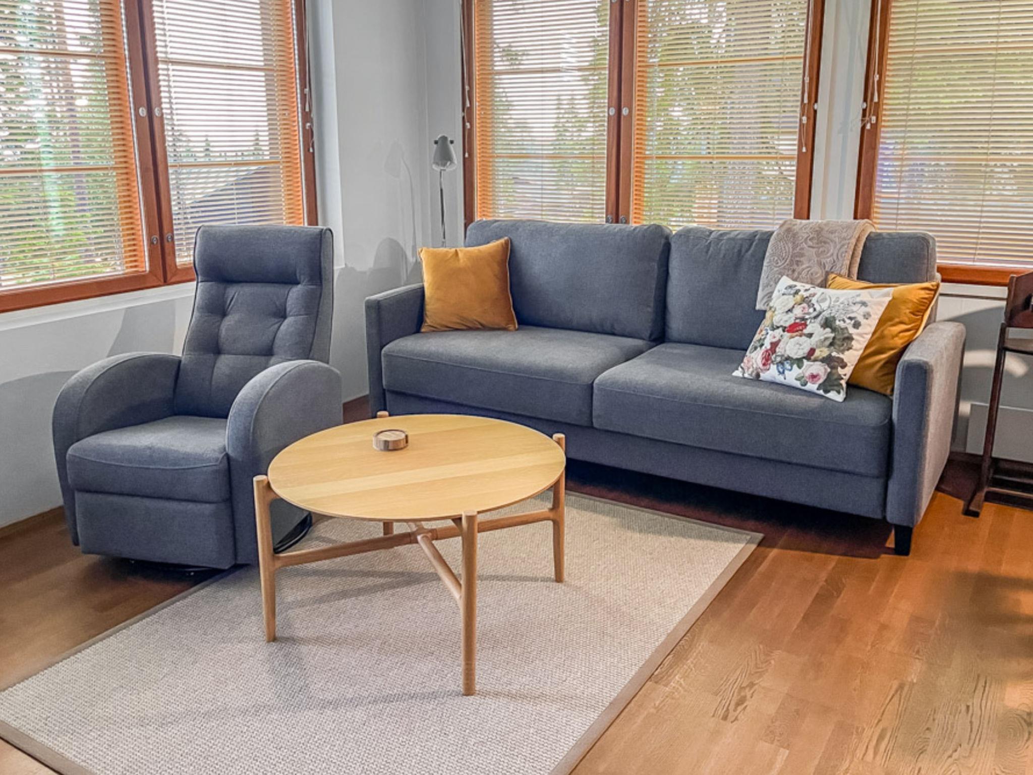 29km north of Kuusamo, Ruka village (Western Ruka) 250m. High level apartment, built in 2004 (renovated in 2012), bedroom: 2 beds (possible to make a double bed), extra mattress, living room: convertible sofa for two, combined kitchen/living room, electric sauna, travel bed for child.