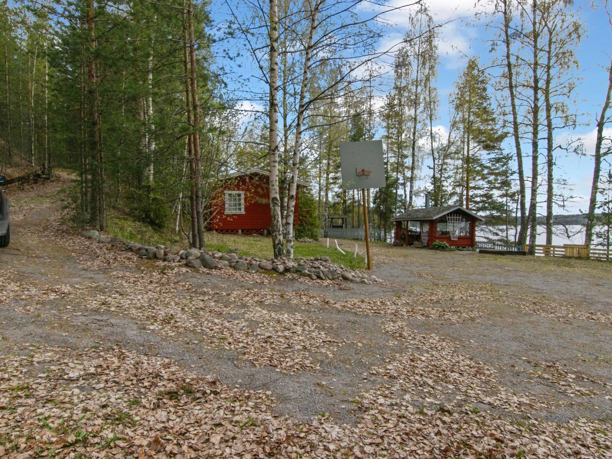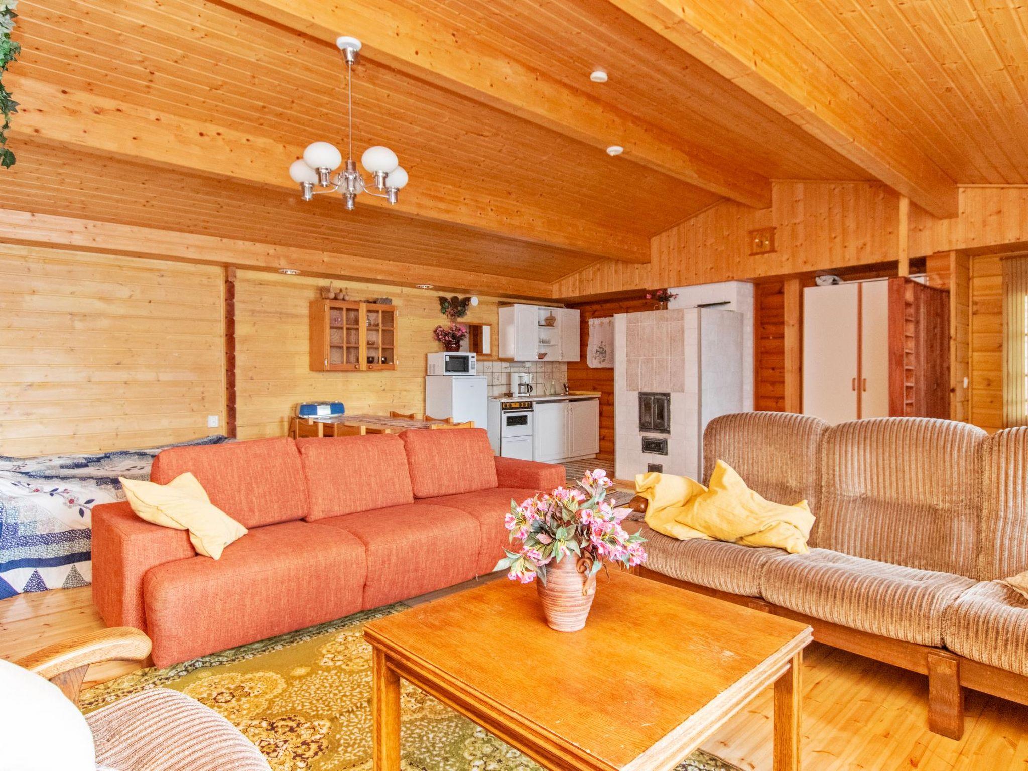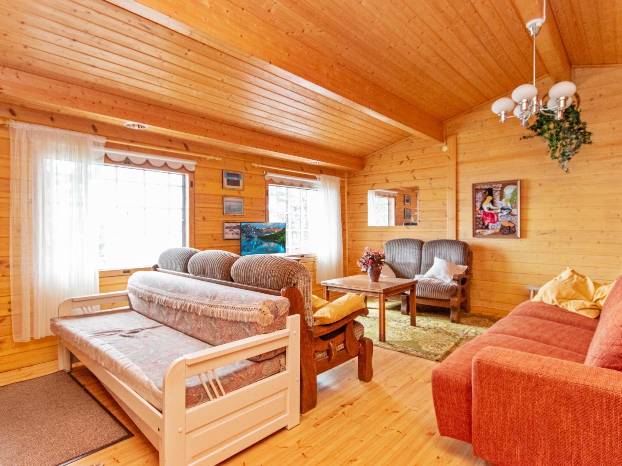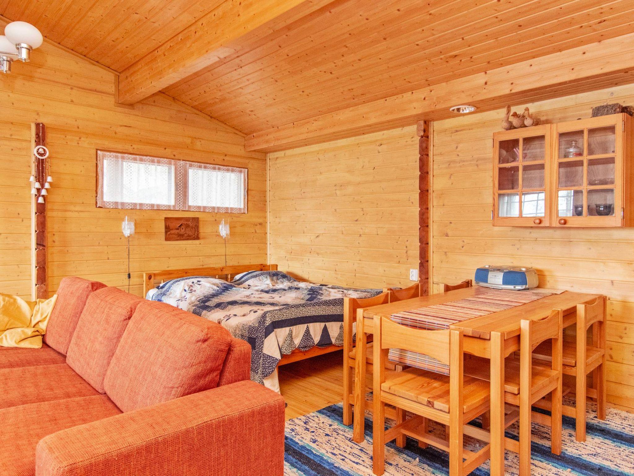 "Log cabin" (65 m²) 1985, partly renovated 2006, large living room with double bed and convertible sofa/double bed, fireplace, mini kitchen, sauna, washroom shower and hot water cauldron (for heating lake water), dressing room, toilet, terrace.