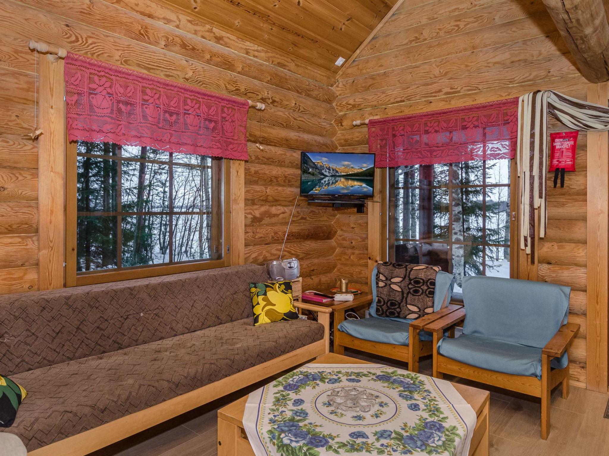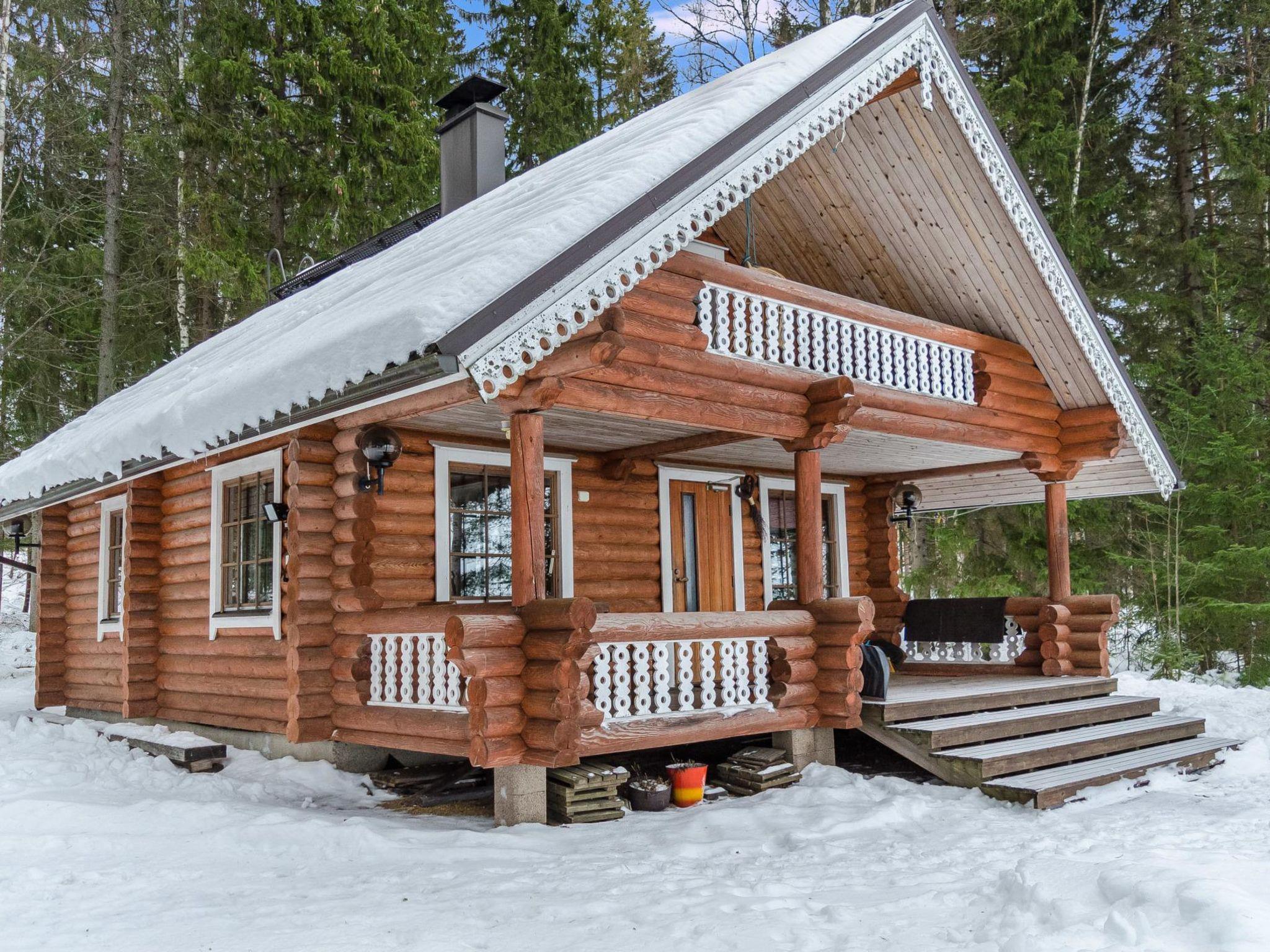 118 km to the north of Joensuu, 20 km to the west of Lieksa. Lake Pielinen 30 m (871,2 km²), West facing shore with sandy bottom, own shore, own rowing boat. Log cabin 1996, living room with convertible sofa, kitchen, bedroom with double bed, sleeping gallery (16 m²) with 3 mattresses, terrace, balcony, separate wood-heated sauna.