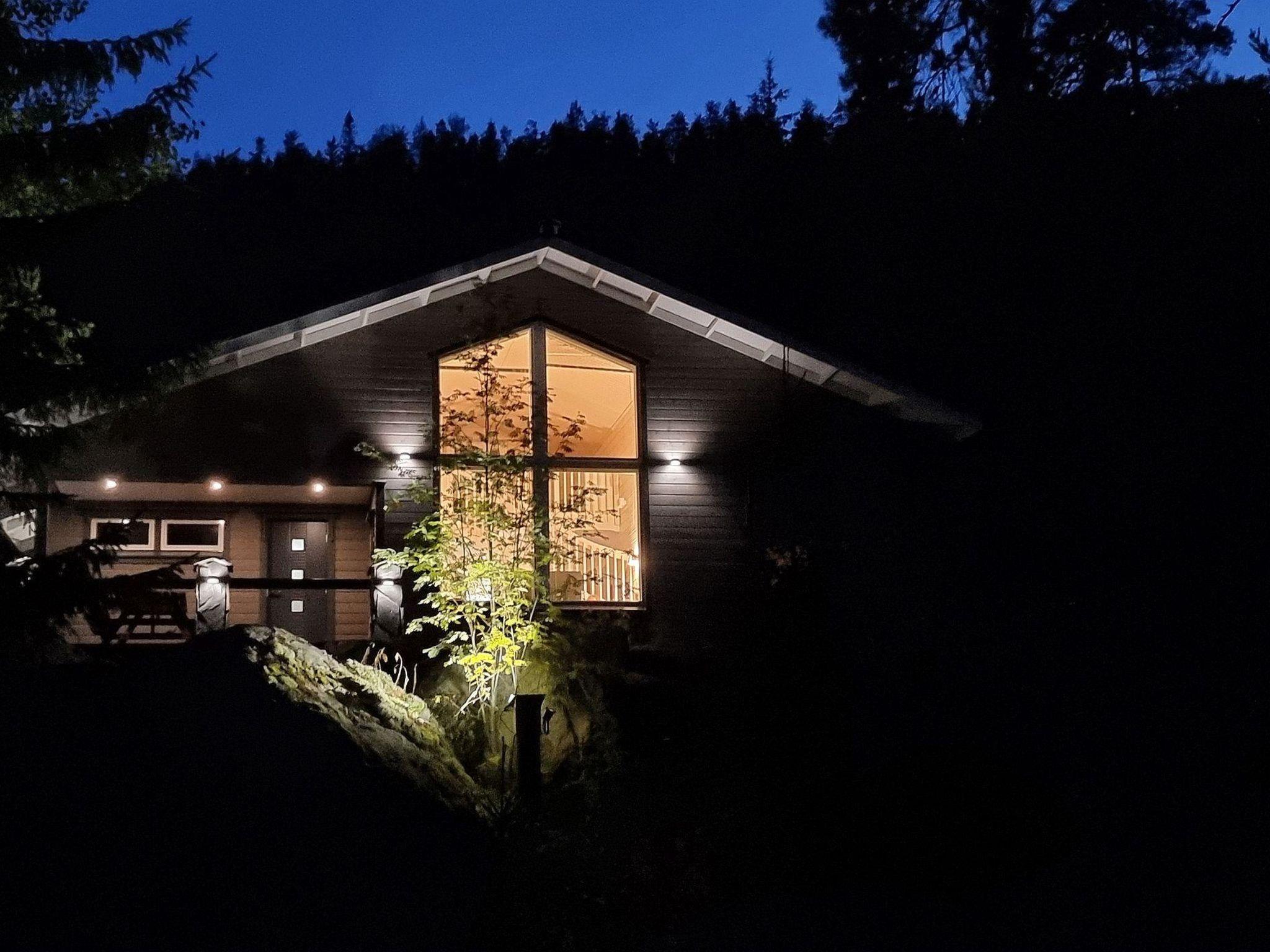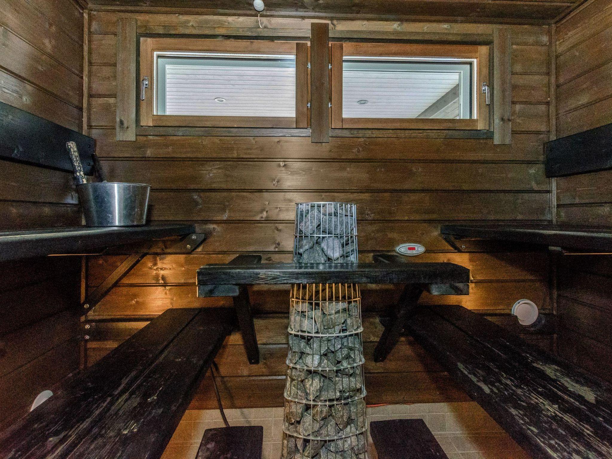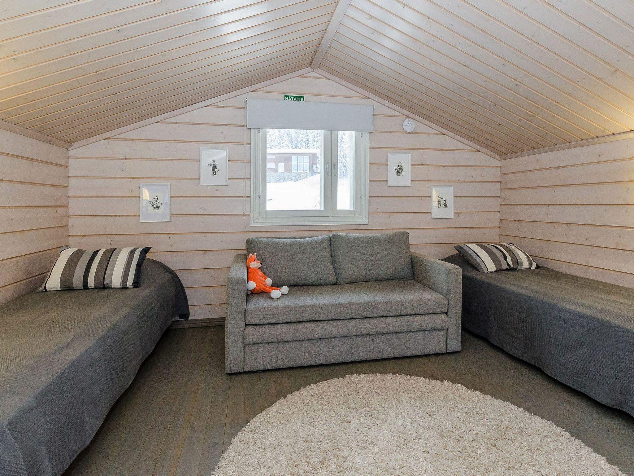 Wooden cabin, built in 2013. Living room/kitchen, two bedrooms on the ground floor, each with double beds. The loft has 2 beds and a pull-out sofa for 1 person. There is also a dressing/laundry room, washroom with a hydro-massage bath, electric sauna, open porch, and a terrace.