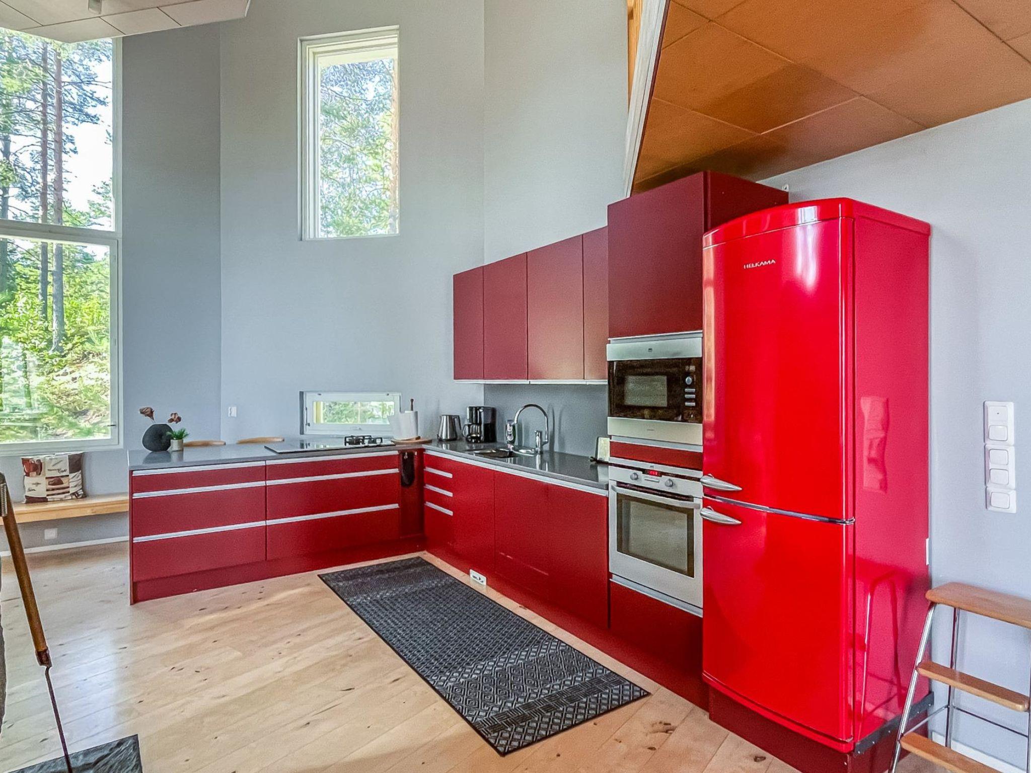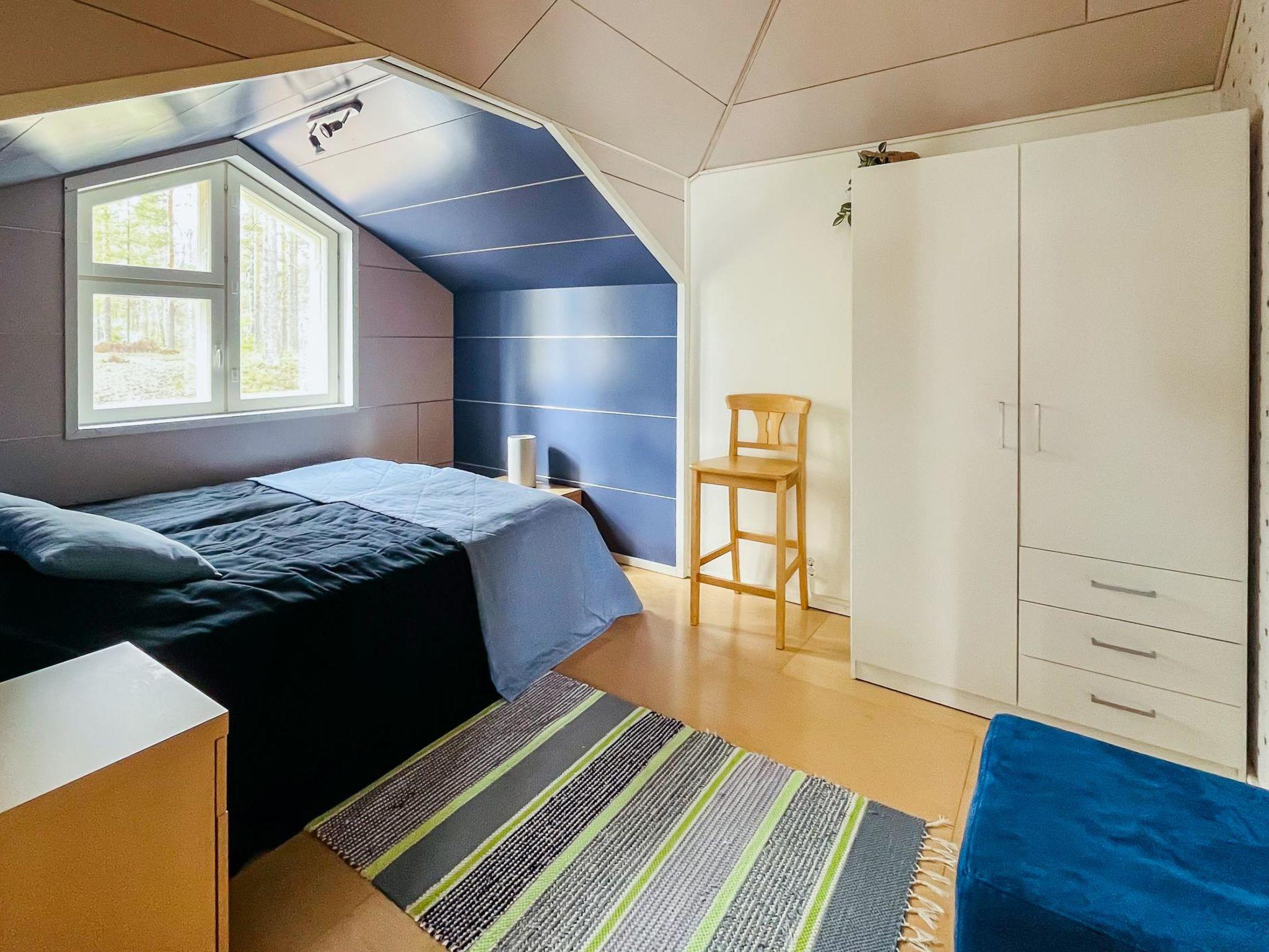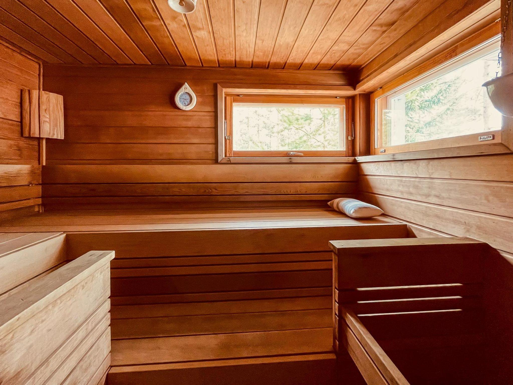 The well-equipped kitchen has 2 induction hobs, 2 gas burners, and an electric oven. For enthusiastic cooks, there is also a wood-fired baking owen by the fireplace, which you can use also as a pizza owen. The living/dining area has a smart TV, which can be used to receive Finnish TV channels as well as various streaming services and media libraries. The bedroom on the ground floor has 2 single beds and the three bedrooms on the upper floor each have 2 beds. The beds on the upper floor are set up as double beds but can also be separated and used as single beds. All bedrooms are equipped with a wardrobe. Upstairs there is also a lounge and a roof balcony with breathtaking views over the Pielinen. The TV upstairs is not connected to the terrestrial antenna, but has HDMI connections so you can connect the vacation home's Blu-ray player or your own device (e.g., laptop, game console). 4G Wi-Fi is available in the house. The sauna is electrically heated and has windows with beautiful views of the forest and the Pielinen.