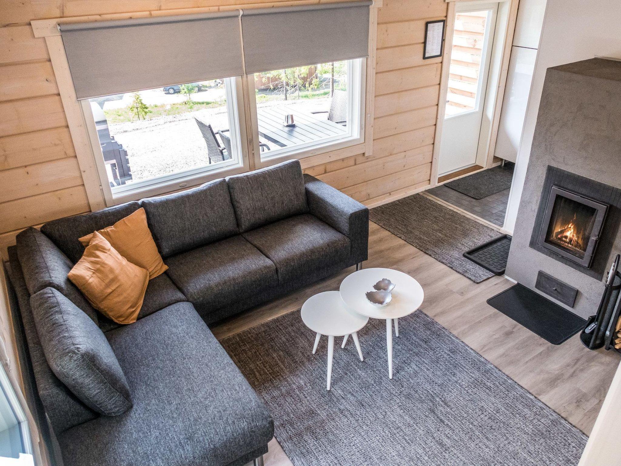 The living area of the cabin is 59 m², including the loft. Living room/kitchen, dining group for 5, heat storing fireplace. On the ground floor, bedroom with double bed, 3 x 80 cm wide beds in the loft. Washroom/WC, wood-burning sauna stove in the sauna.
