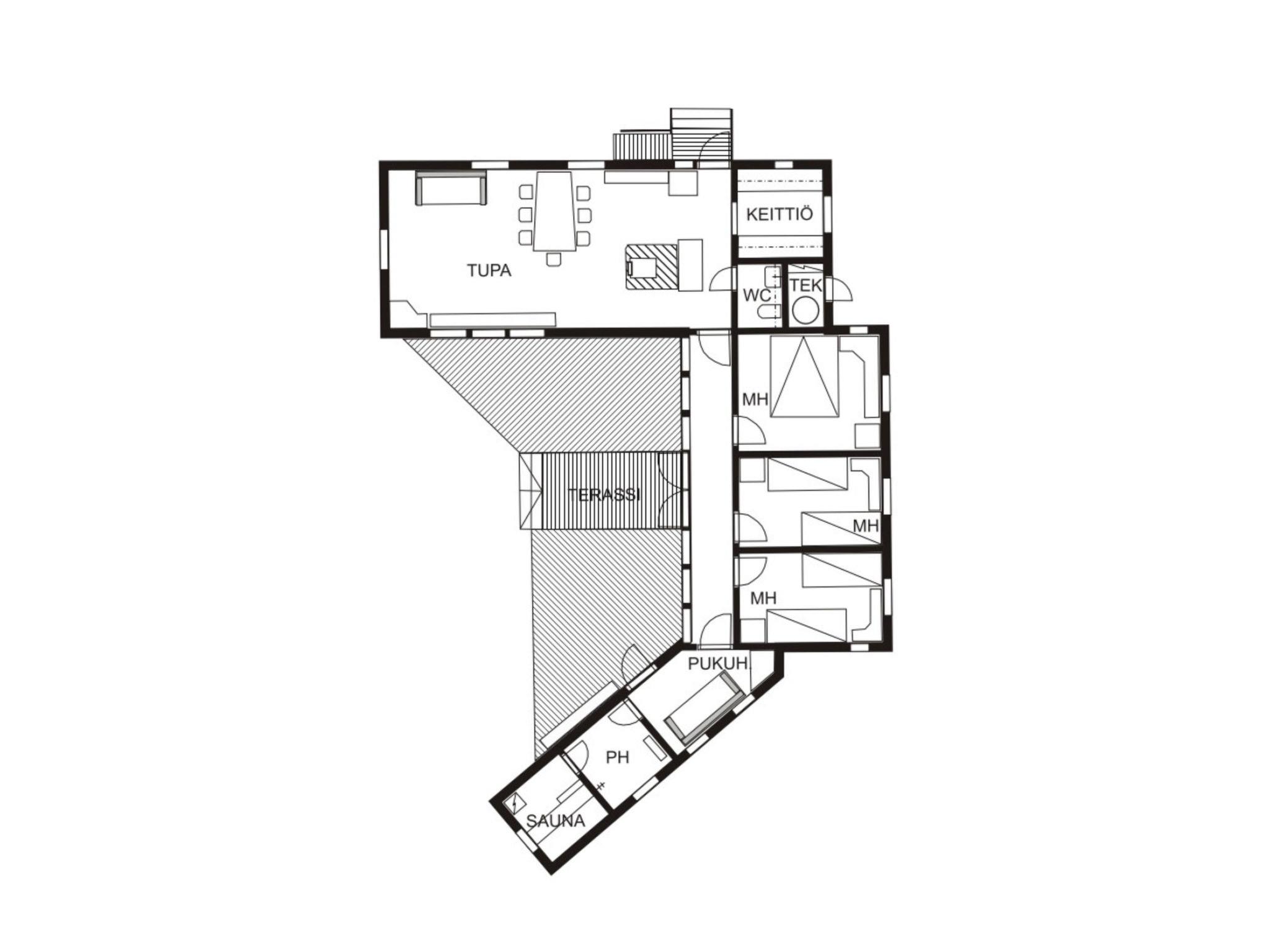 This planed log cabin was built in 2001 and includes a living room, combined kitchen/living room, and a bathroom with a toilet. There are three bedrooms along the hallway, each with two beds. The cabin also offers a dressing room, a shower room, and an electric sauna. A large and sheltered terrace is located at the back. An air source heat pump provides climate control.