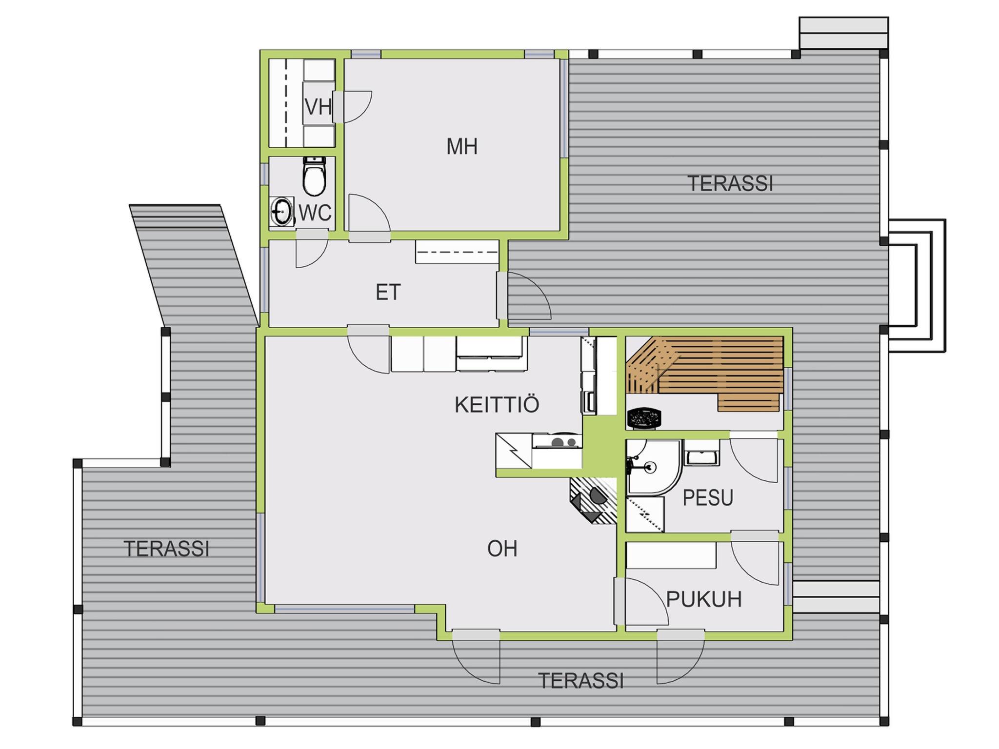 Main cottage build 1970, completely renovated 2003 (68 m²). Living room 2 convertible sofas/bed, bedroom 2 beds, hall, large open porch round cottage. Sauna in cottage (wood-fired stove), washroom (shower), dressing room.