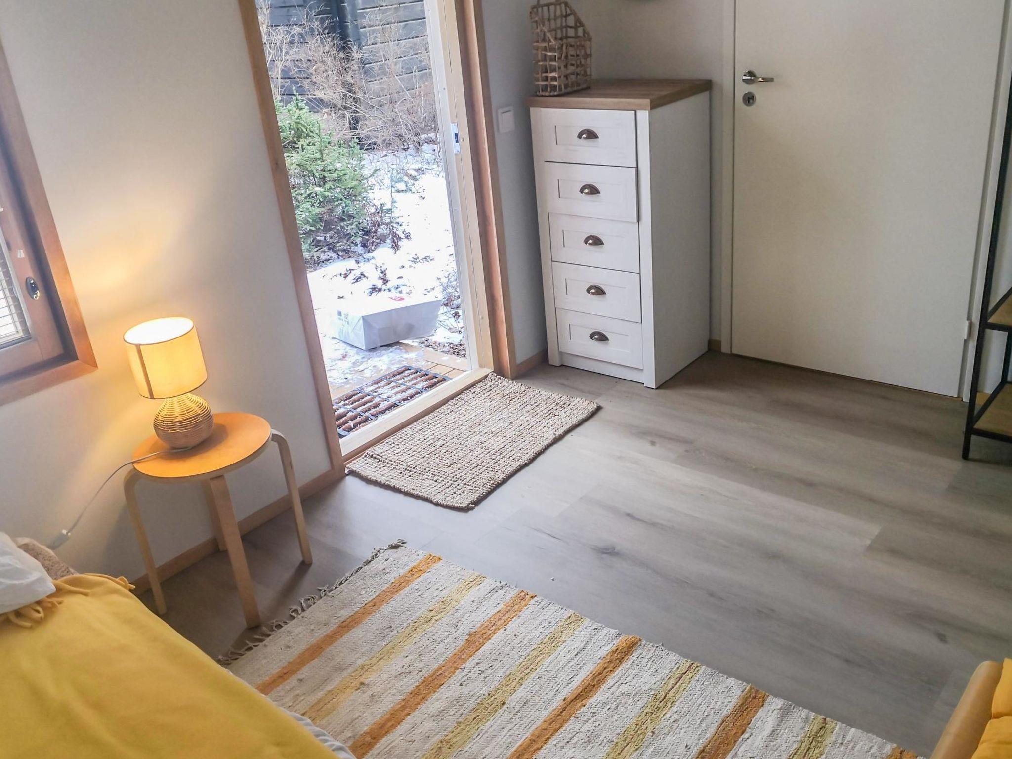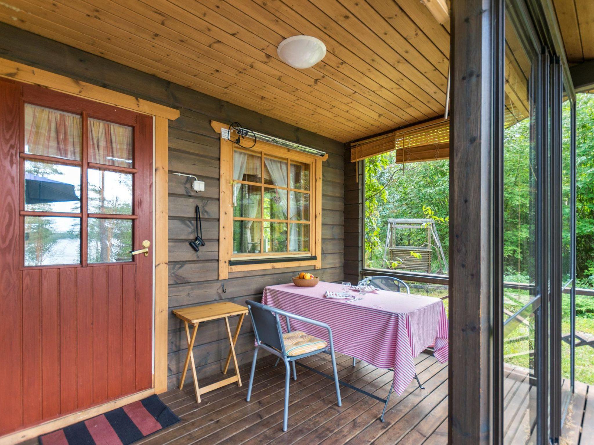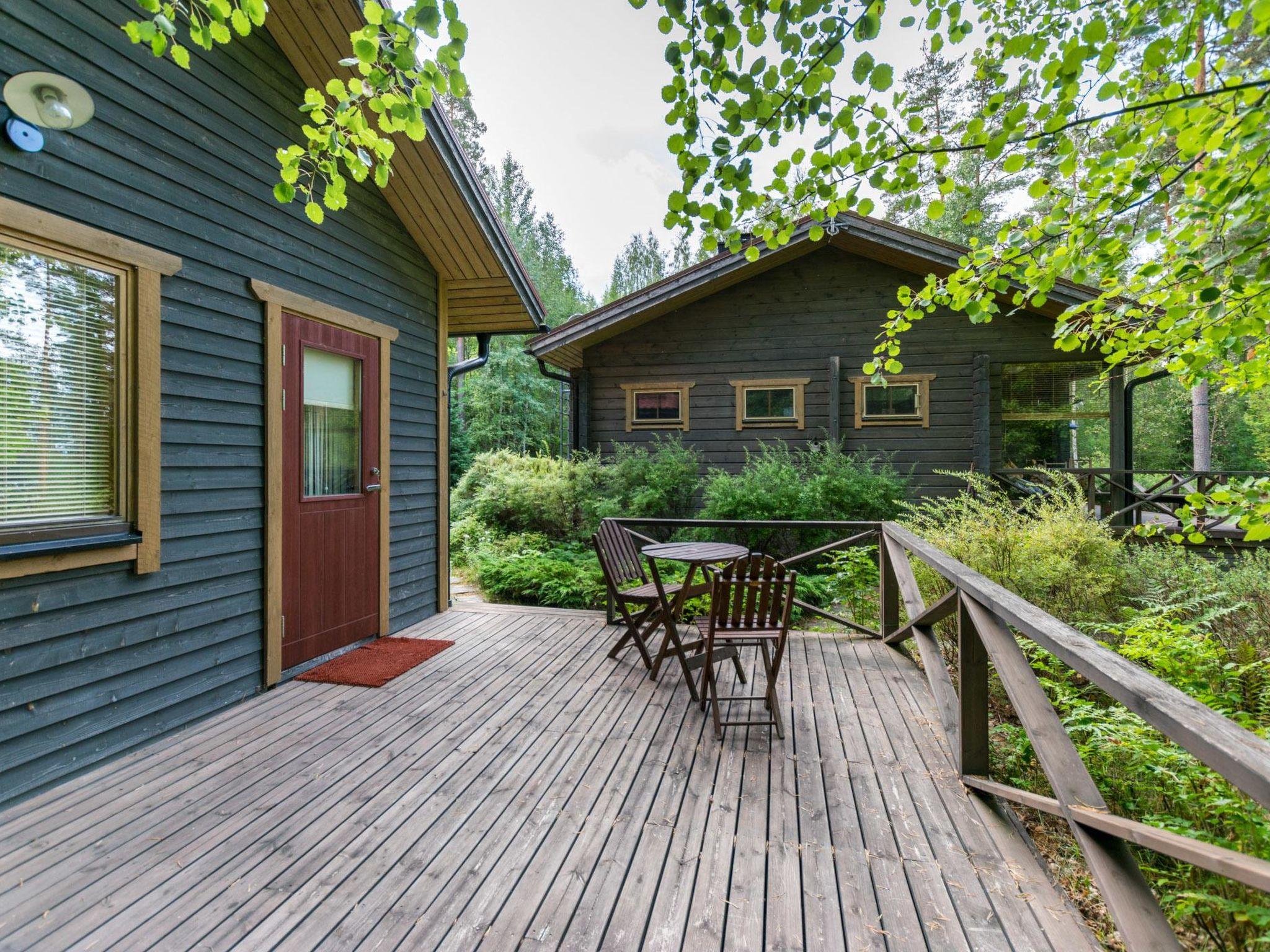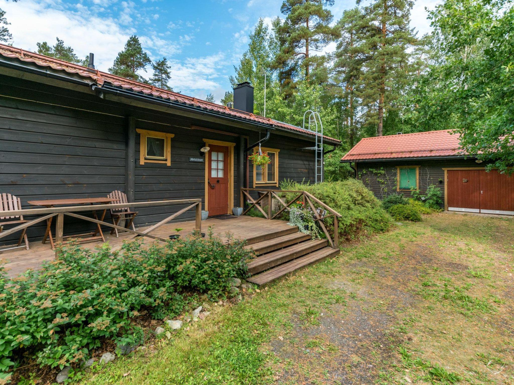Log cottage 2002, kitchen-living room, bedroom with double bed, small bedroom with 1 bed, sauna (wood-burning stove), washing room (shower), dressing room, toilet, hallway and large partially-covered terrace spaces.