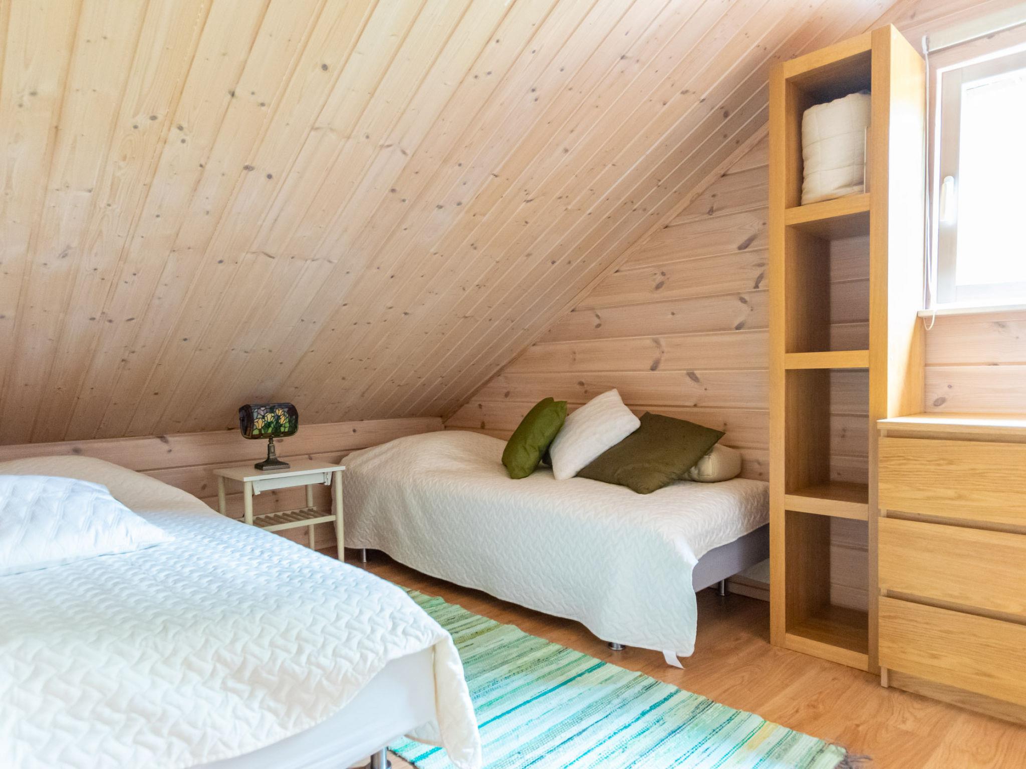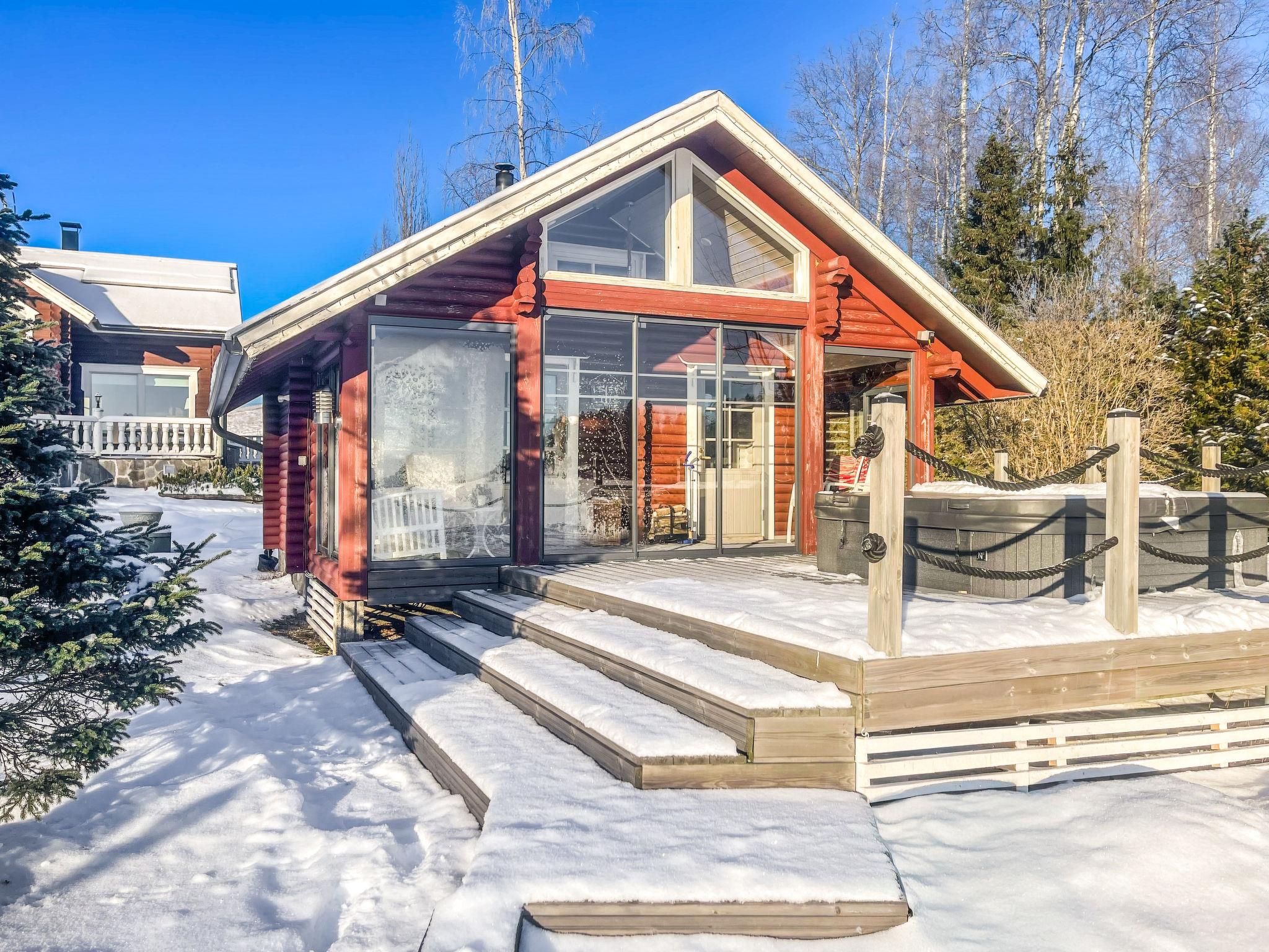 Located 65 km from Helsinki, Lake Hiidenvesi 30 m, log-built villa (2004), five bedrooms, one with a double bed and the others with two beds per room. The well-equipped living room/kitchen has a large dining table and windows offering views of the yard and lake. The living room has a TV, sofa set, and heat-storing fireplace. The villa has a WC on both the ground and upper floors. Electric sauna and washroom with two showers. The lakeside sauna has a third shower.