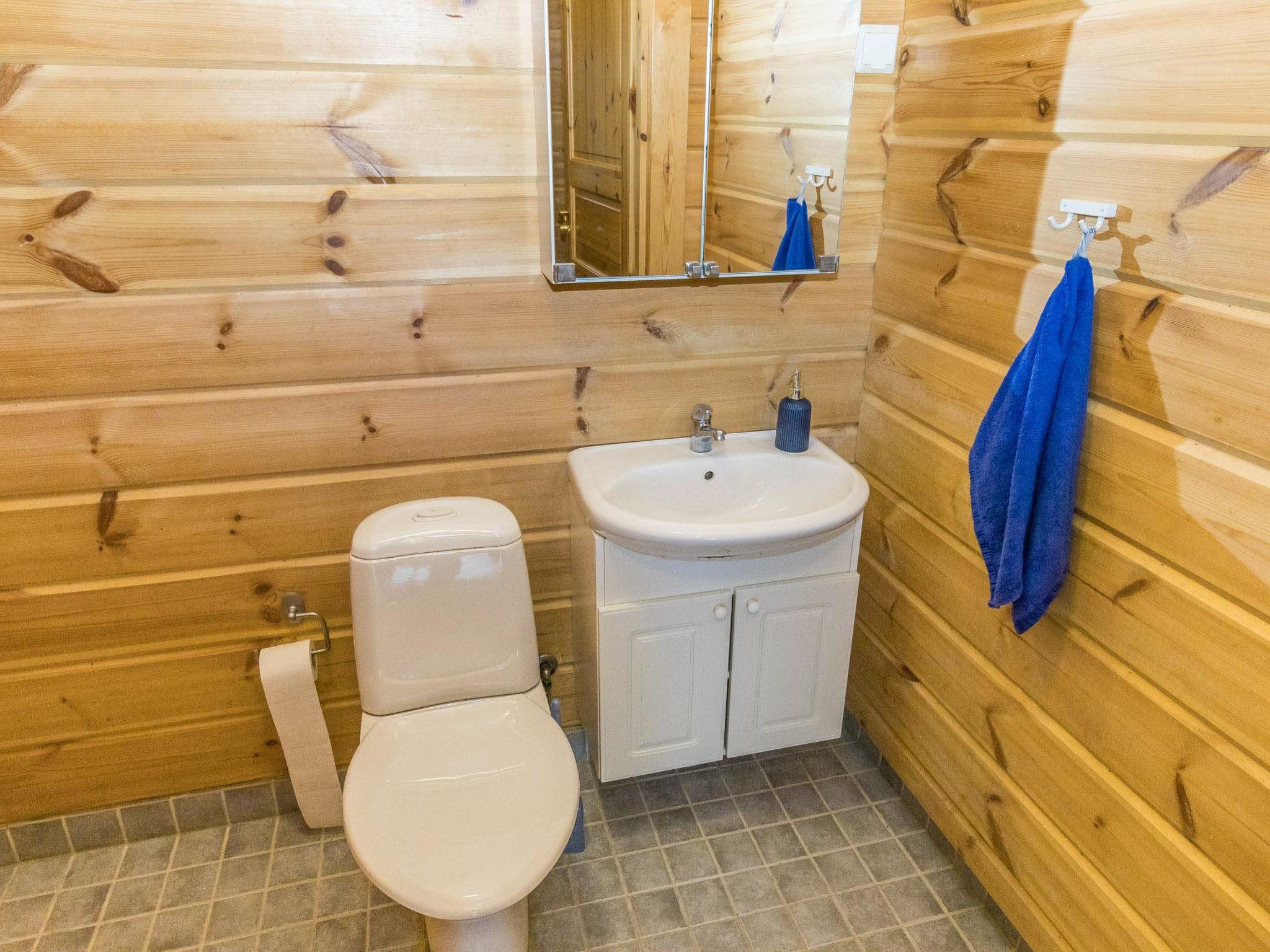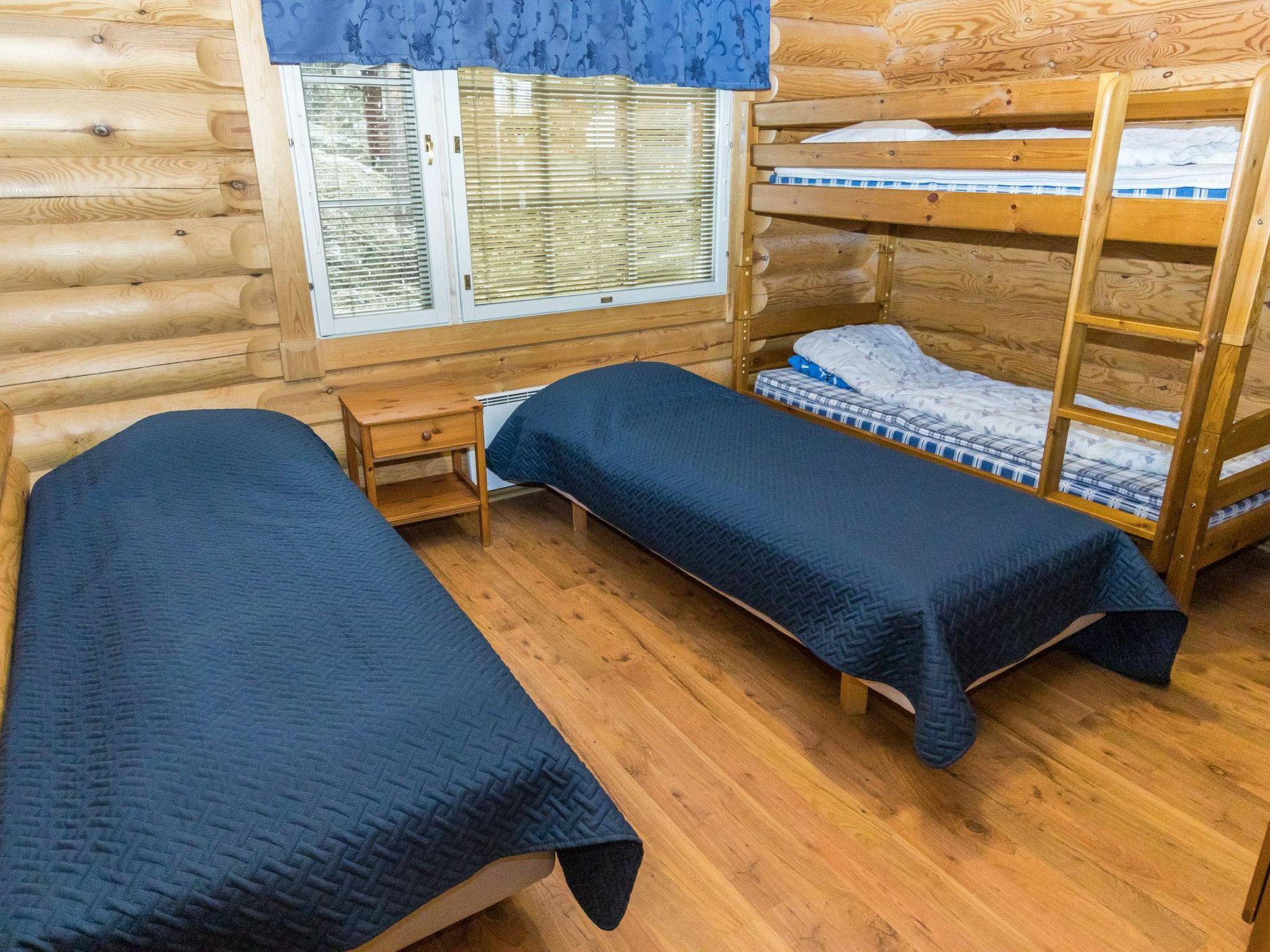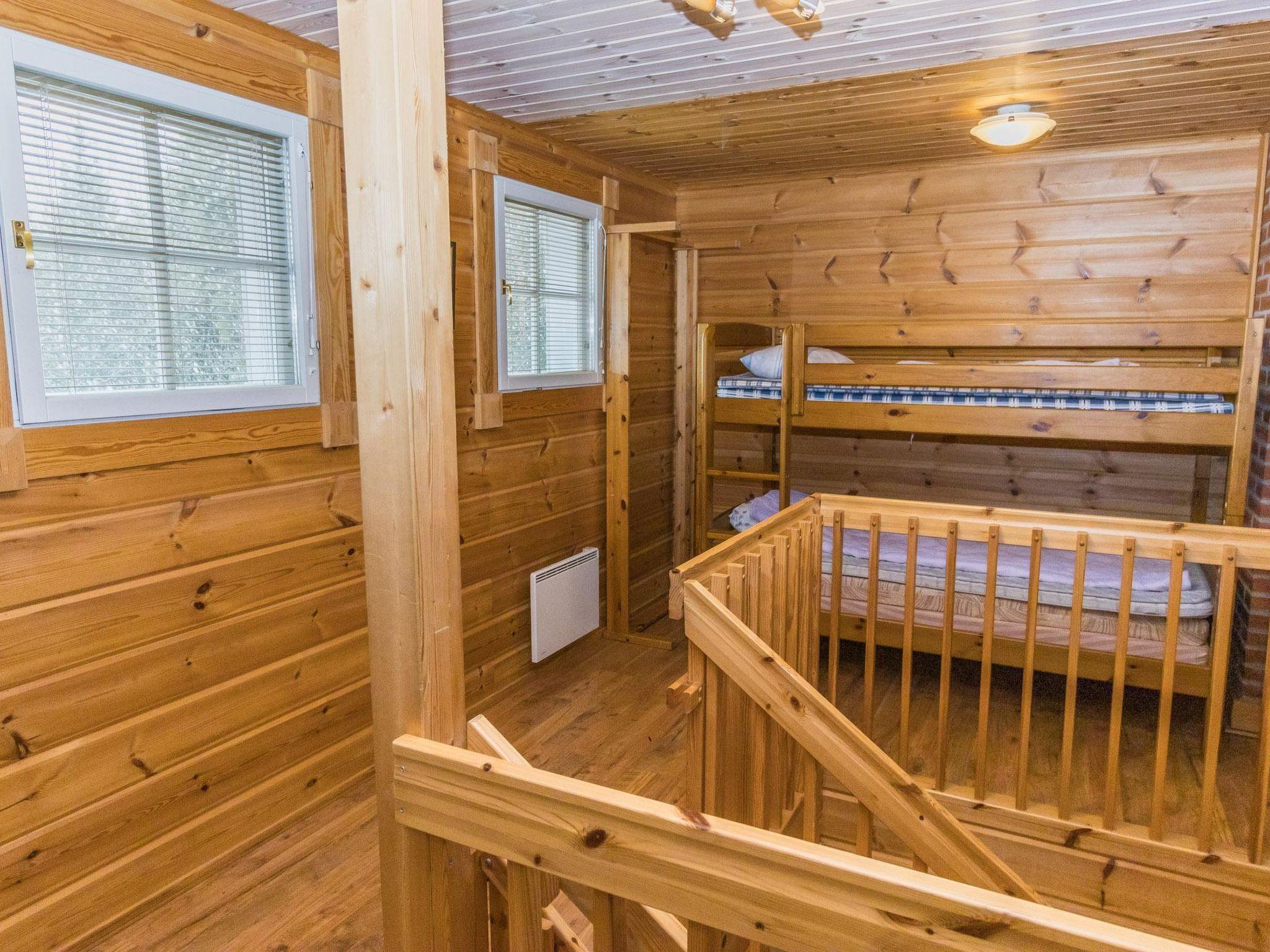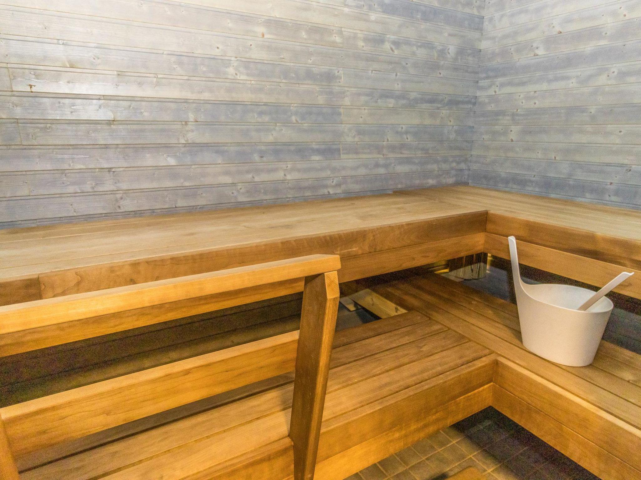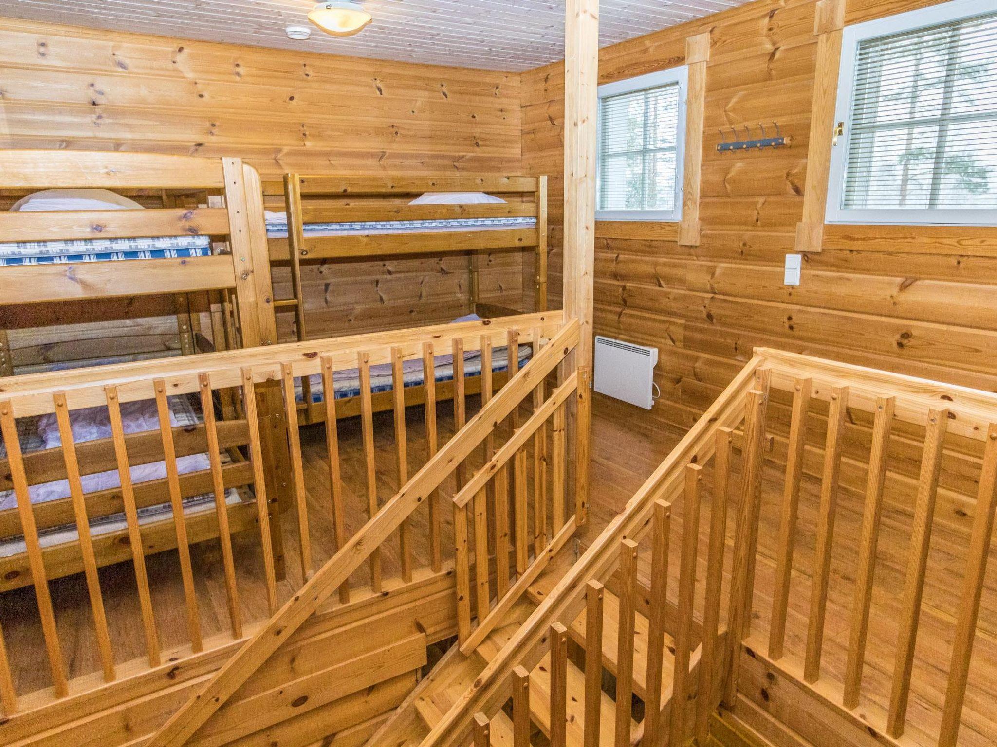 The villa features a living room/kitchen, two separate WCs, three bedrooms with six separate beds, and one bunk bed. Upstairs, there are three bunk beds. Downstairs you'll find sauna facilities, including a dressing room, two showers, and an electric sauna.
