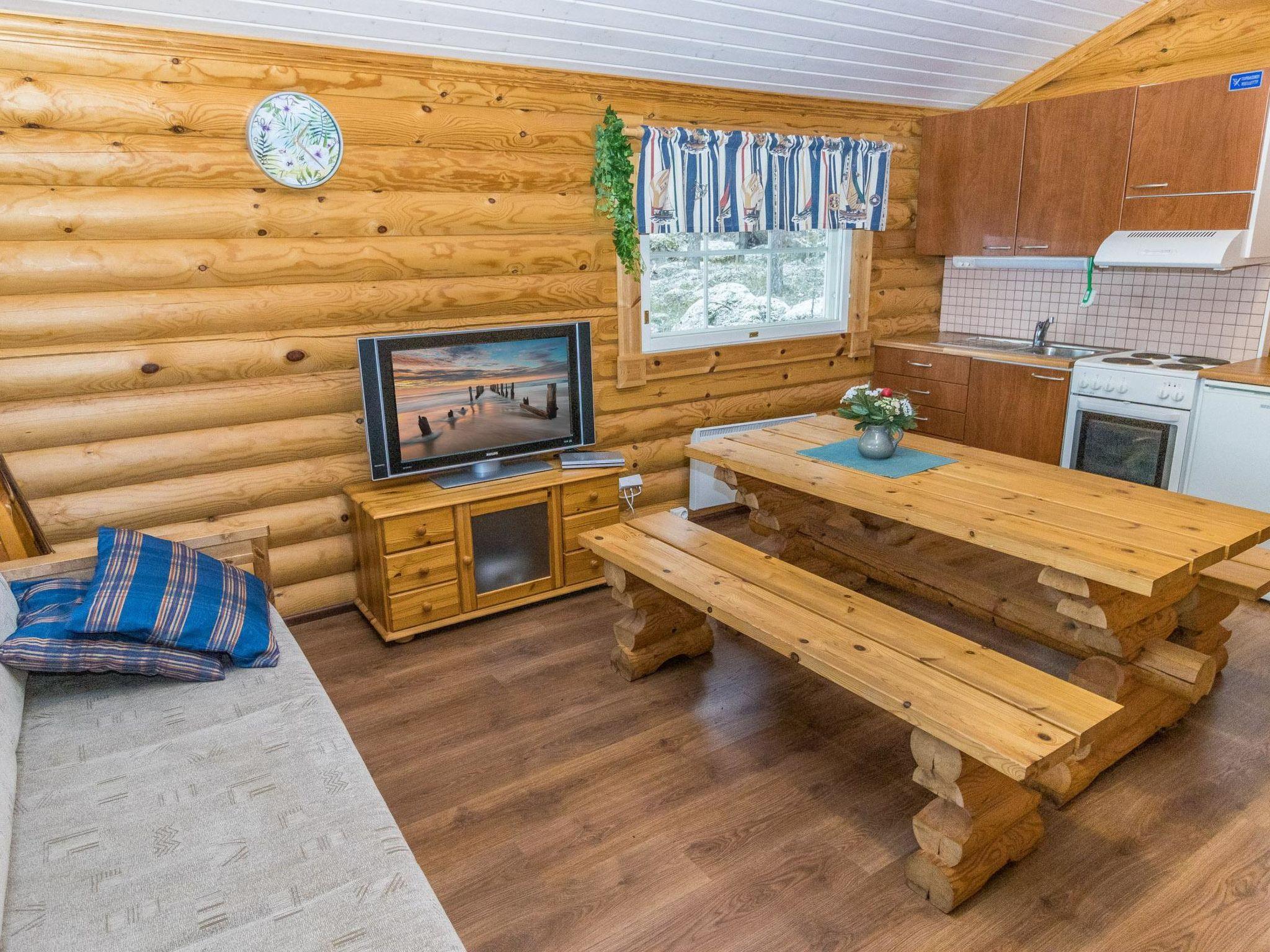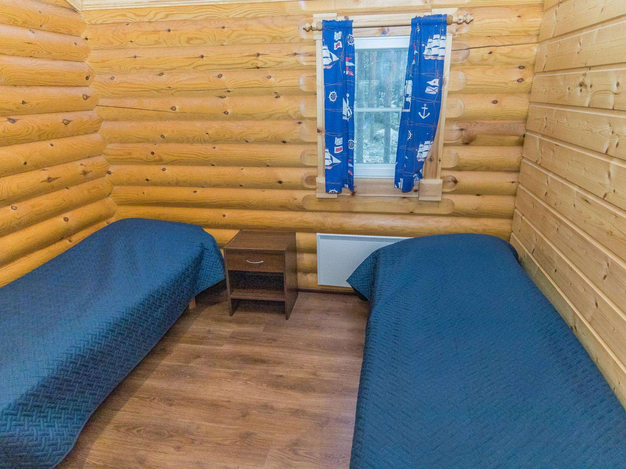 The separate round log guest cabin has a living room/kitchen, TV, separate WC, and two bedrooms—one with two separate beds and another with one bed.