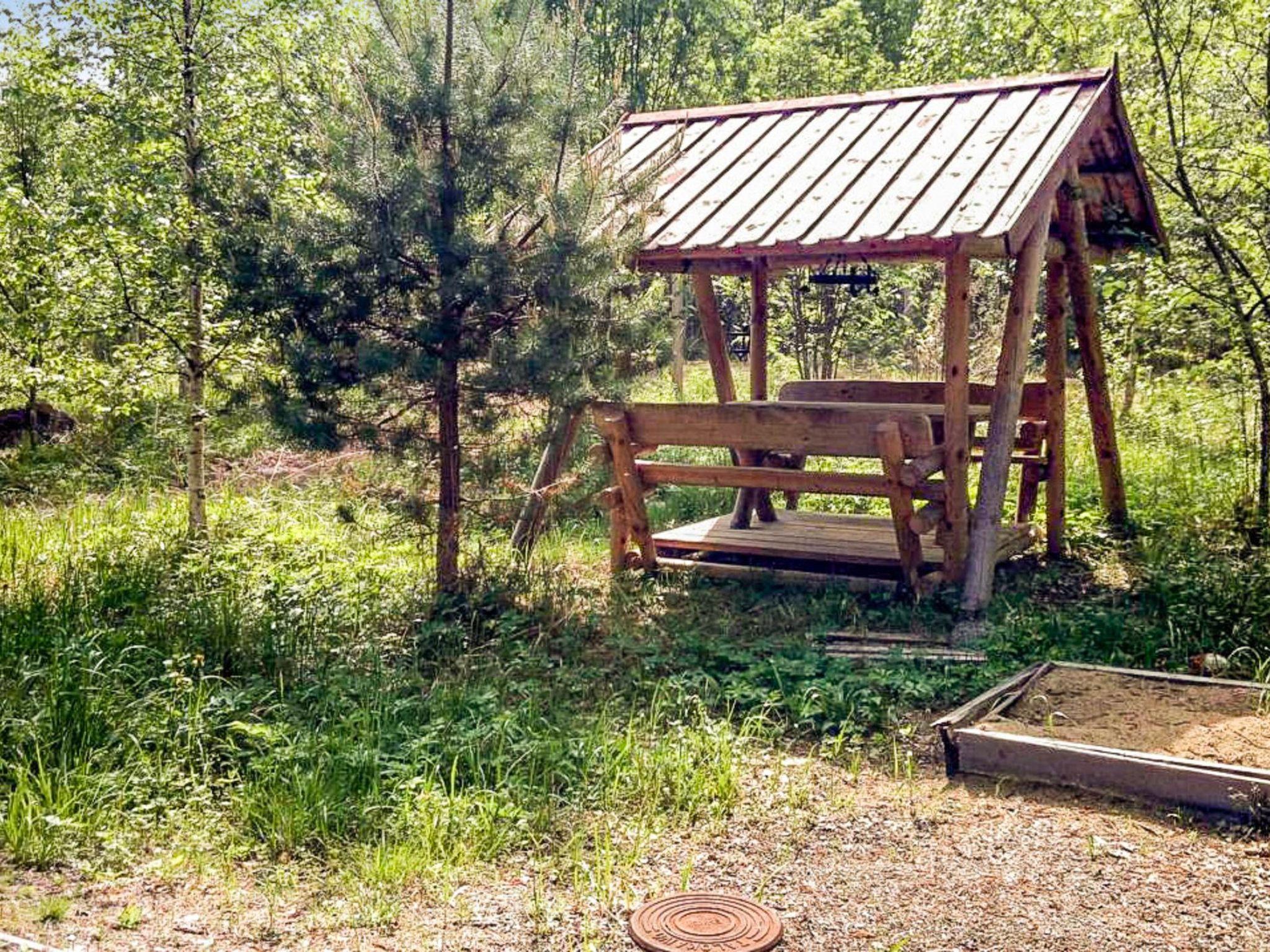 Sandbox, swing and covered cooking area in the yard.