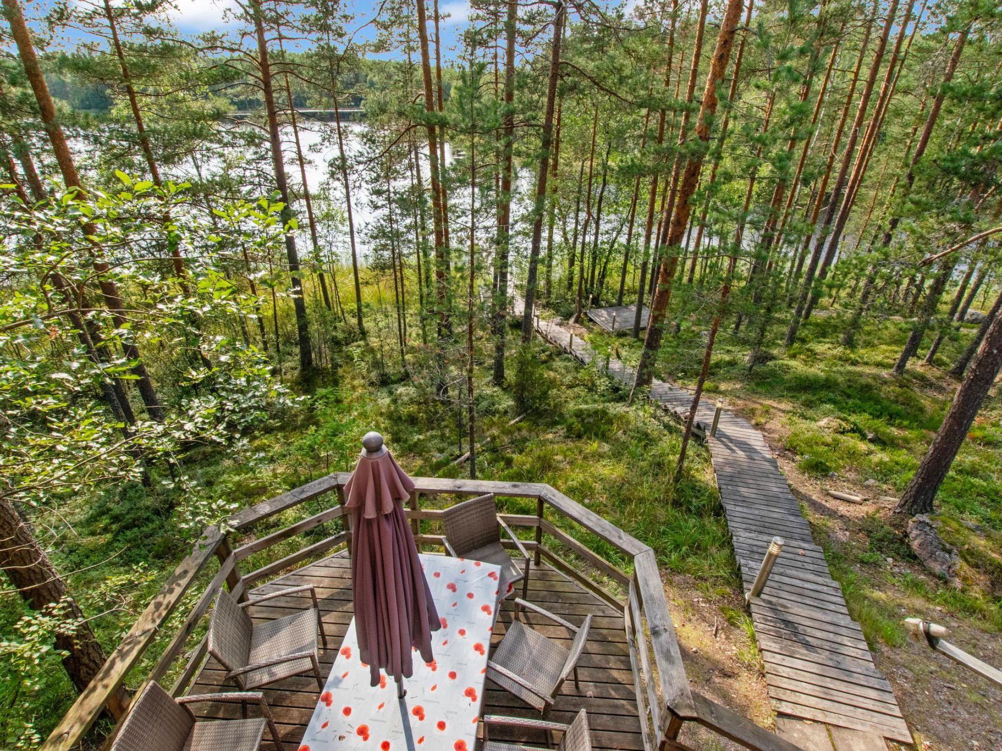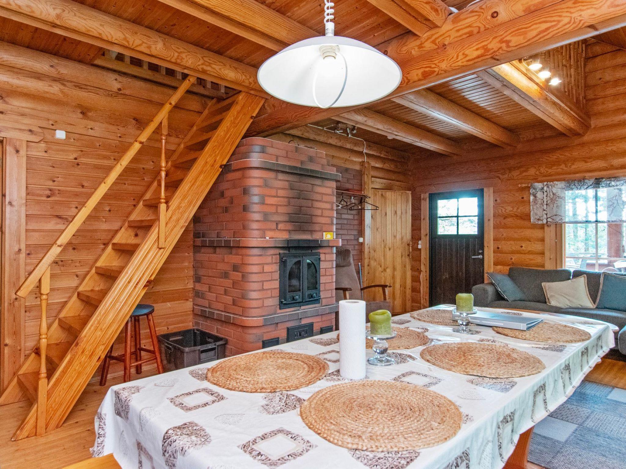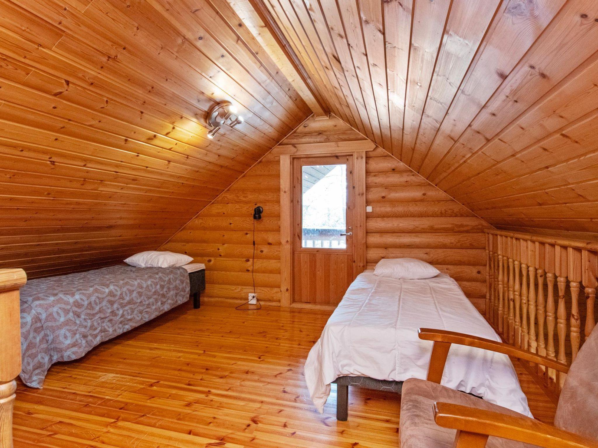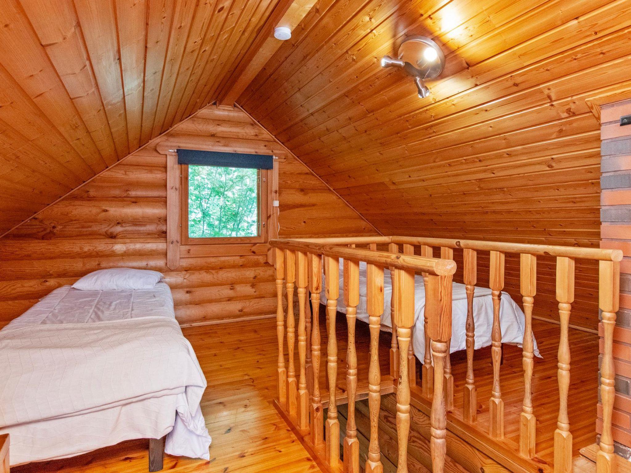 Round log cabin 2003, living room kitchen, 140 cm bed for two in the bedroom, shower and toilet in the bathroom, covered porch and open terrace. Upstairs, four beds and a balcony.