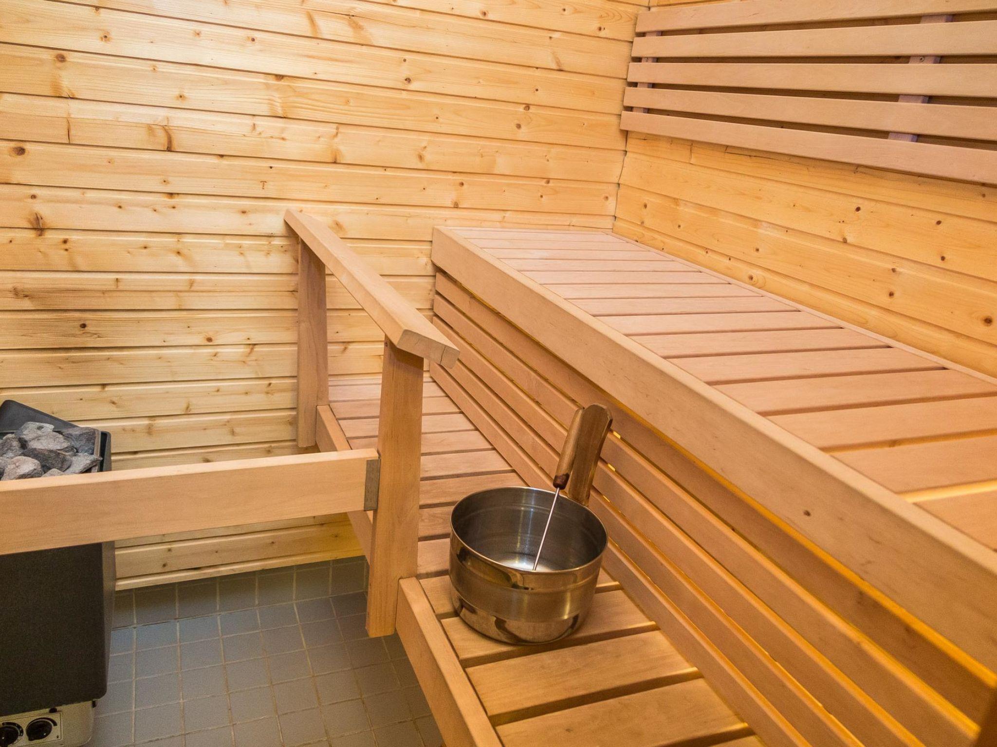 In downstairs there are 1 bedroom (folding door) with two separate beds, open kitchen/living room, balcony and electric heating sauna.