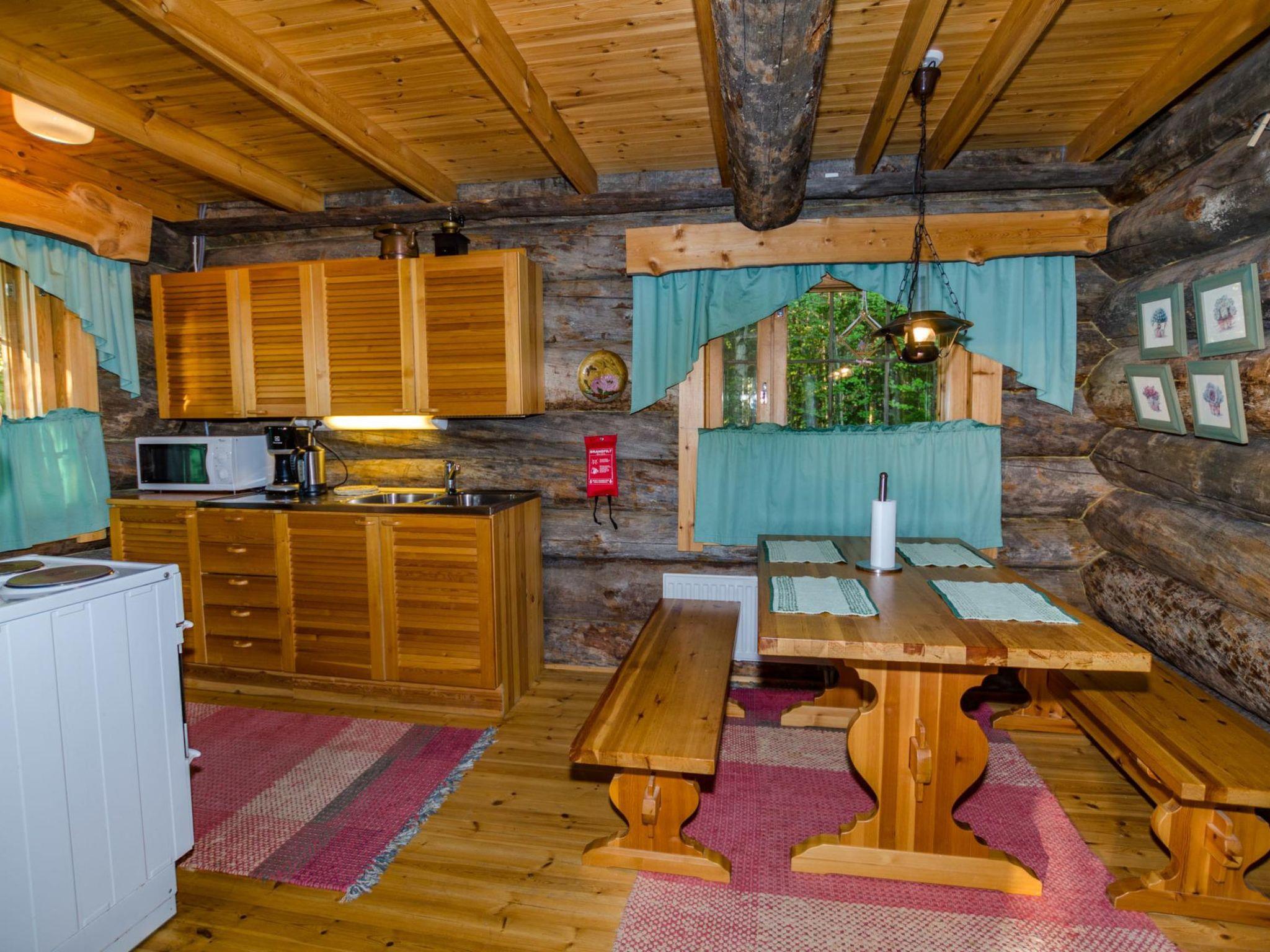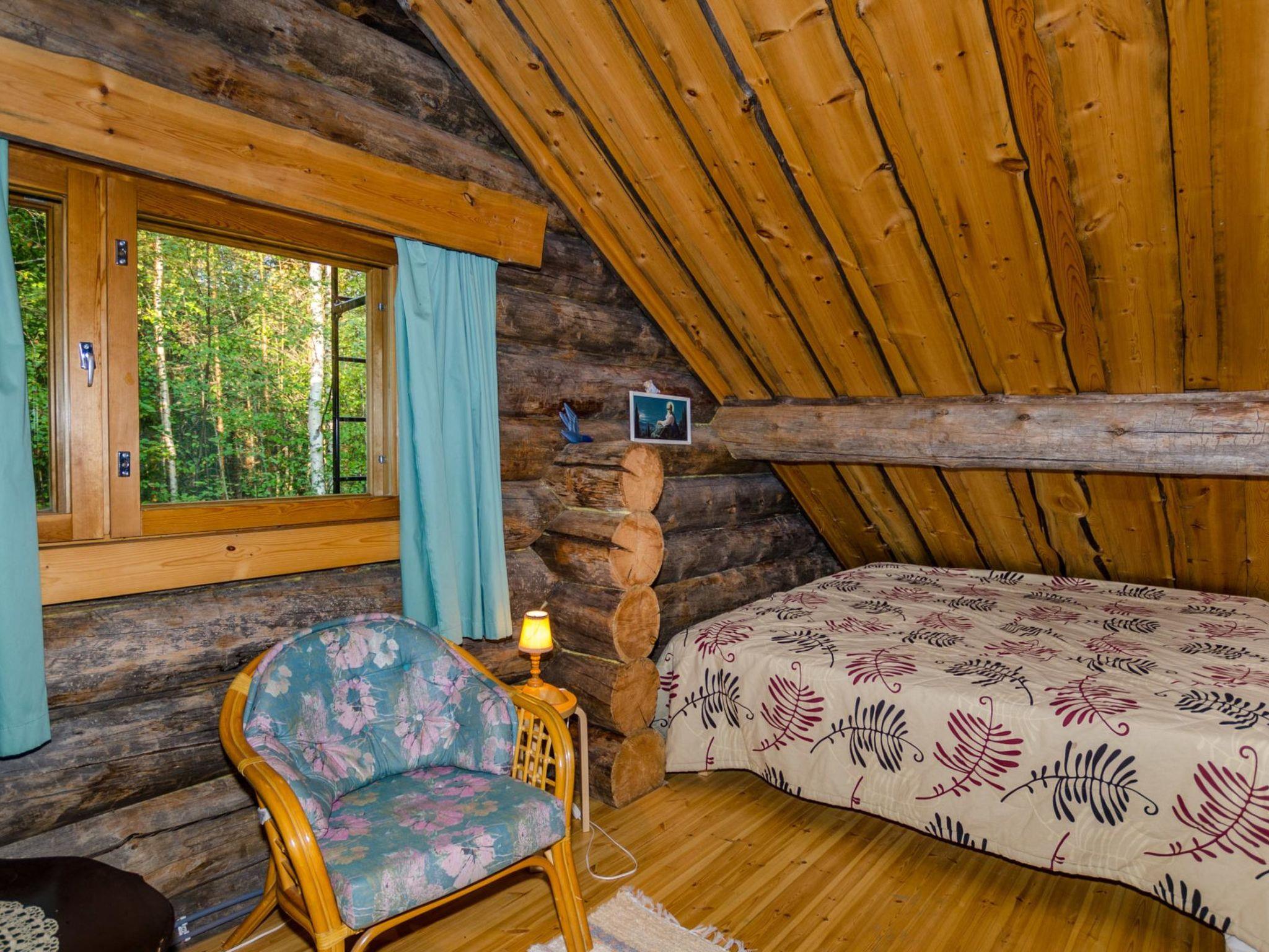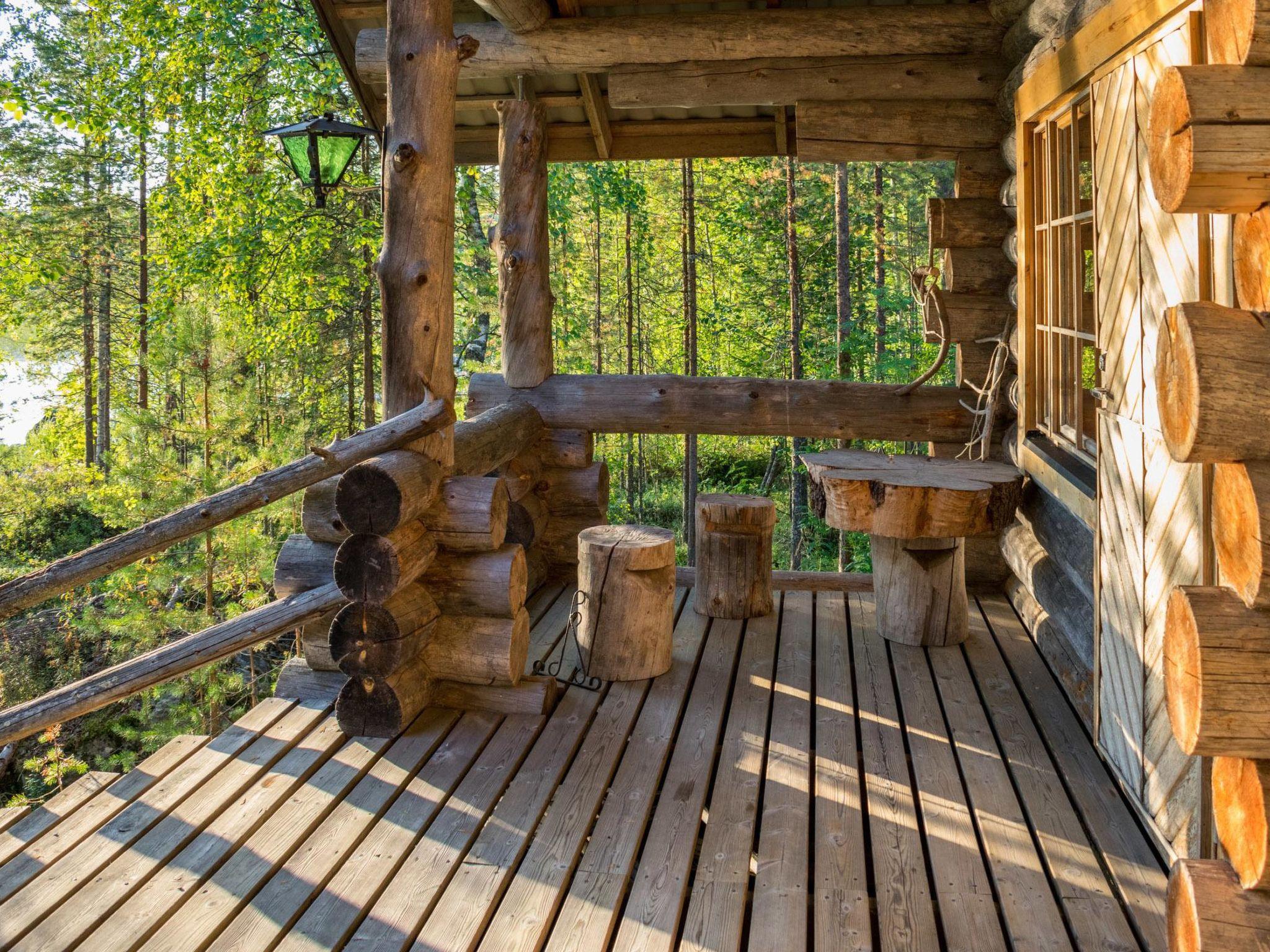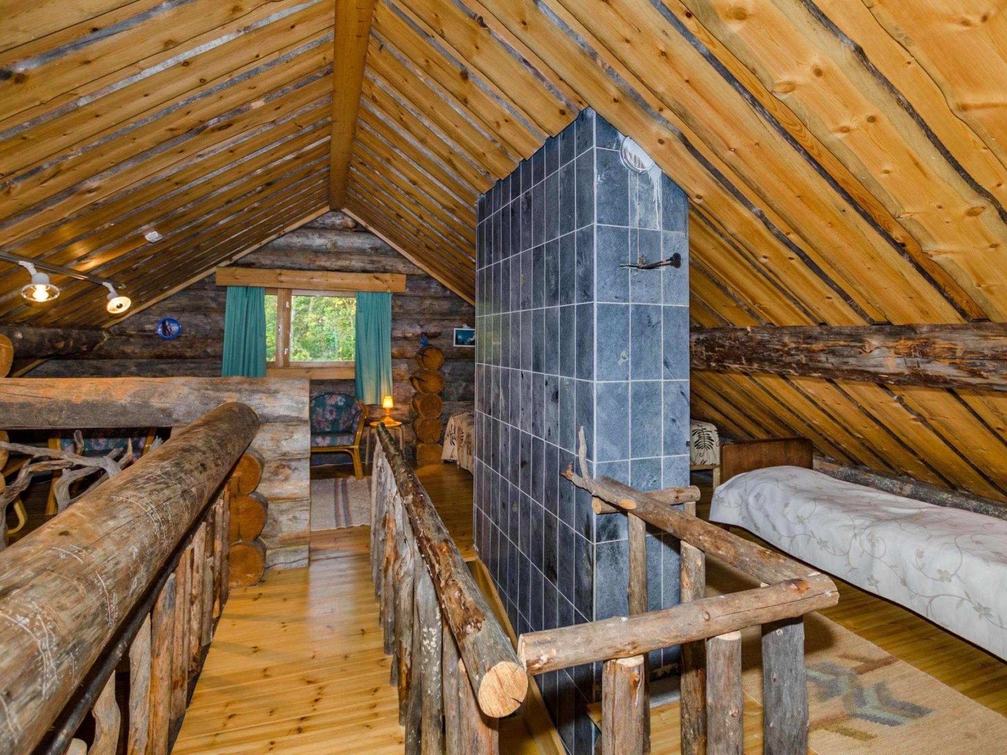 80 km north of Joensuu, L.Pielinen (871,2 km2) 20 m, shallow, sandy bottom, own shore and boat. Log cottage 1996, kitchen-living room with convertible sofa, sleeping alcove (no curtains) with convertible sofa, sleeping gallery with double bed and two separate beds, terrace and balcony. Separate sauna (wood heated stove), shover in the sauna (not separate washroom), dressing/fireplace room. The water of the shower gets warm, when the sauna is heated. The entrance to the sauna is through the veranda.