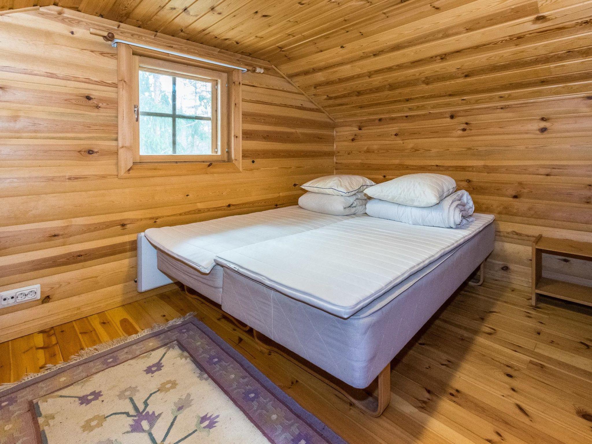 60 km north of Turku, L. Elijärvi 30 m (length 5,5 km, width 400 m), shallow, soft, sanded rock/ mud bottom, own boat. Log cottage 1999, air source heat pump, kitchen, living room couch, bedroom double bed, bedroom bunk, alcove 2 extra beds, sleeping loft bedroom with 2 beds and hall with 2 beds. Unlike the photos, the toilet is a normal water toilet. Wide open porch.