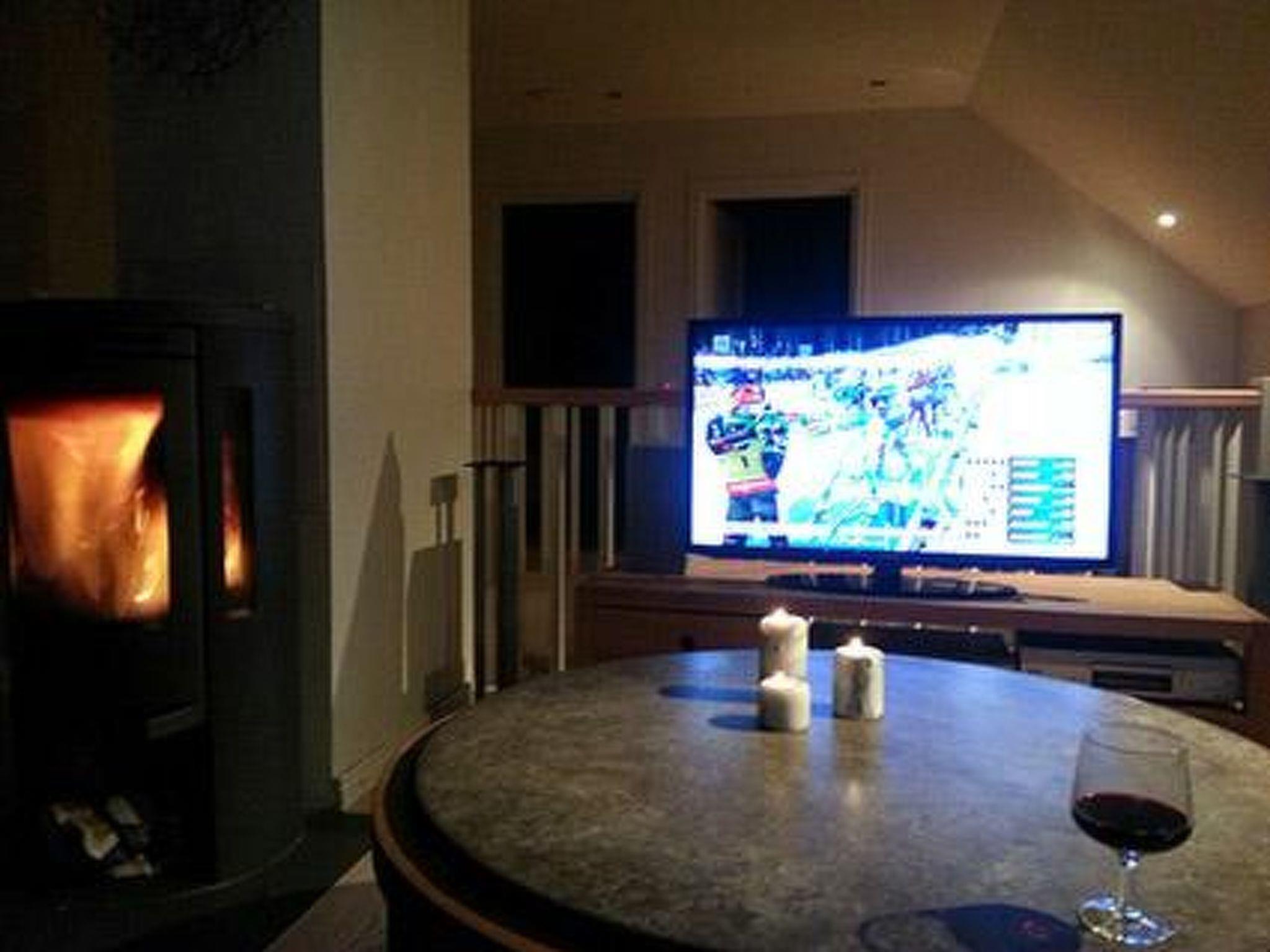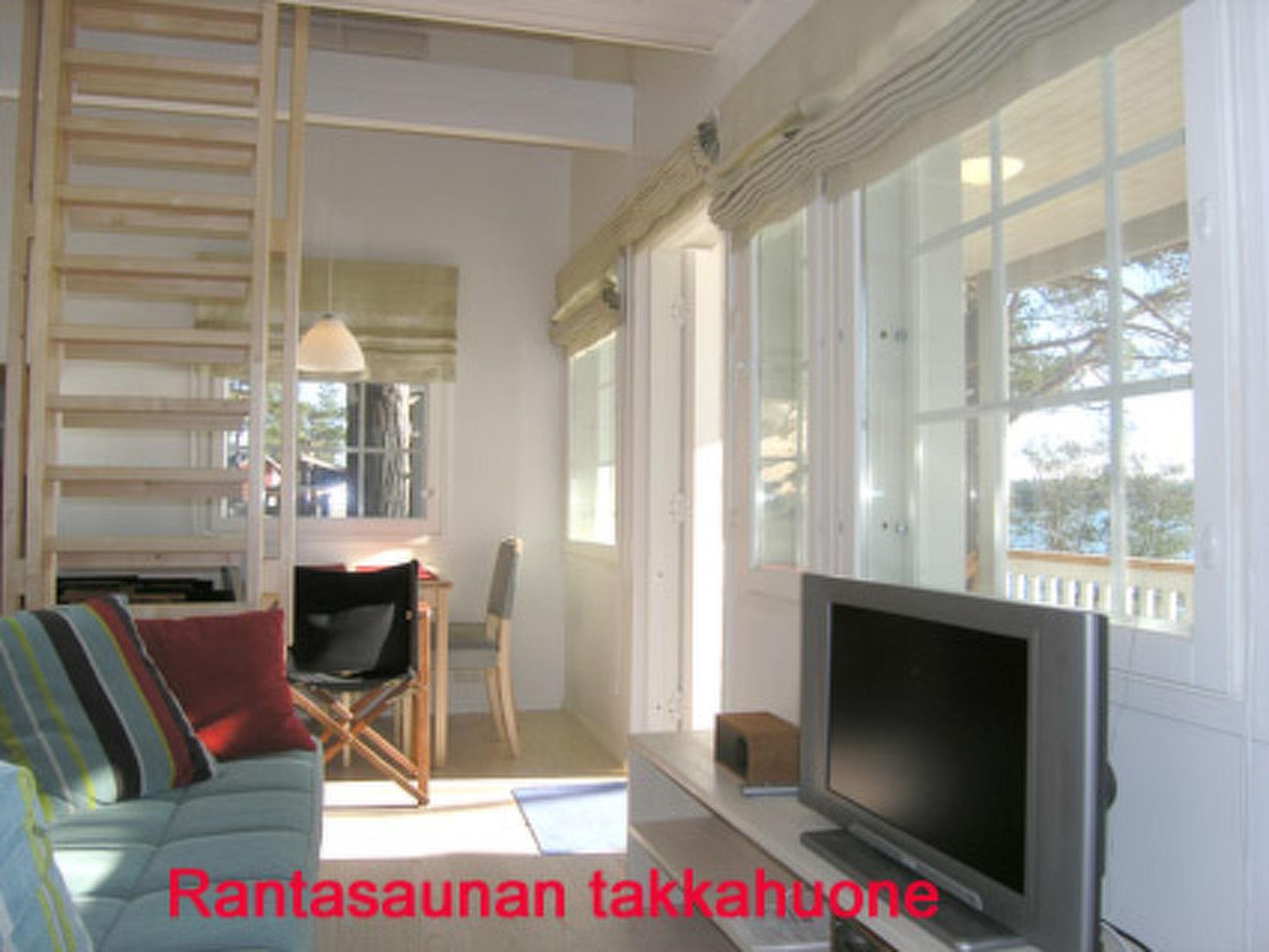 Separate lakeshore sauna (25 m², year-round use), shore 10 m. Lakeshore sauna has electric light, underfloor heating, electric cooker and fridge, microwave, shower in sauna, WC, wood-burning stove, TV, radio. Room with fireplace convertible two sofa/double bed and sleeping loft (to which steps).