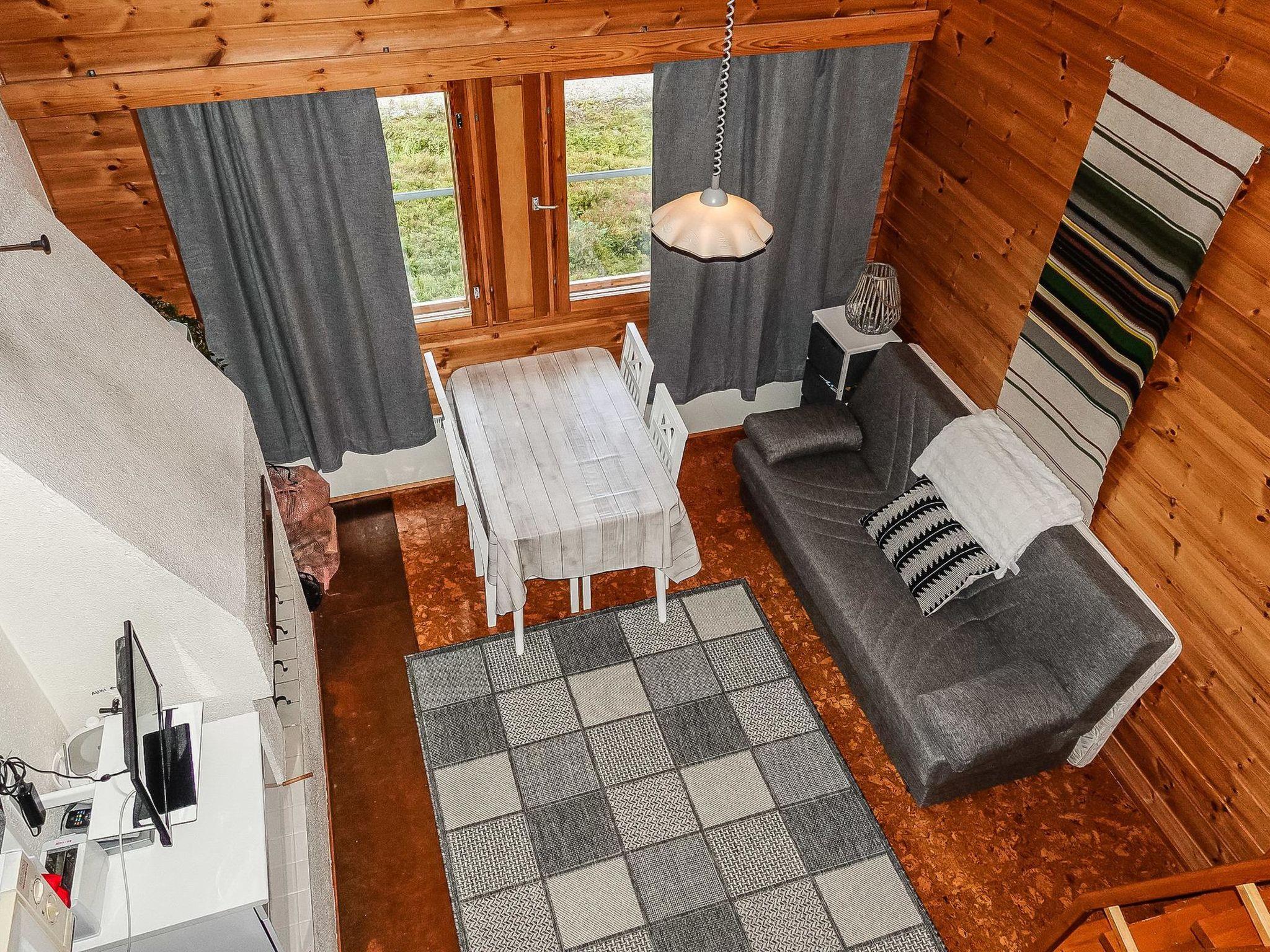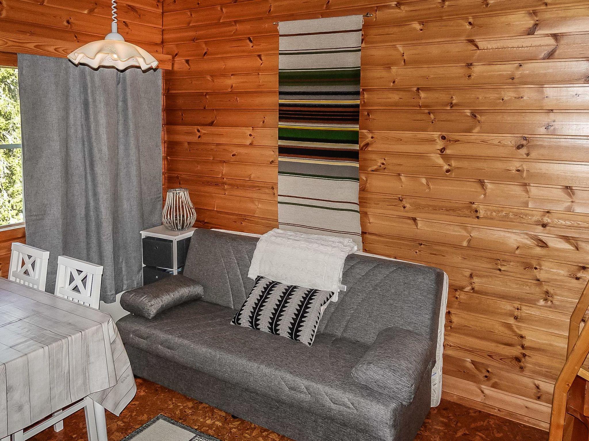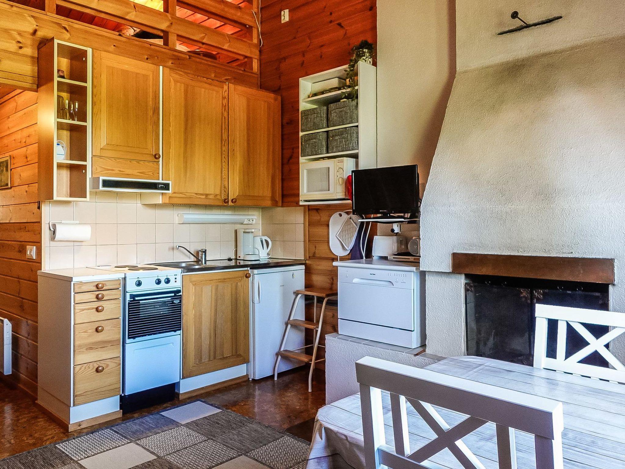 Row house end apartment (made of logs, inside paneled), built in 1985. In the kitchen-living room sofa bed, loft with three single beds (steep stairs to loft, maximum height of 2 m, sloping ceiling), sauna and shower room/toilet. Small dishwasher for few dishes.
