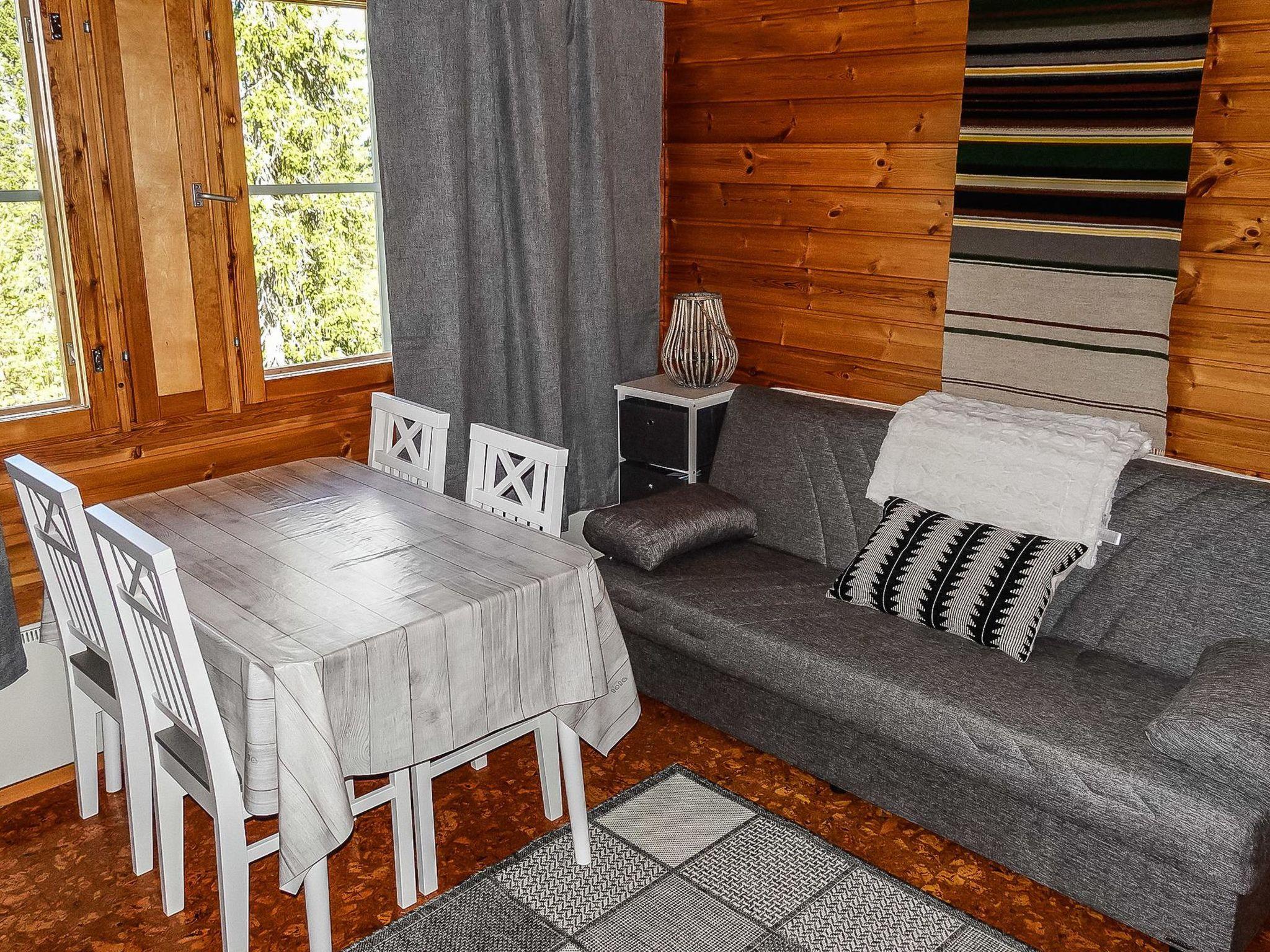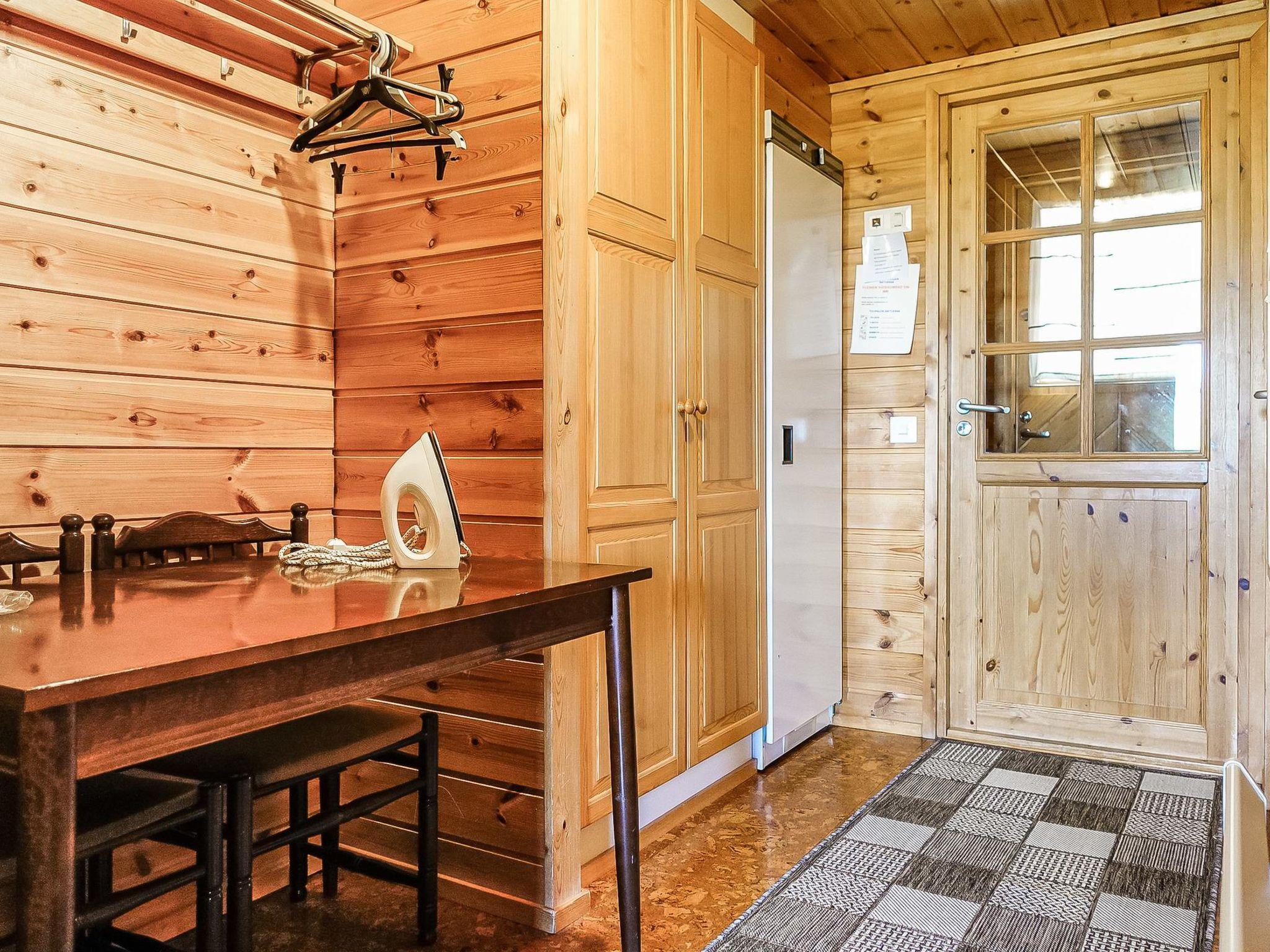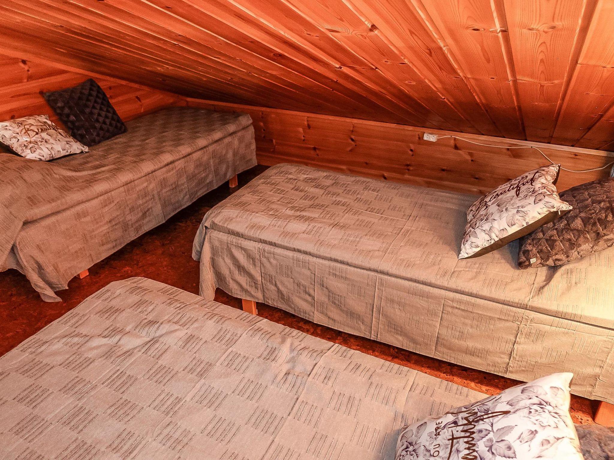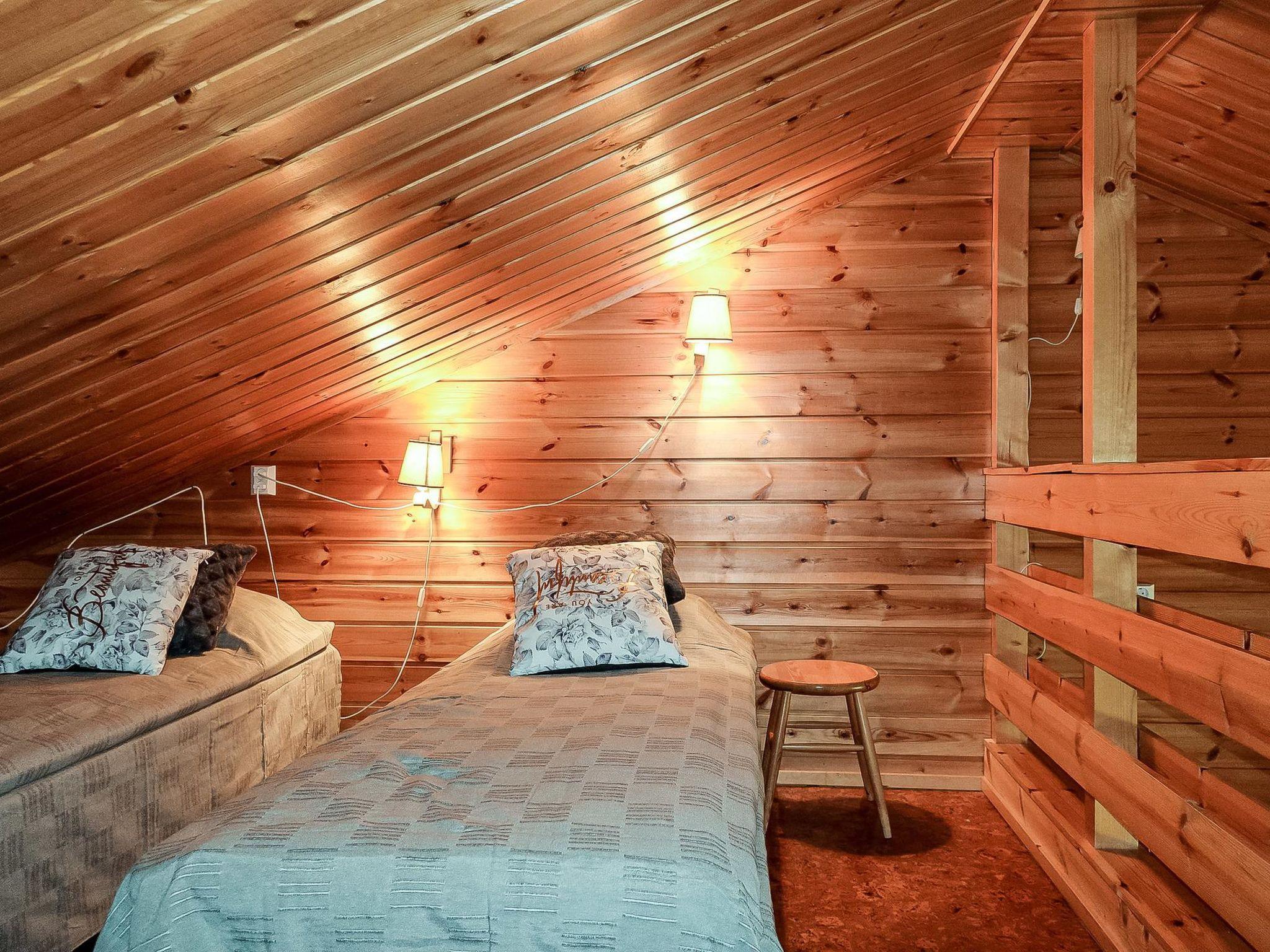 Row house end apartment (made of logs, inside paneled), built in 1985. In the kitchen-living room sofa bed, loft with three single beds (steep stairs to loft, maximum height of 2 m, sloping ceiling), sauna and shower room/toilet. Small dishwasher for few dishes.