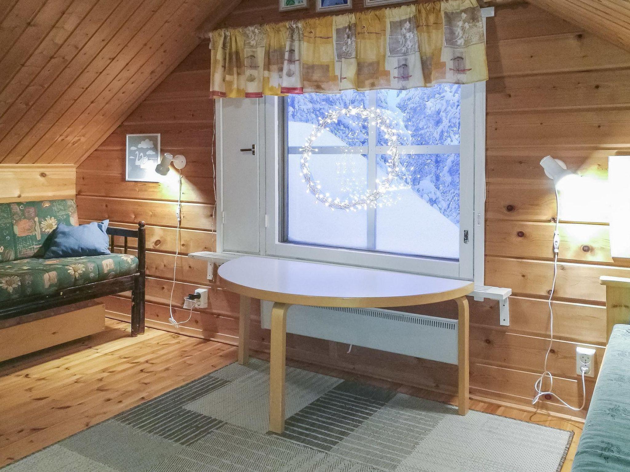 140 km northeast from Oulu, near Syöte ski resort in Huuhkanen area, Lake Ala-Huuhkanen 50 m (length 1 km, width 100 m, joined with two other lakes), no own beach. Own rowing boat on the shore. The path to the boat is quite steep, however, there is a railing at the steepest point for support. The boat beach is not a swimming beach; there is no pier and the bottom is a bit soft. The public beach is in Isosyöte, lake Luppovesi, 12.4 km from the cottage: sandy beach, jetty.