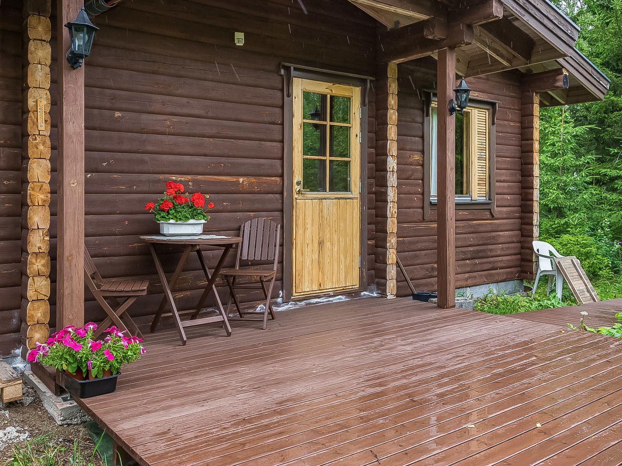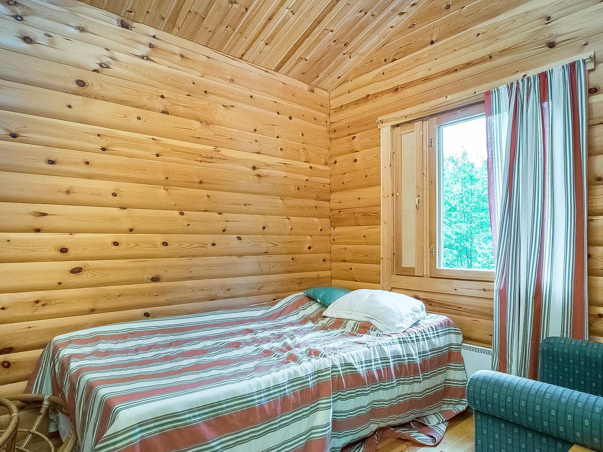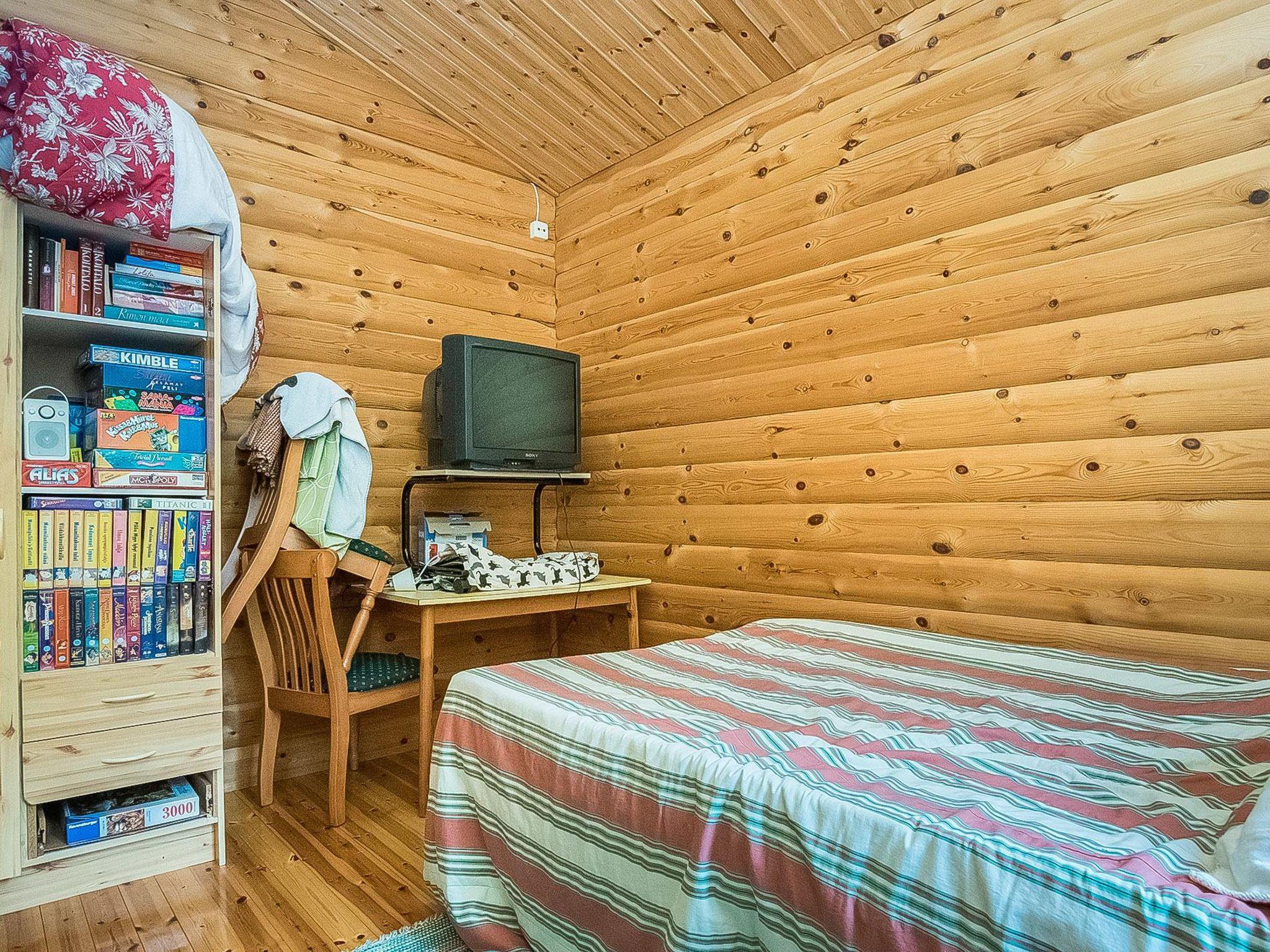 Log cabin 2002, living room, kitchenette, bedroom (10 m²) double bed, bedroom (9 m²) 120 cm bed, loft above kitchen (steep stairs) with two mattresses, washroom with WC and shower cubicle, sauna, covered porch.