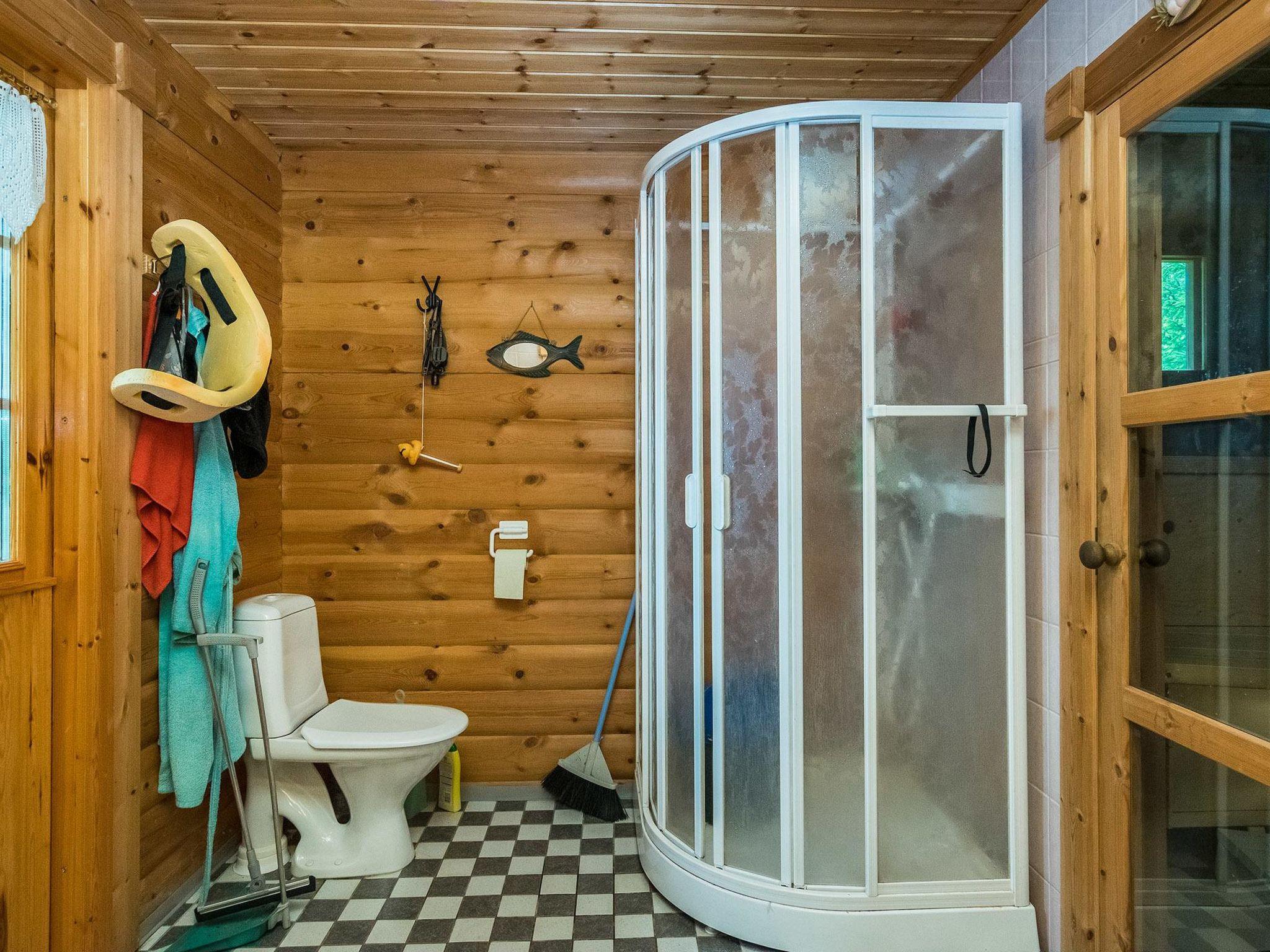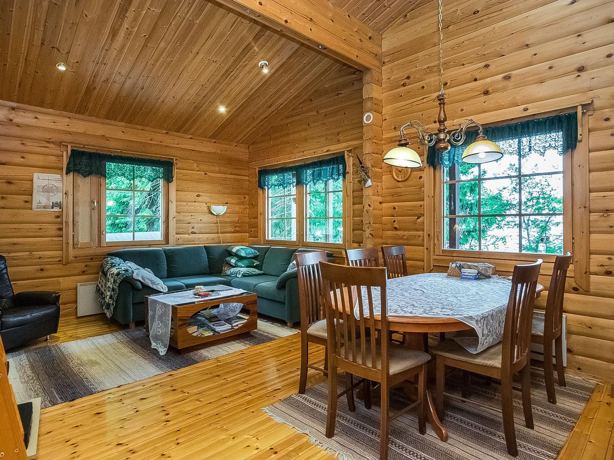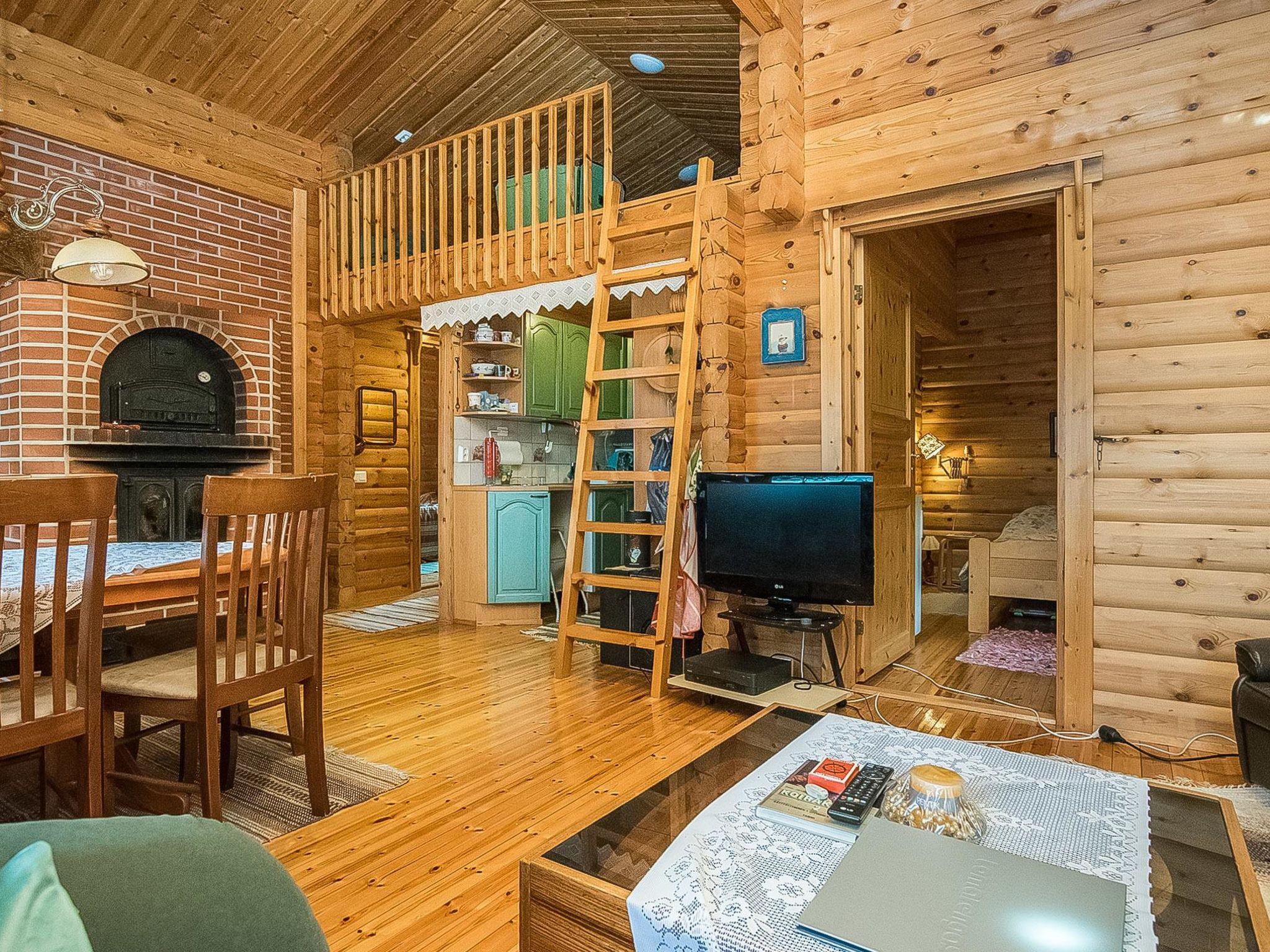 Log cabin 2002, living room, kitchenette, bedroom (10 m²) double bed, bedroom (9 m²) 120 cm bed, loft above kitchen (steep stairs) with two mattresses, washroom with WC and shower cubicle, sauna, covered porch.
