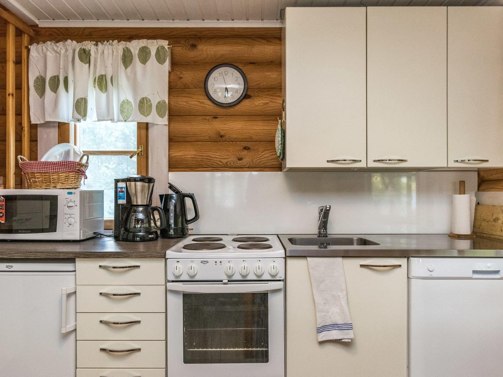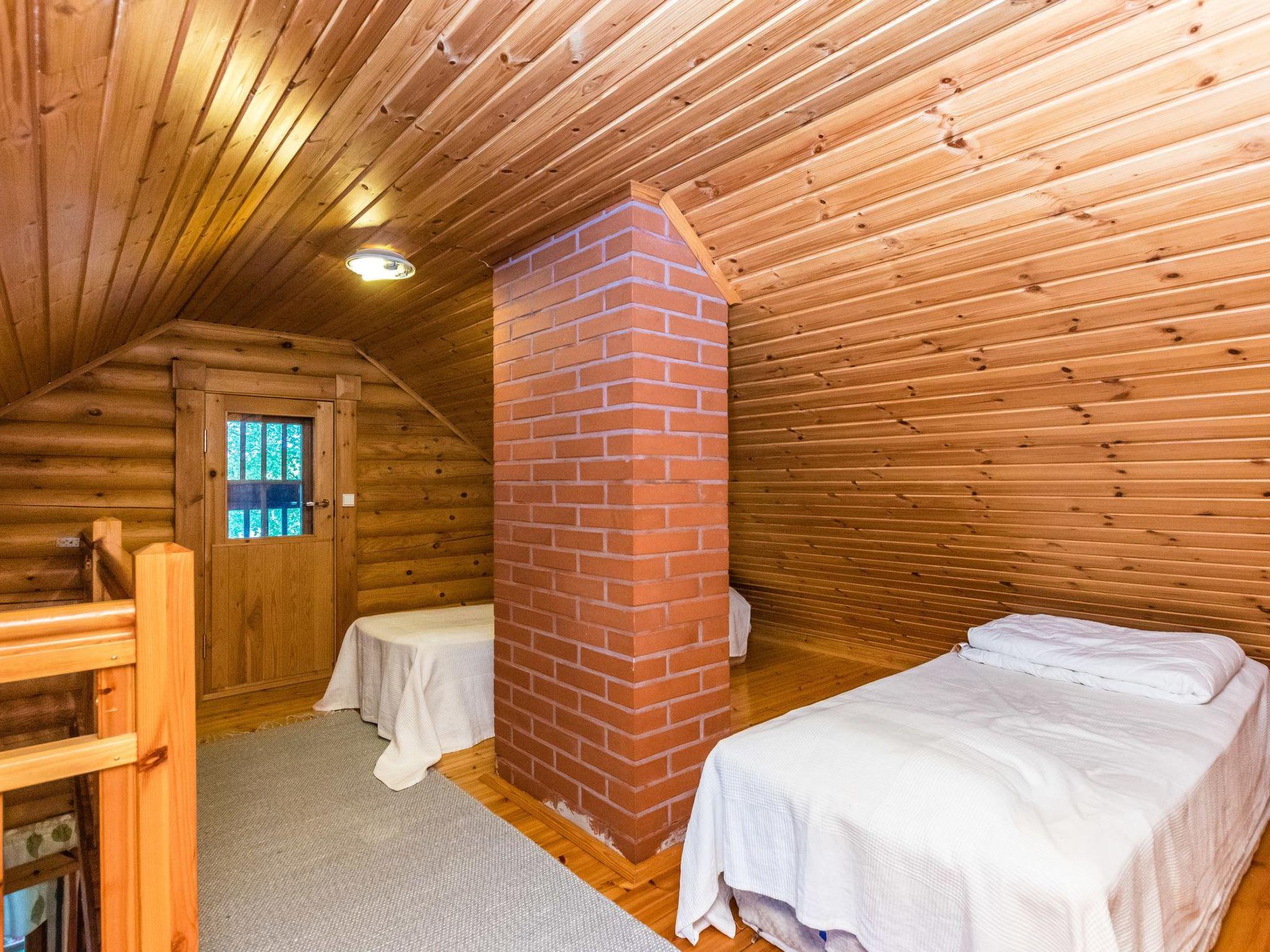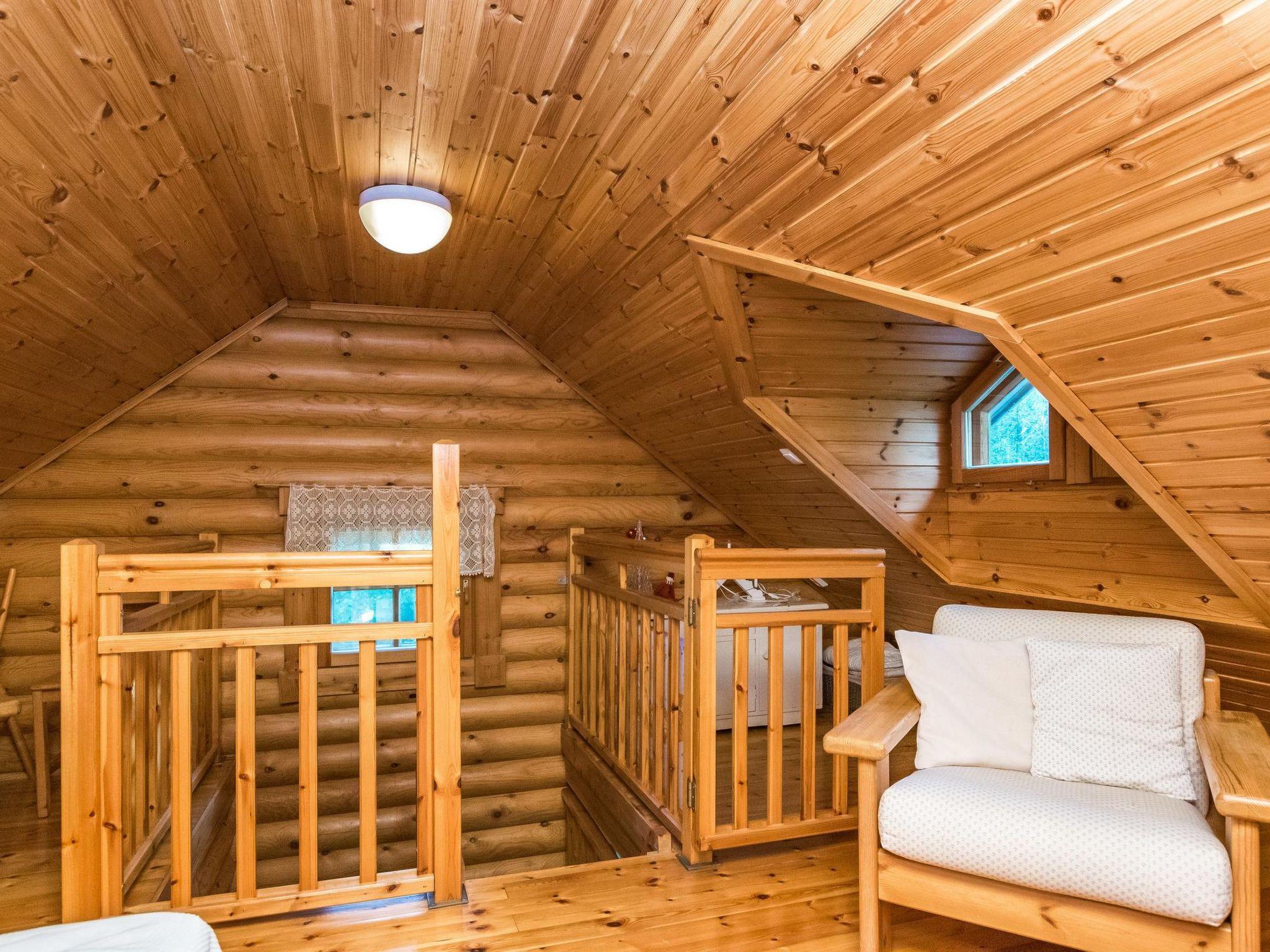 Round log-built cabin 1997, living room/kitchen, bedroom (7 m²) on the ground floor has double bed, washroom with shower and WC, sauna with wood-burning sauna stove, covered porch. Loft with two mattresses, balcony.