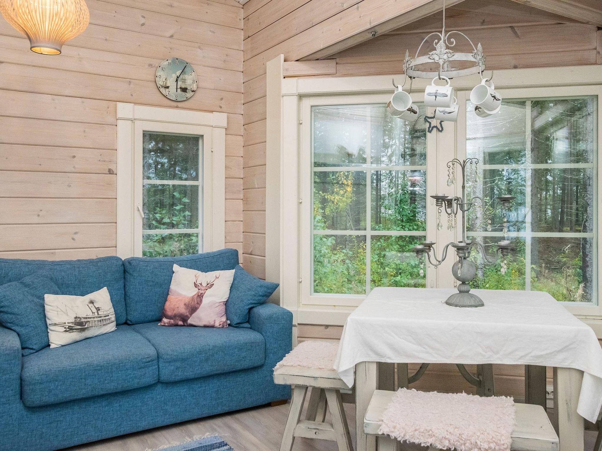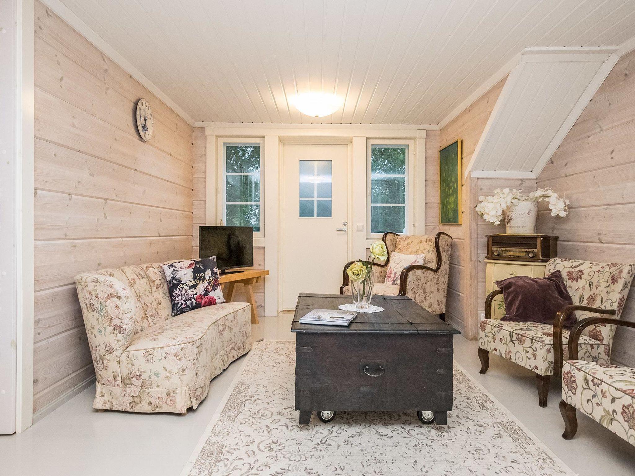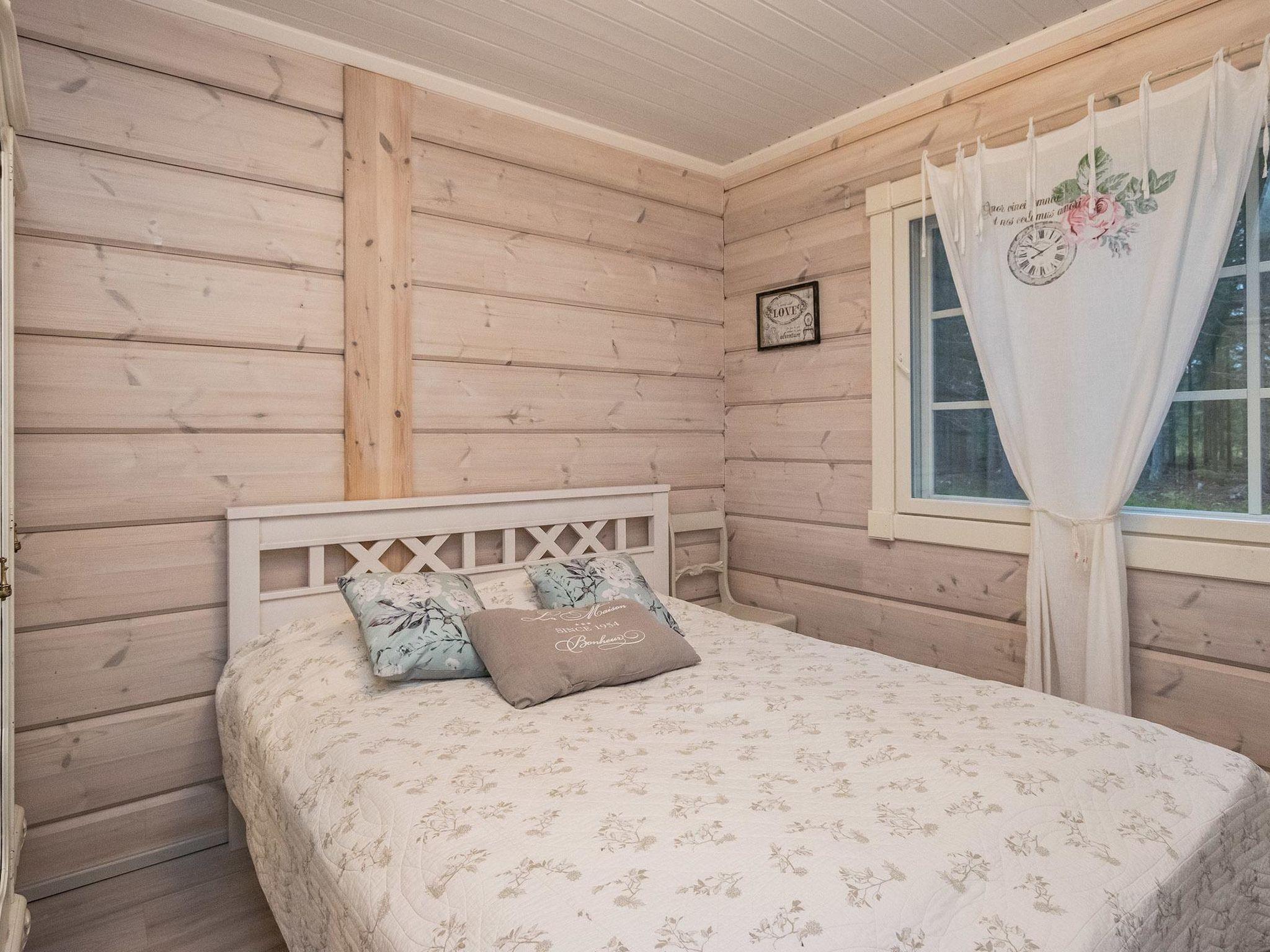 Log cabin 2015, living room / kitchen, bedroom (10 m²) with double bed, dressing room, washroom, sauna (electric sauna stove), WC, covered terrace.