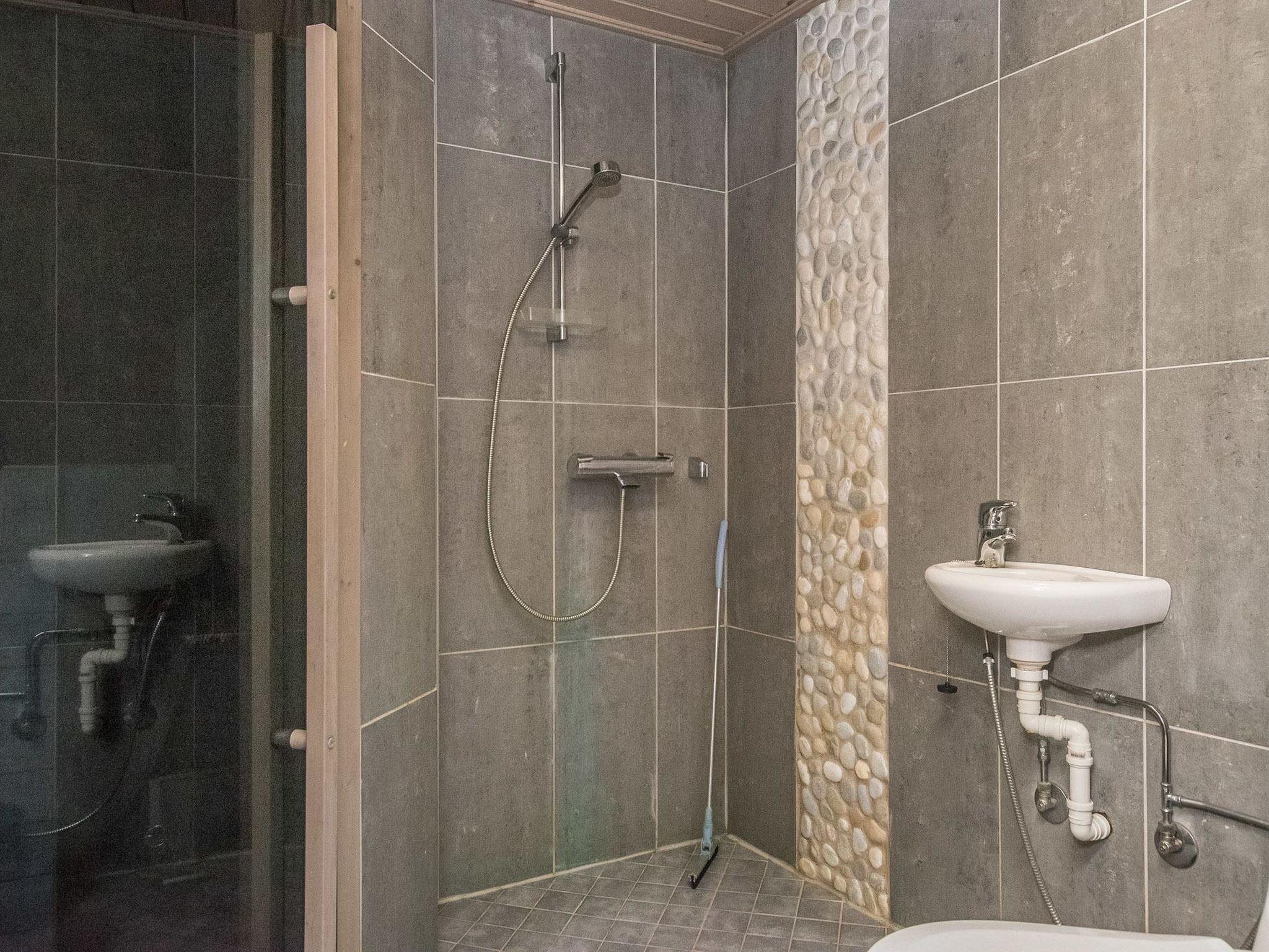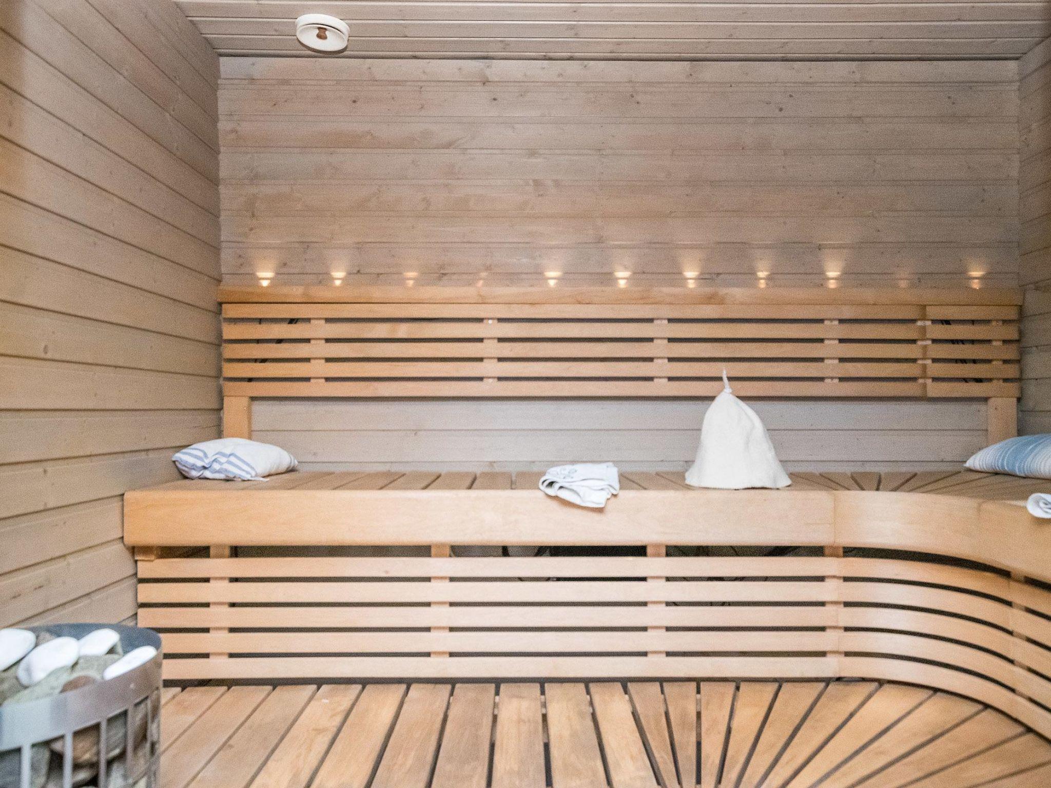 Lakeside sauna with wood-burning sauna stove, shower, WC, kitchenette in connection with living area, terrace.