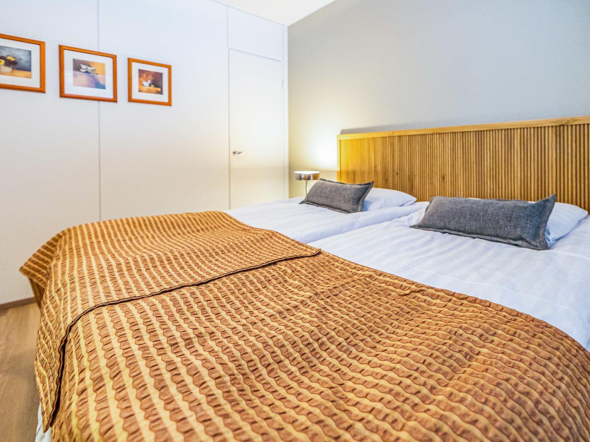 Apartment in wood-built row house, house is built in 1980 and renovated in 2022. Apartment has kitchen, living room, 2 bedrooms with 2 beds in each, washroom with shower, WC and terrace.