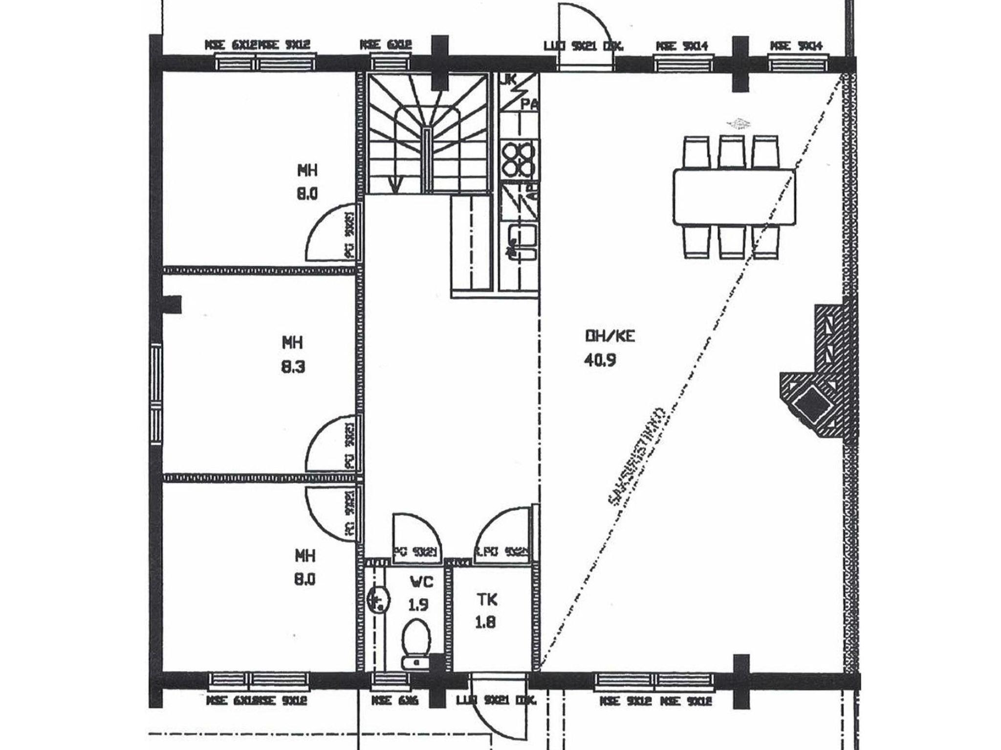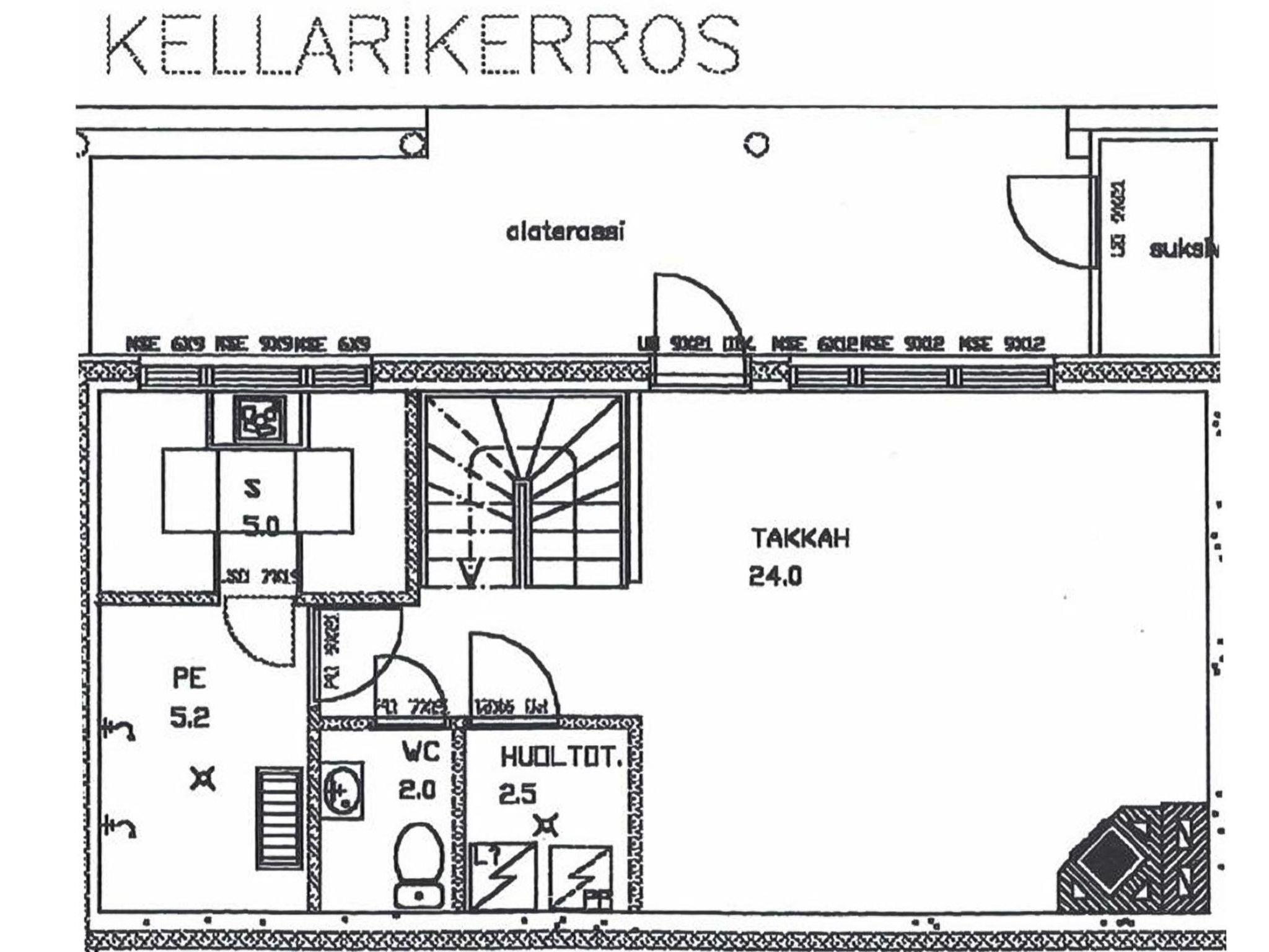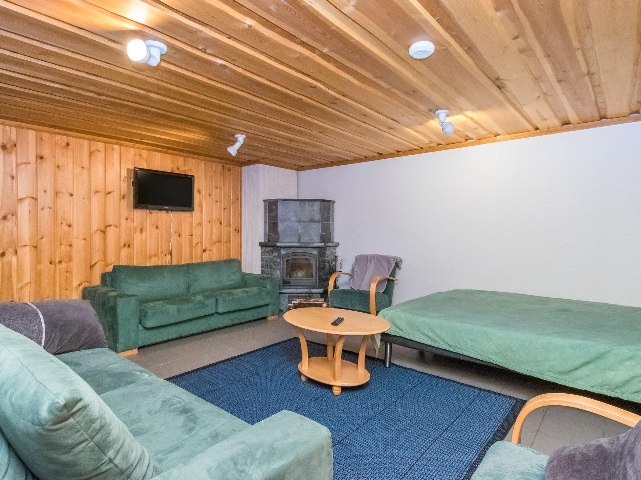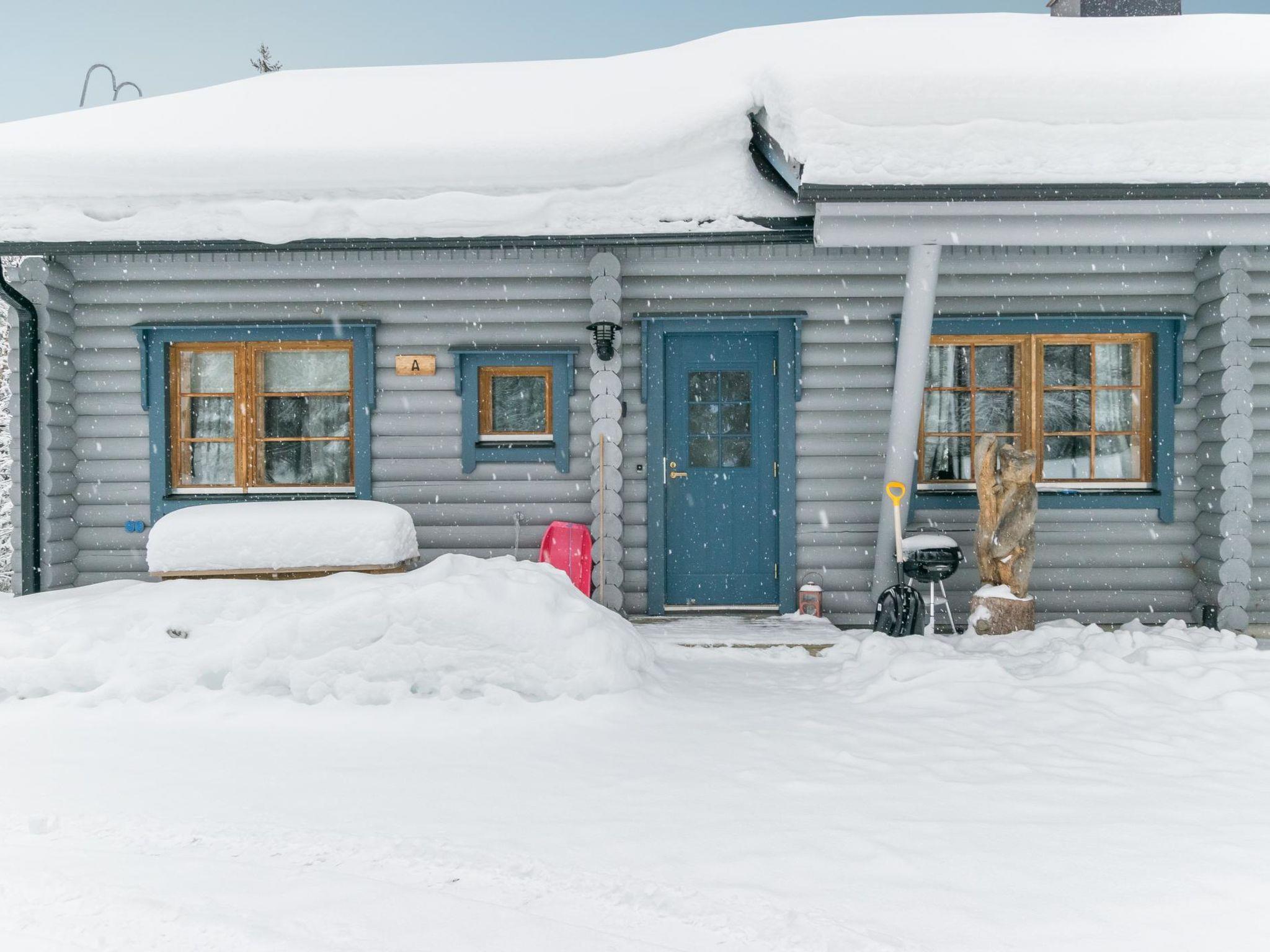 Cosy row house of massive logs, built in 2000. Roomy kitchenette and living room with a sofa bed and 2 mattresses, living room with fire place with 3 sofa bed, sauna, 2 WC’s, storage room, terrace, upstairs 3 bed rooms with each 2 beds.