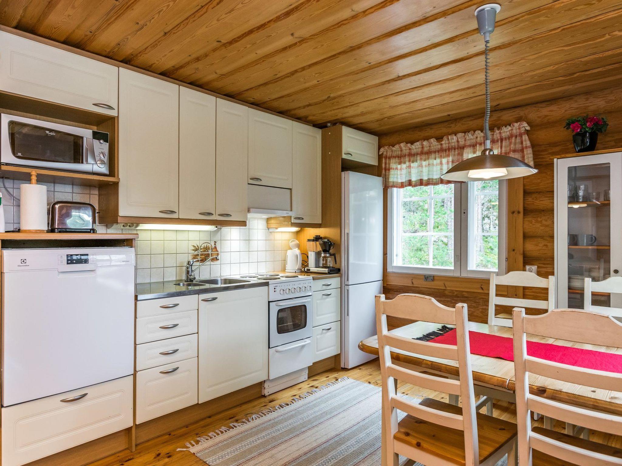 Round log cabin 2003, kitchen, living room, two bedrooms, each with two beds, utility room, washroom, wood-burning sauna stove in the sauna, separate WC. Two beds on the upper floor. Covered terrace 28 m². The total area of the cabin is 112 m², of which ground floor is 85 m² and upper floor 27 m².