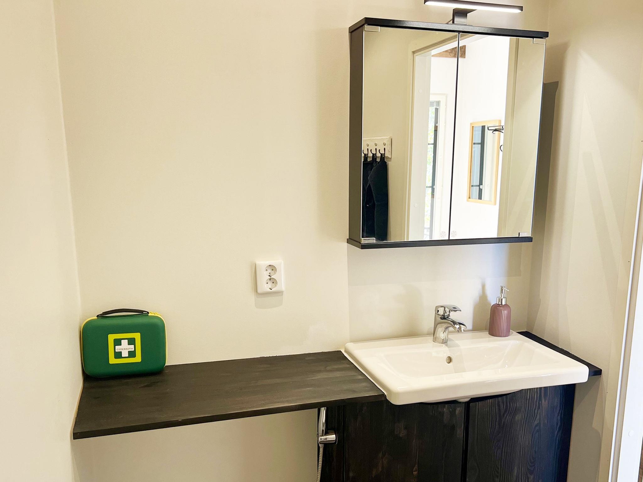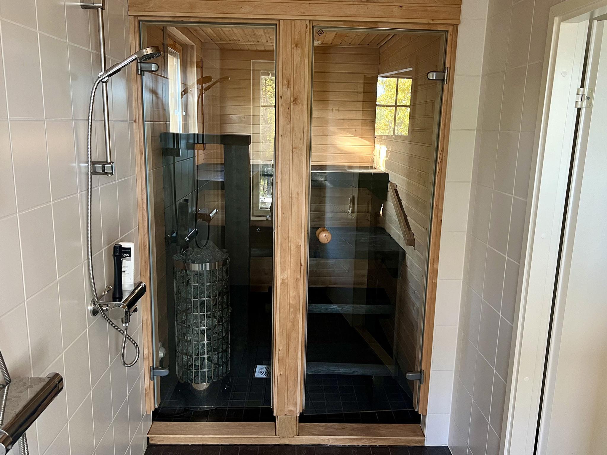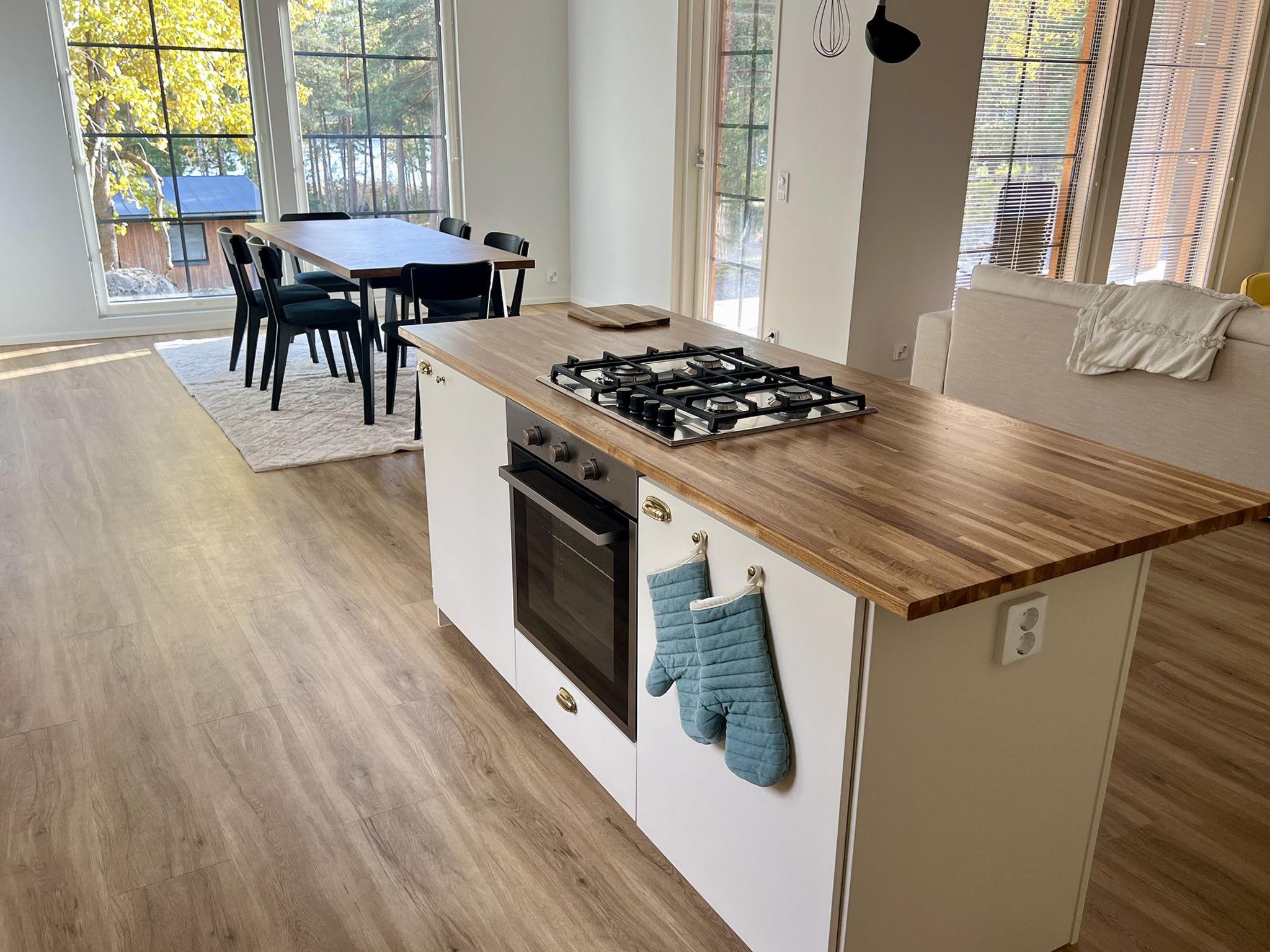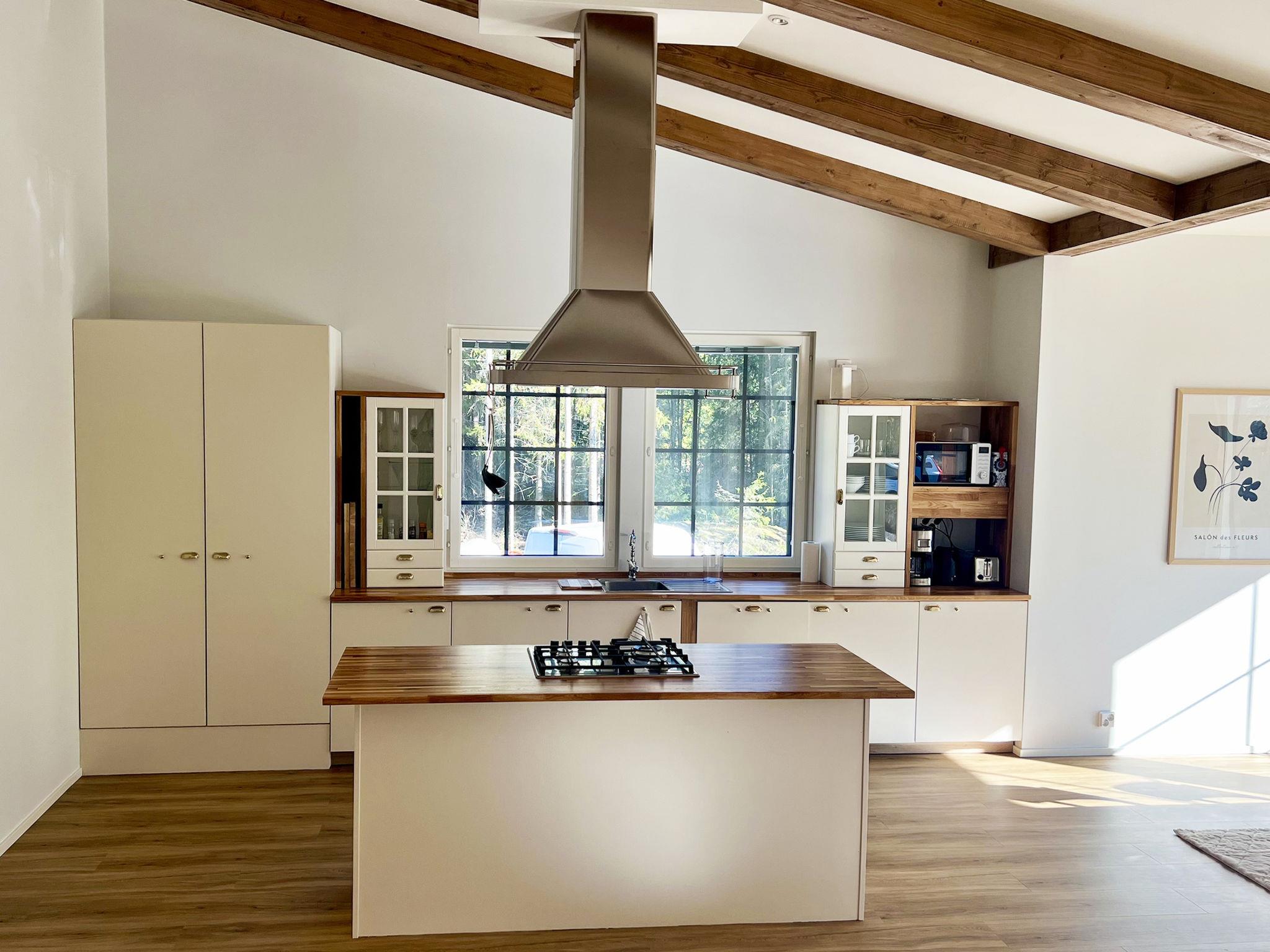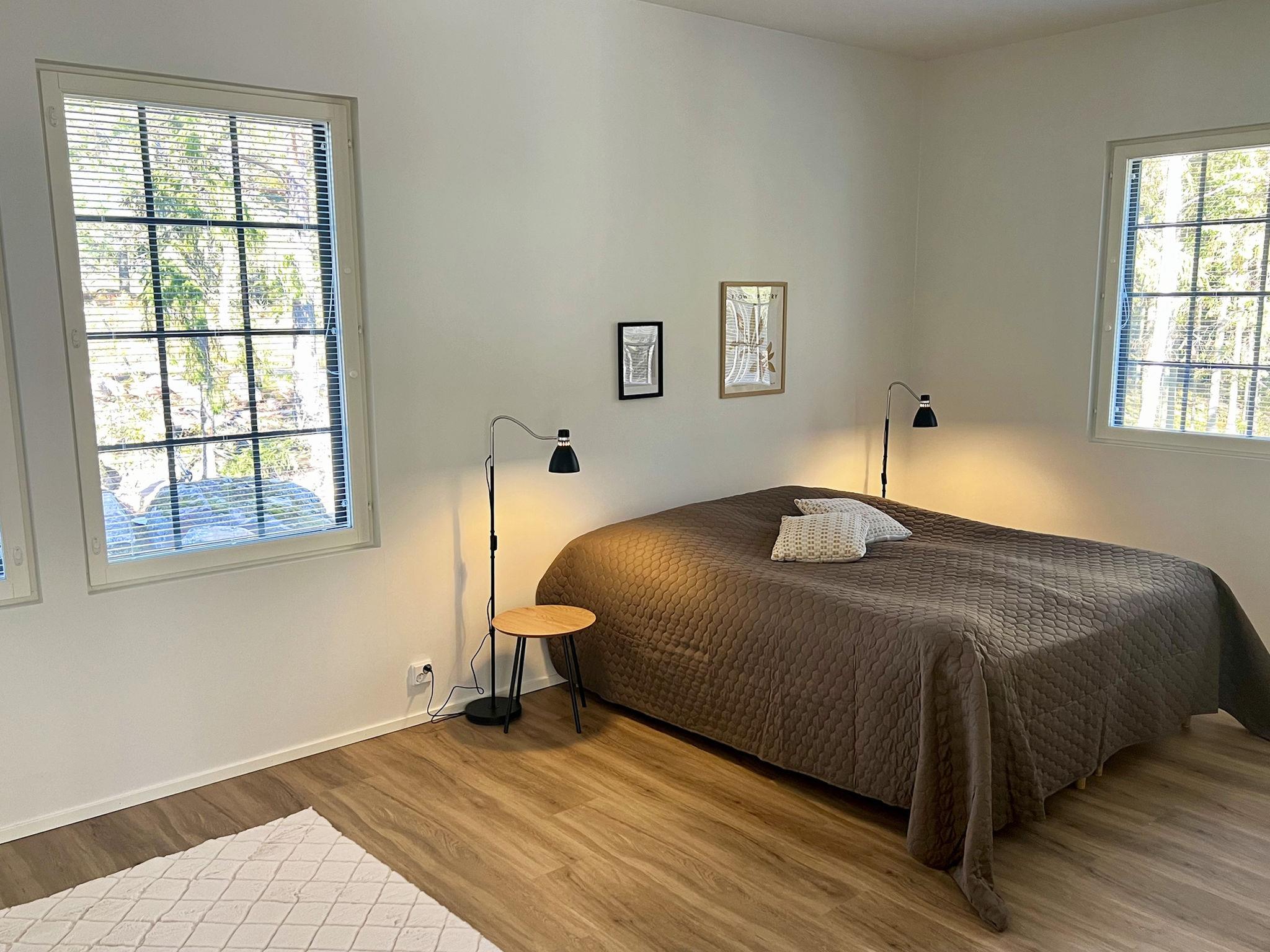 The holiday home features a living room/kitchen with two sofa beds, each accommodating two people. The kitchen is equipped with a gas stove favored by professional chefs and an electric oven. The holiday home has two bedrooms: one with a double bed (which can be separated into two single beds with individual mattress toppers) and the other with two separate beds. Additionally, there is an electric sauna, a bathroom with two showers, a dressing room, a separate WC, and a utility room with a washing machine and dryer. 4G Wi-Fi is available.
