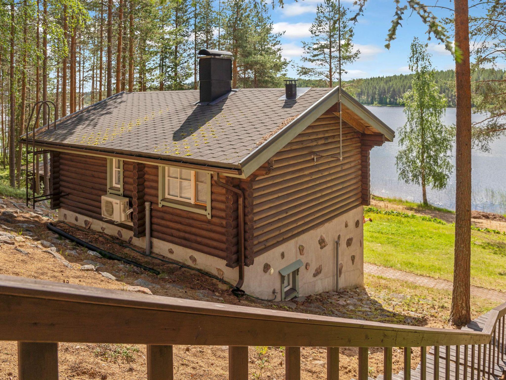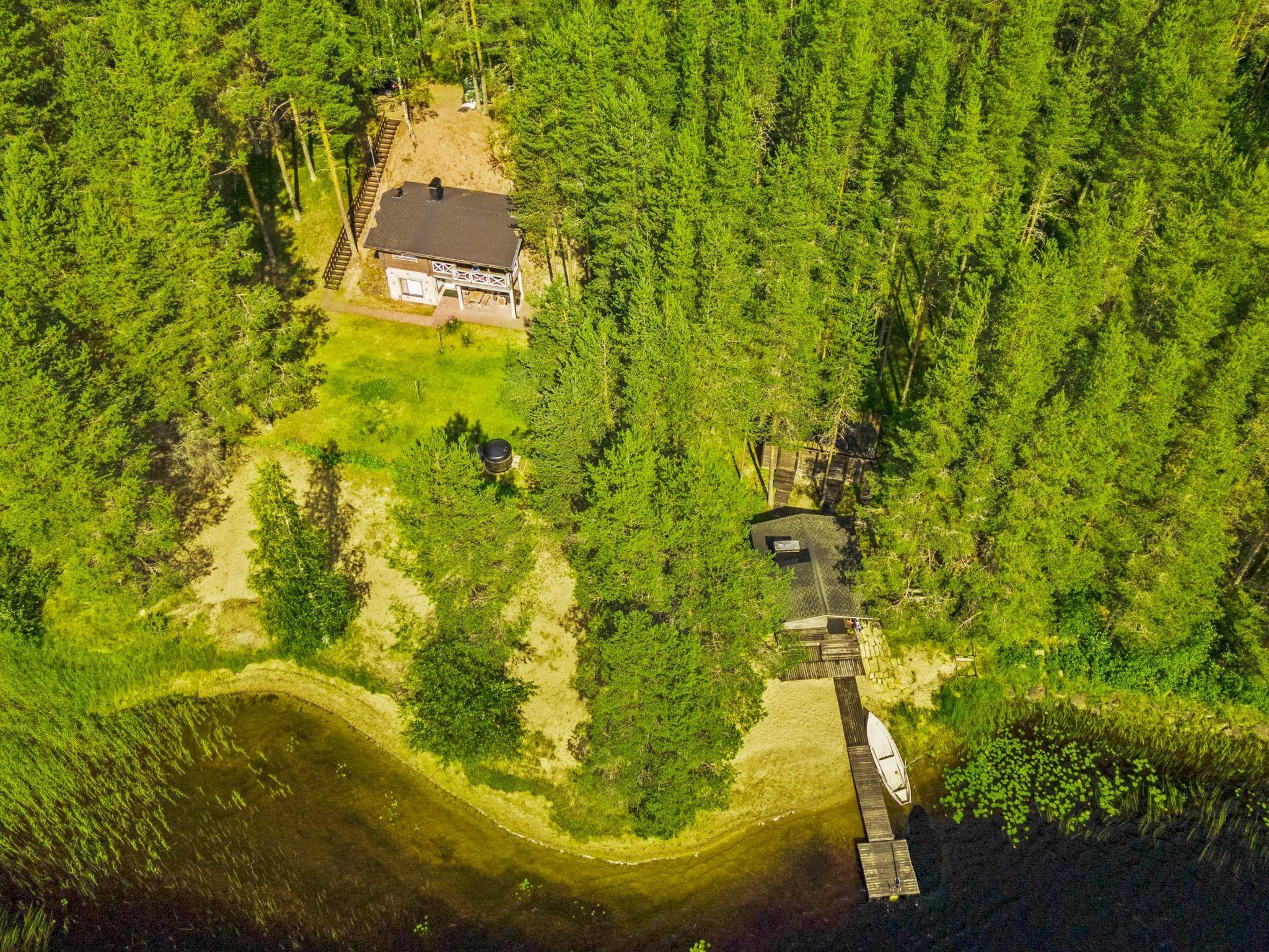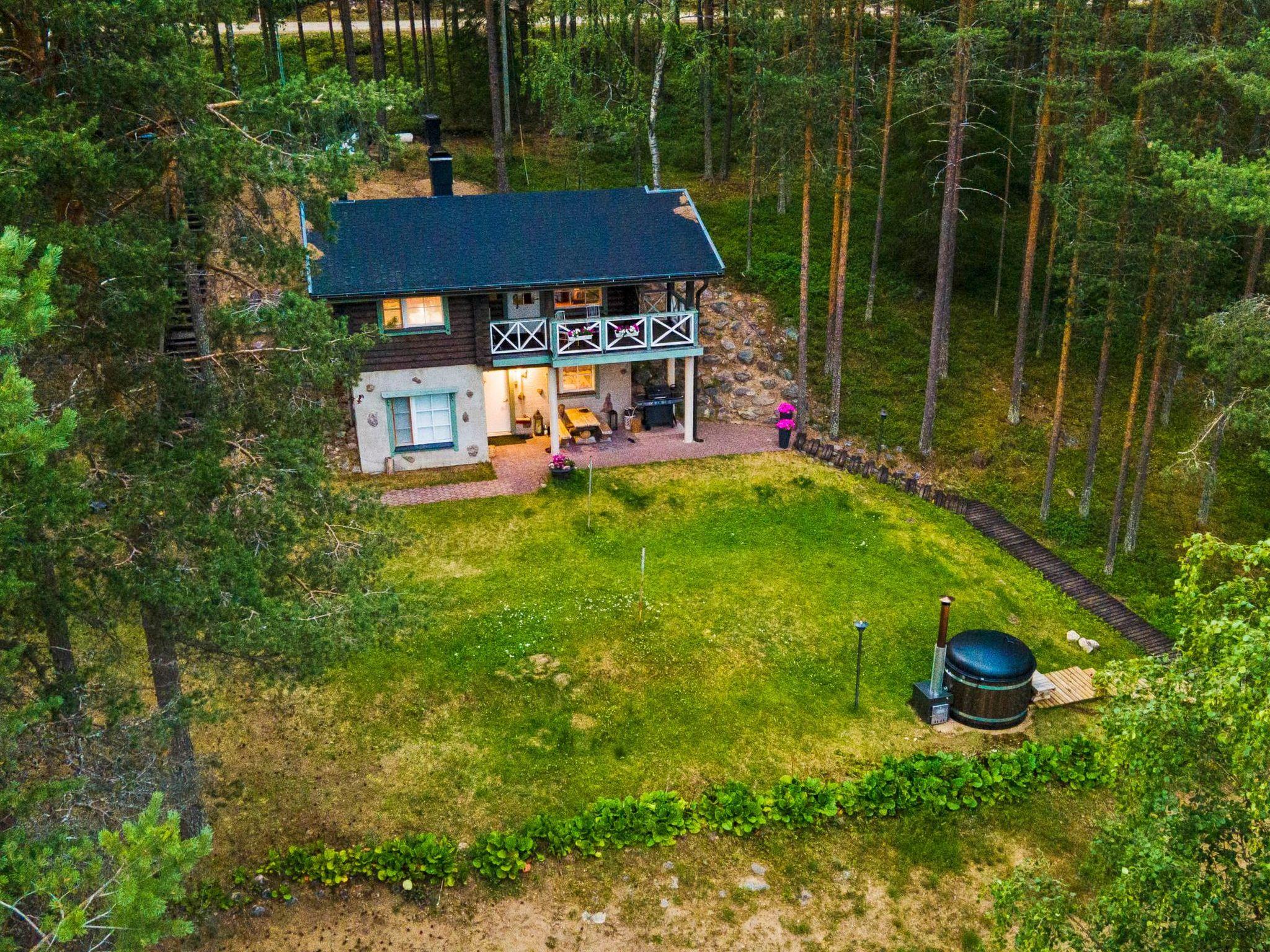 Log cabin (stone-built ground floor) on two floors, built in 2005. On the upper floor, living room with sofa bed, kitchen, bedroom (folding door) with 1 bed (width 140 cm), covered porch. On the ground floor, sauna (electric sauna stove), washroom/WC, living room with fireplace, bedroom (folding door) with double bed (width 140 cm). 2 televisions. In addition, PlayStation 2 console with some games, gas grill, and mosquito trap (so-called mosquito magnet). Water to the cabin comes from the spring.