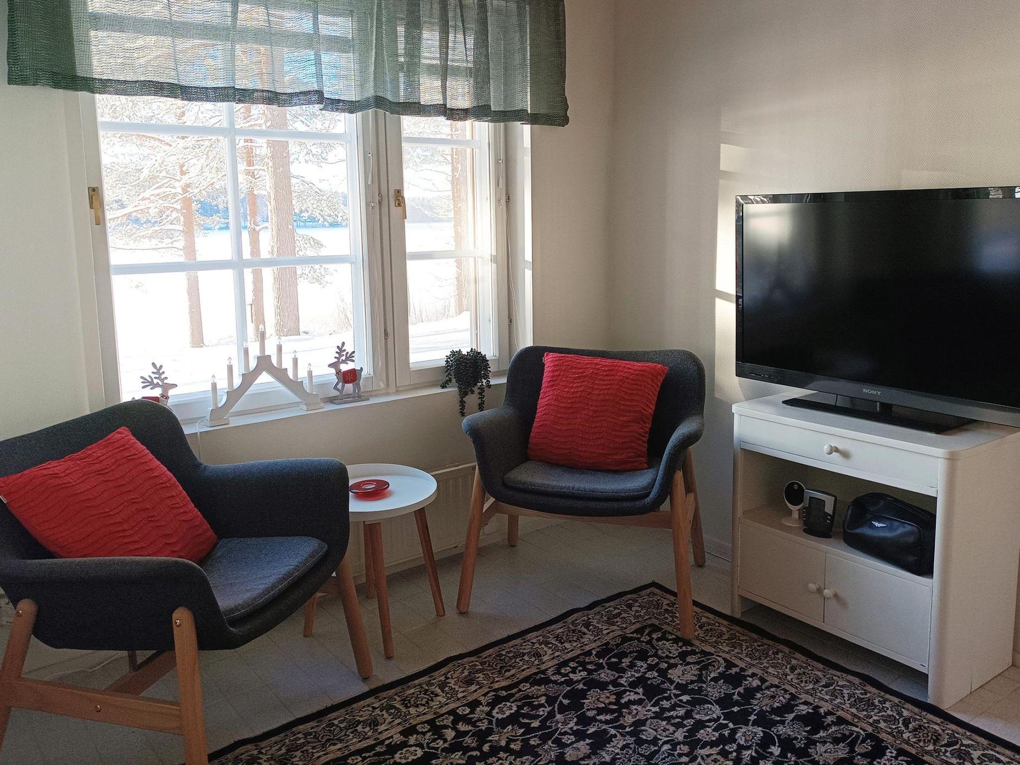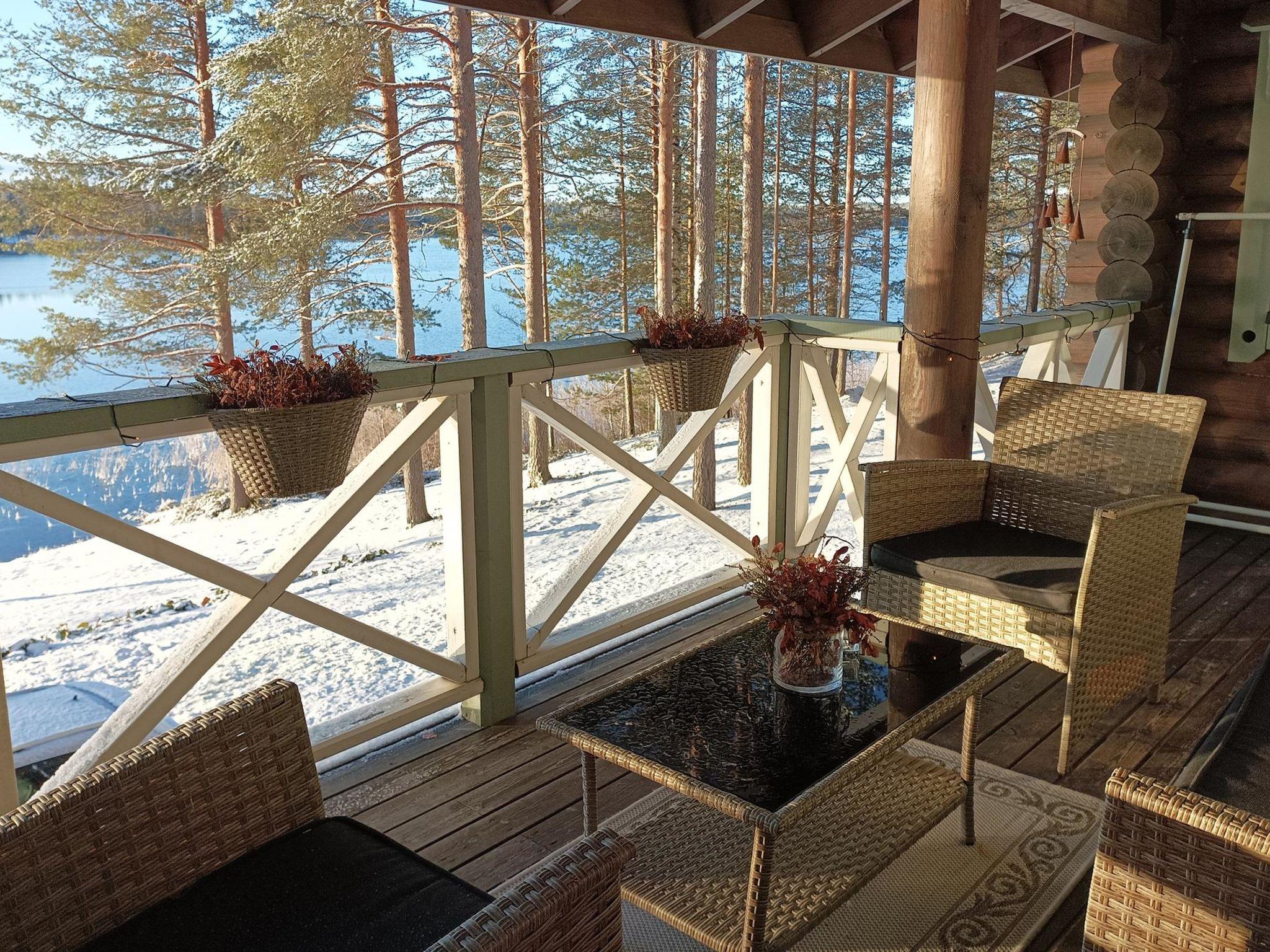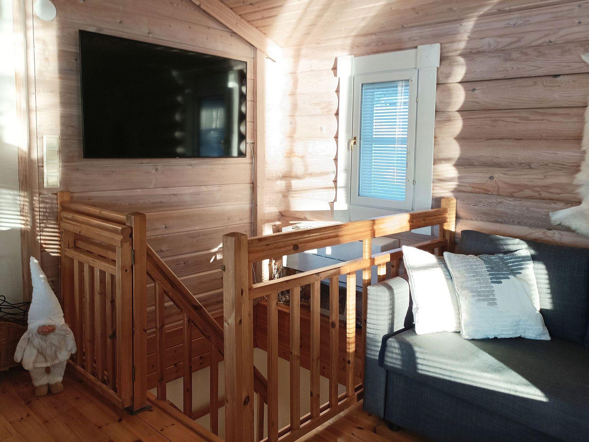 Log cabin (stone-built ground floor) on two floors, built in 2005. On the upper floor, living room with sofa bed, kitchen, bedroom (folding door) with 1 bed (width 140 cm), covered porch. On the ground floor, sauna (electric sauna stove), washroom/WC, living room with fireplace, bedroom (folding door) with double bed (width 140 cm). 2 televisions. In addition, PlayStation 2 console with some games, gas grill, and mosquito trap (so-called mosquito magnet). Water to the cabin comes from the spring.