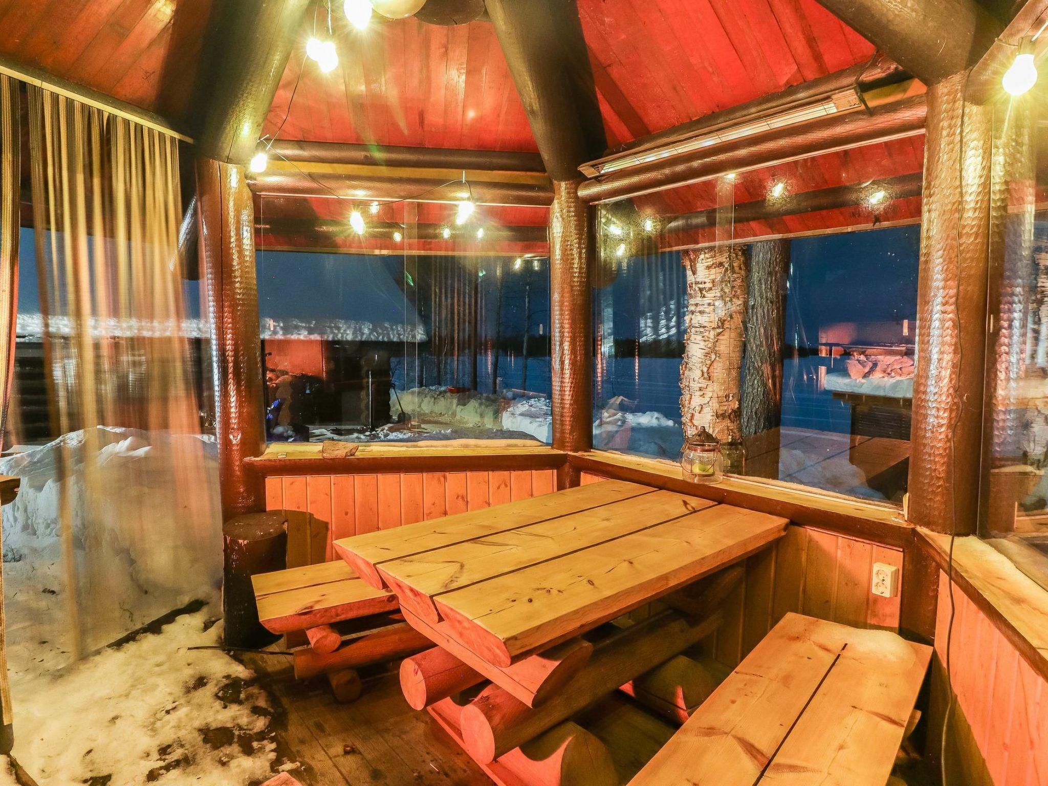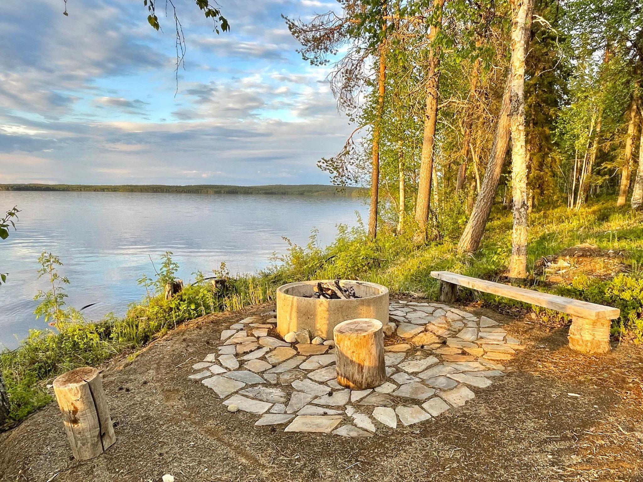 In connection with the lakeside sauna, there is a terrace with summer kitchen. The summer kitchen has a barbecue and terrace has a table for 6 people. In addition, closer to the lake is a separate campfire site. In windy weather or when the rain comes unexpectedly, there is also a covered cooking area with round log-built dining table for 4 people and a magnificent fireplace where you can fry sausages or even make blazed salmon.