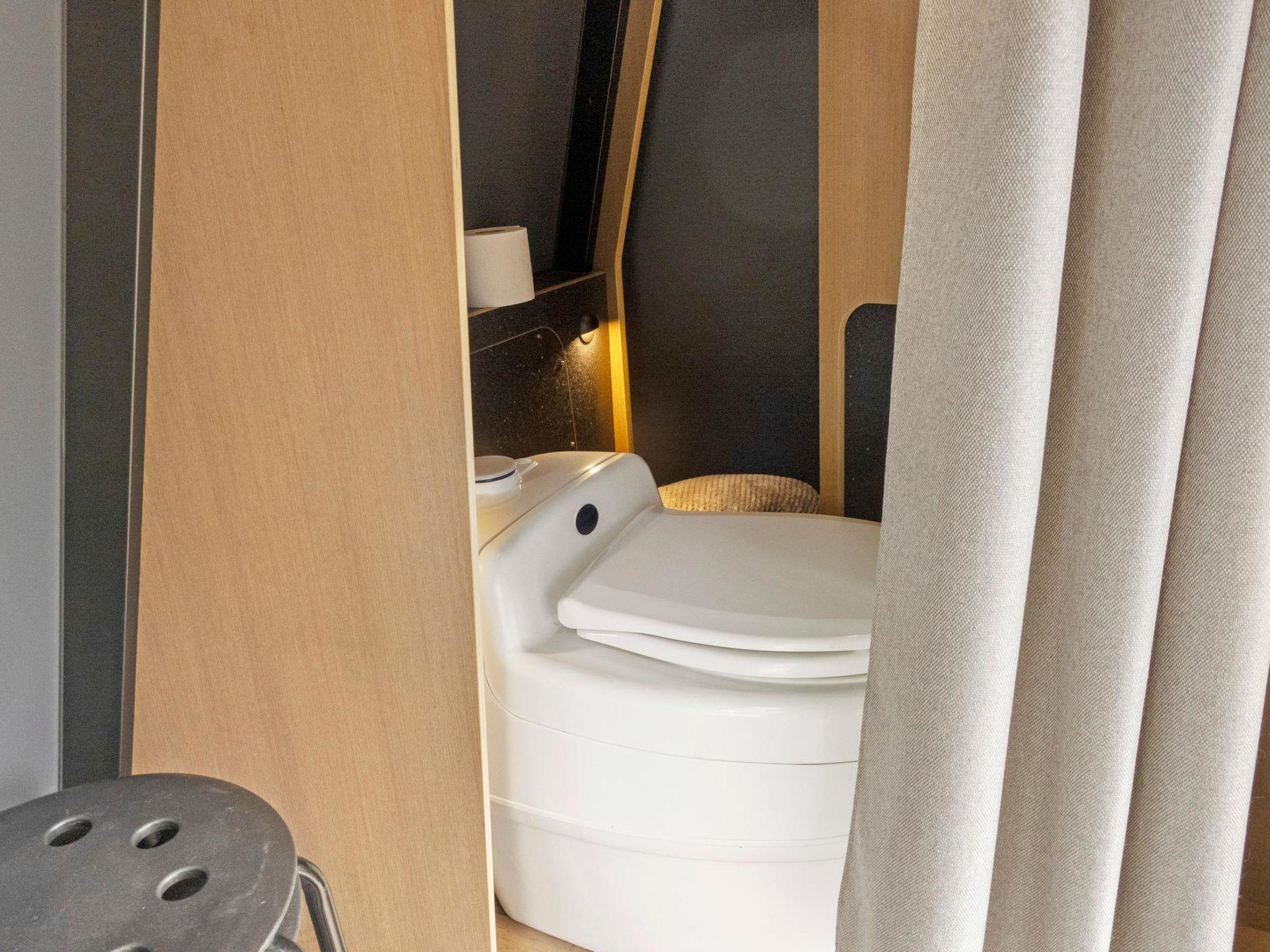 On the beach, a partially glass-walled igloo-style cabin with double bed. The igloo has heating, lighting, kitchenette (gas stove, fridge, sink) and chemical toilet.