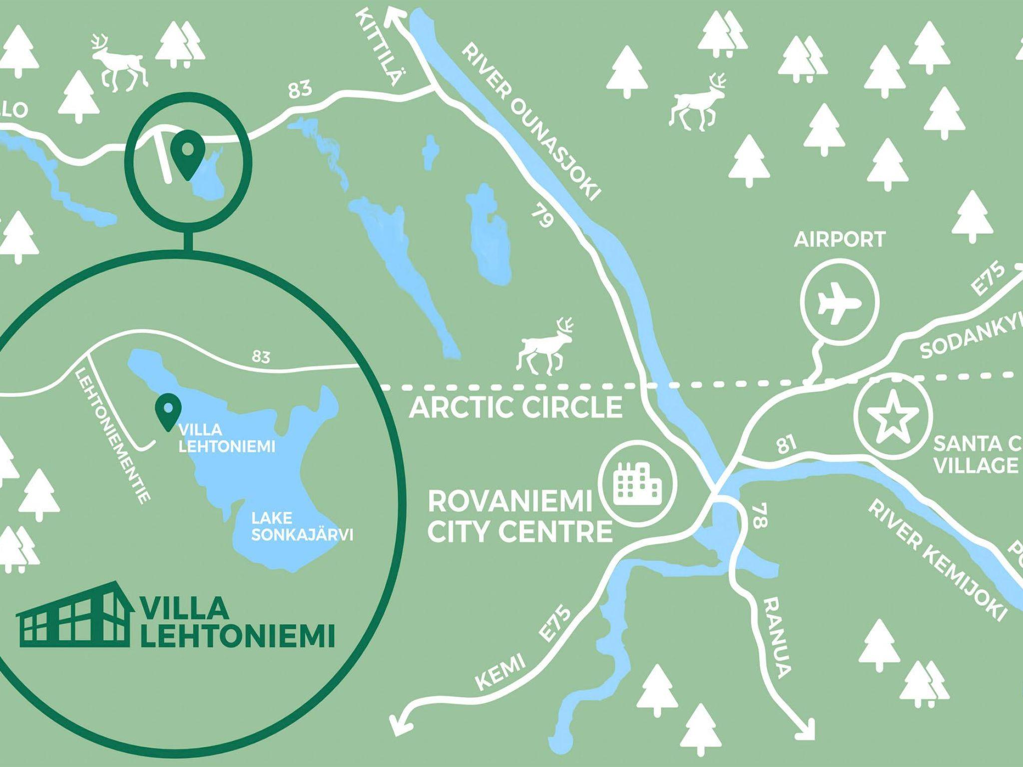 36 km to the northwest from Rovaniemi city center, lake Sonkajärvi 45 m (lake length 3.5 km, width 1.2 km), gently deepening sand beach, rowing boat. Gentle slope from the cabin to the beach, excellent sledding hill in winter.