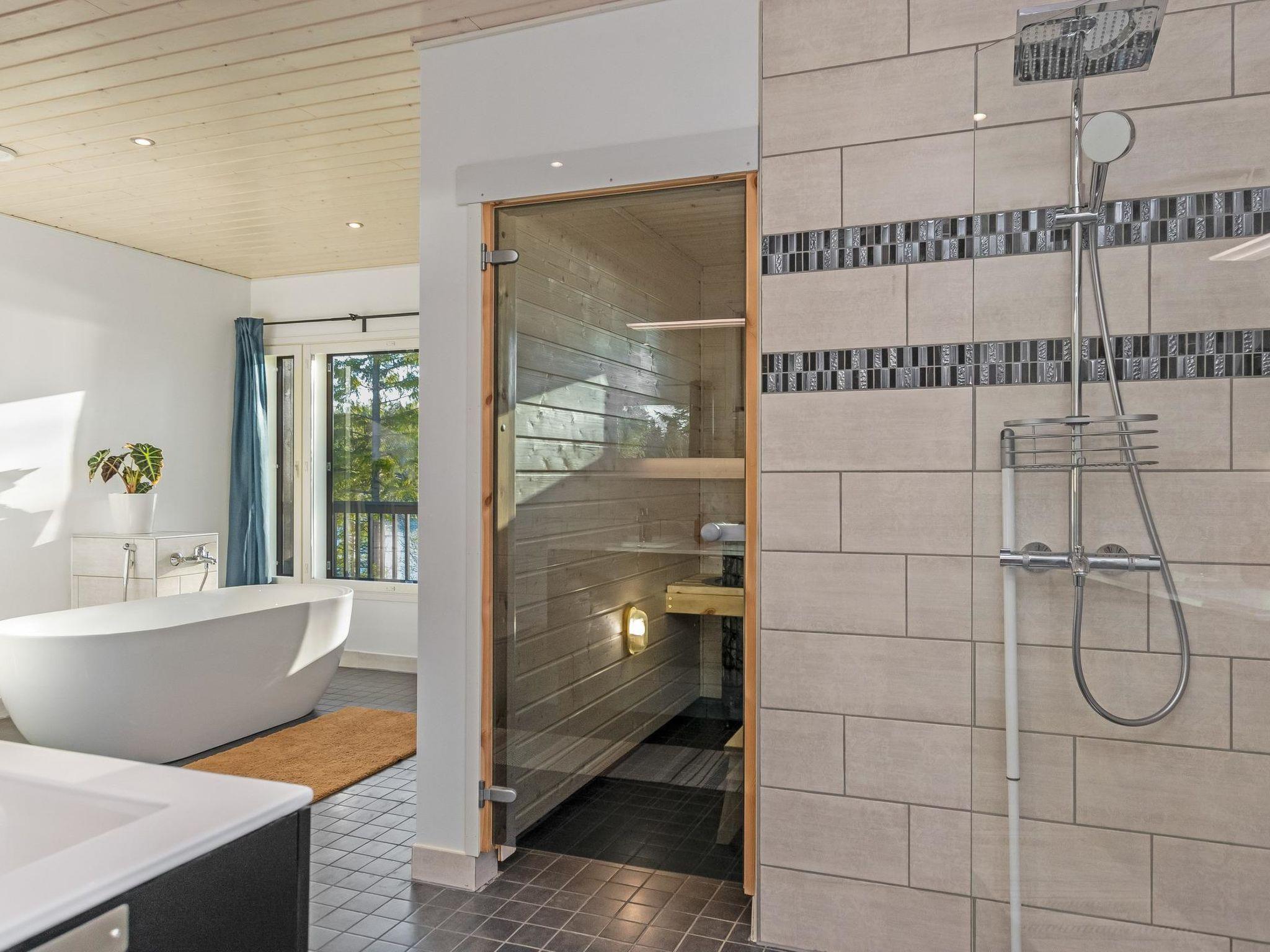 The lakeside sauna is available year-round and features a large covered terrace, dressing room, WC, shower, and a traditional wood-heated sauna stove. The walk from the main cabin to the lakeside sauna is approx. 50 meters.