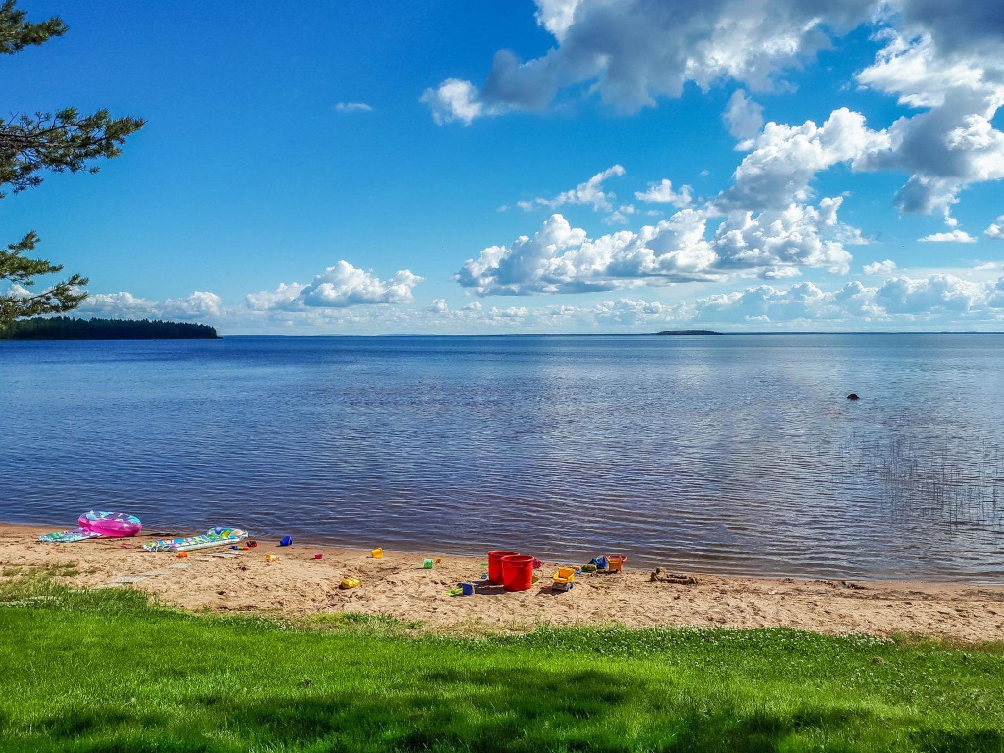 60 km northwest of Kajaani, lake Oulujärvi 20 m, shallow beach, sand bottom, suitable for children, 2 rowing boats.