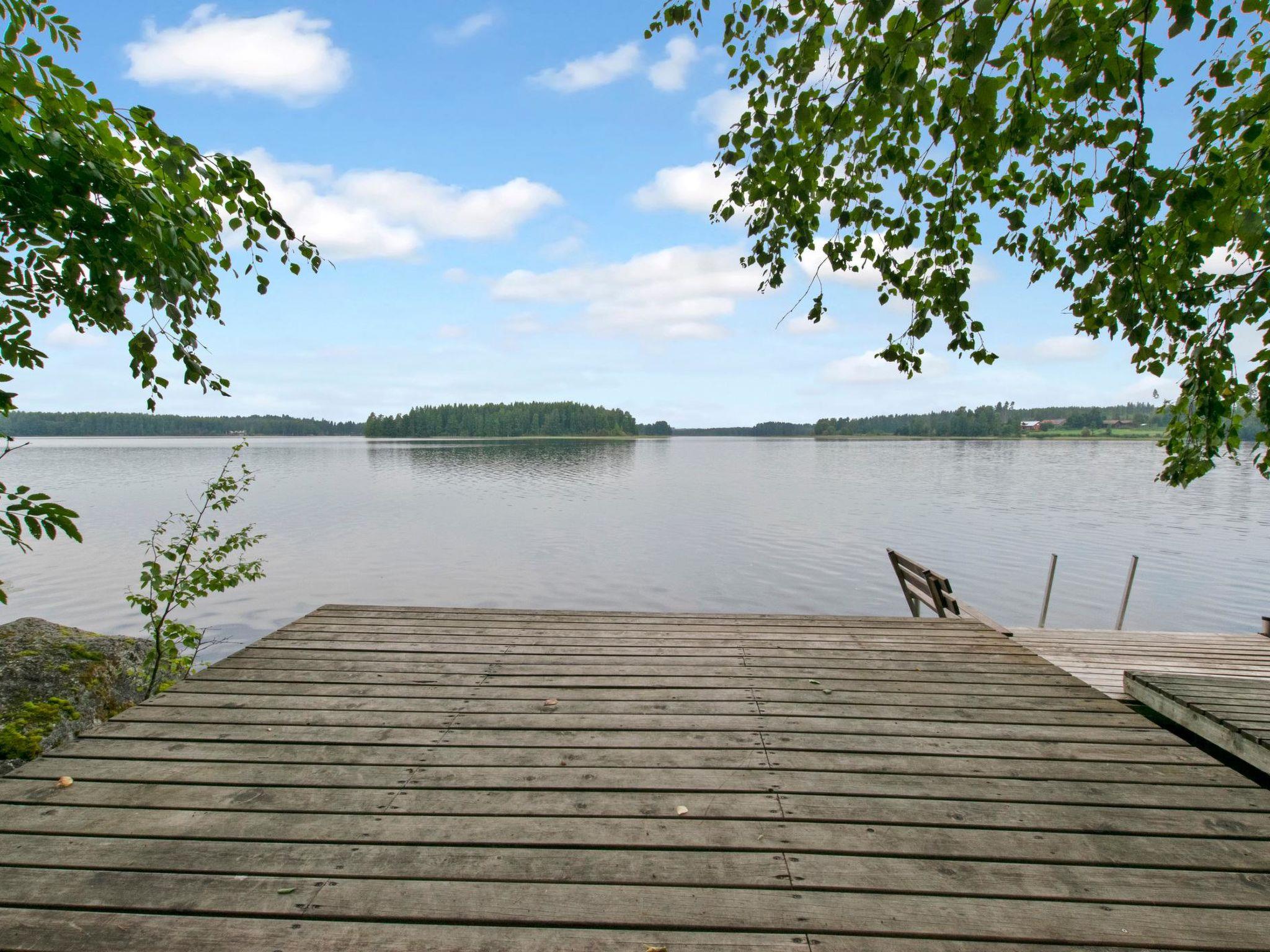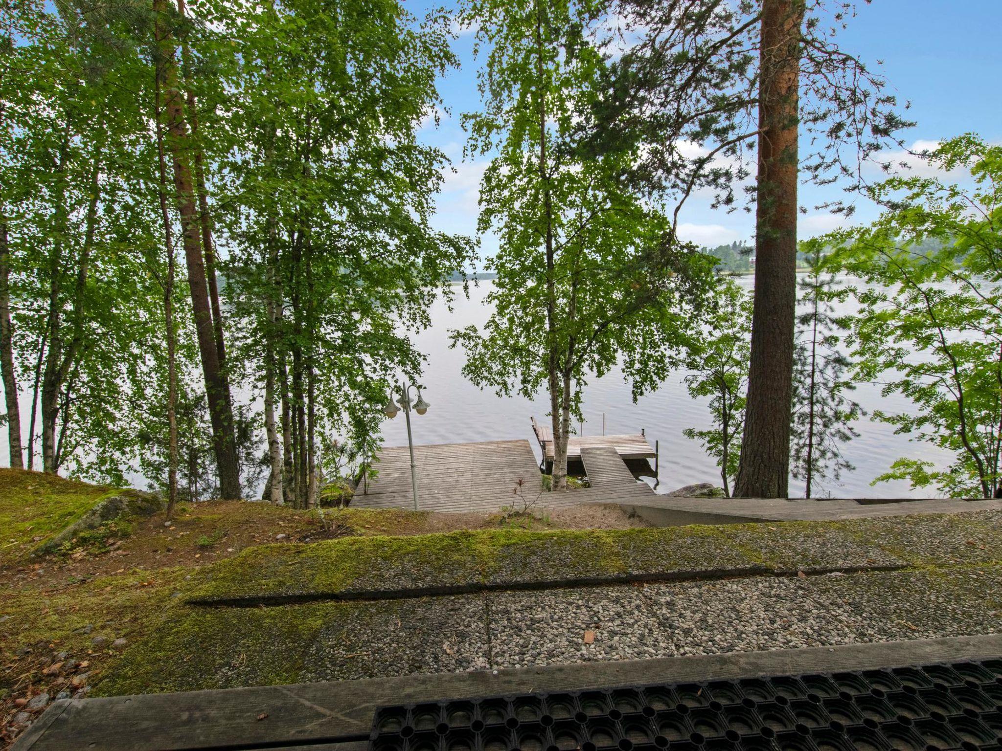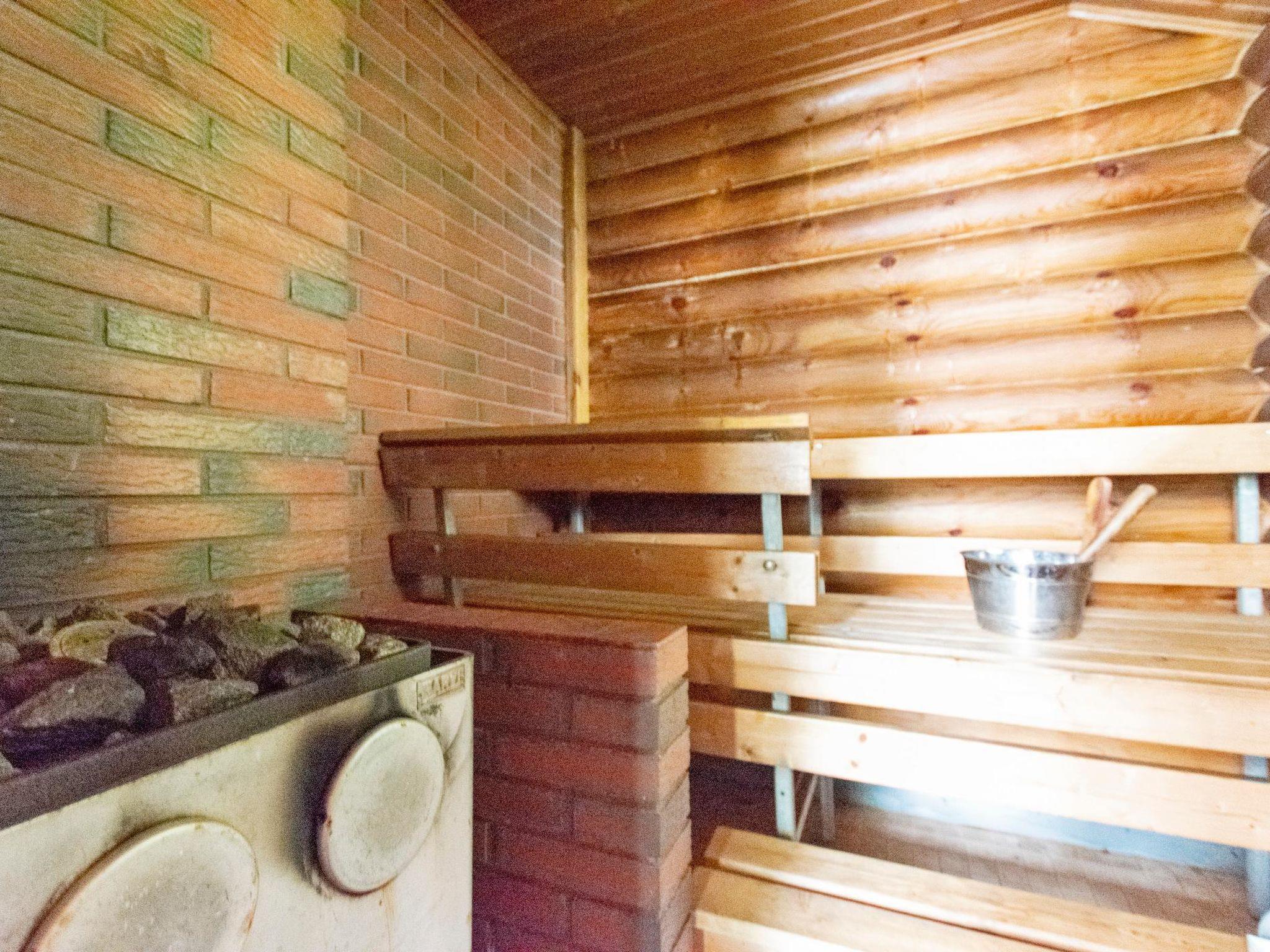 Yard building in summer use with access to an EKO toilet via a terrace. Lakeshore sauna 30 m², washroom with cold water pipe and wood-burning stove with hot water cauldron. Sauna rest room with extendible double bed, steps from terrace down to jetty.