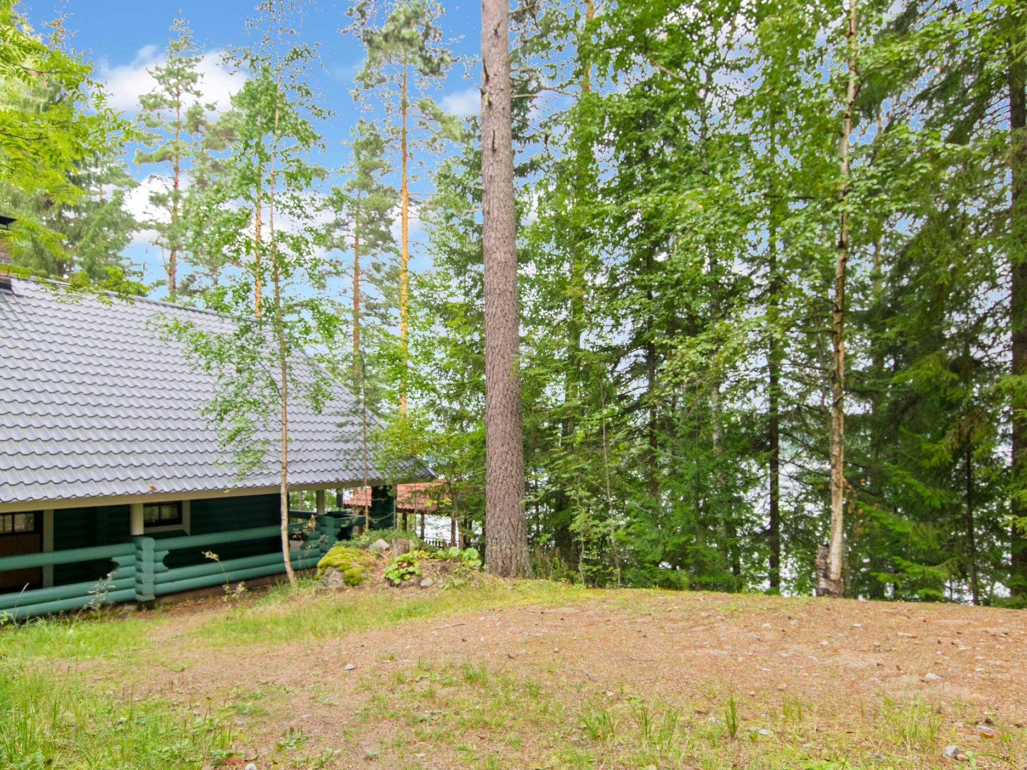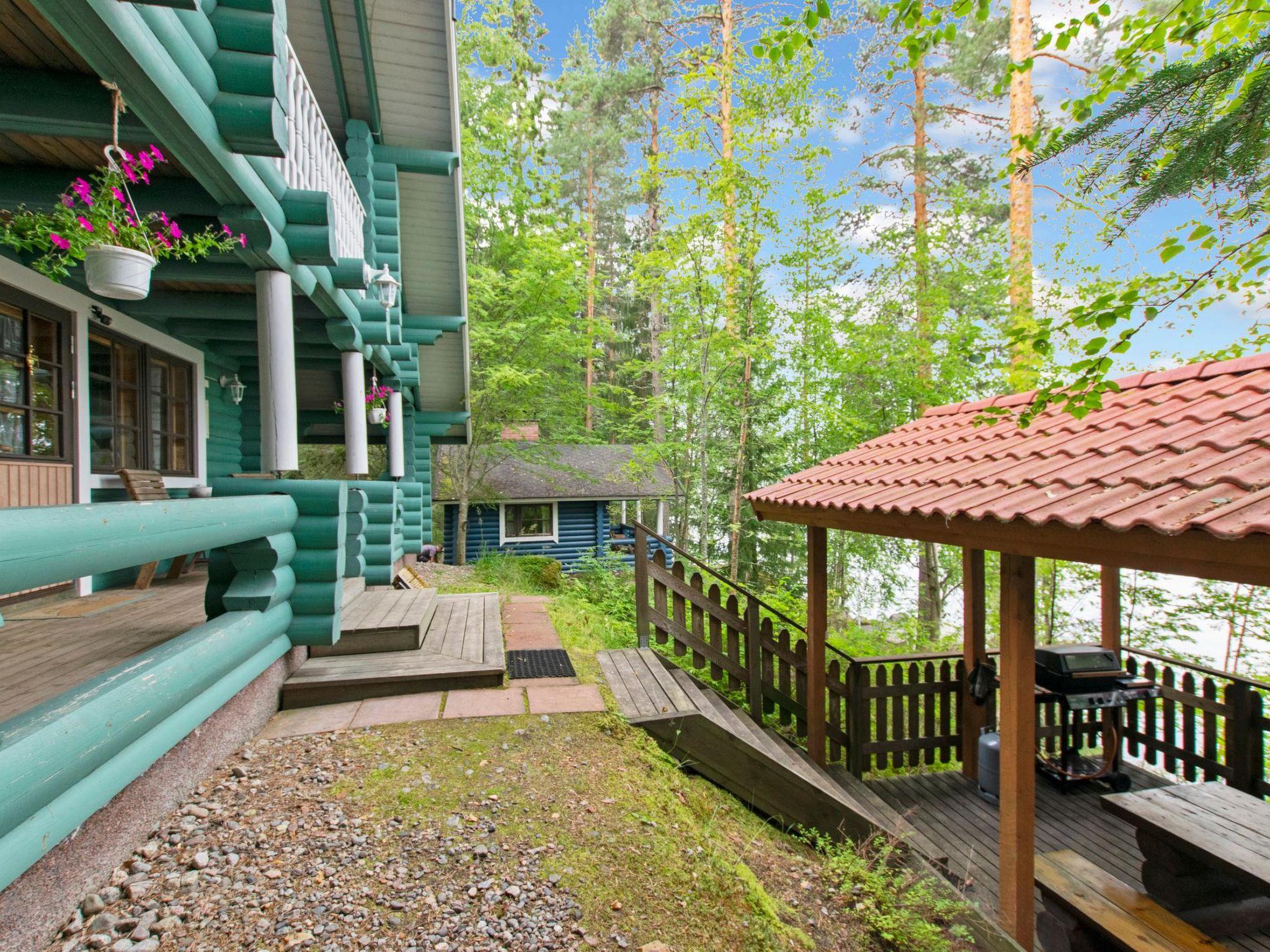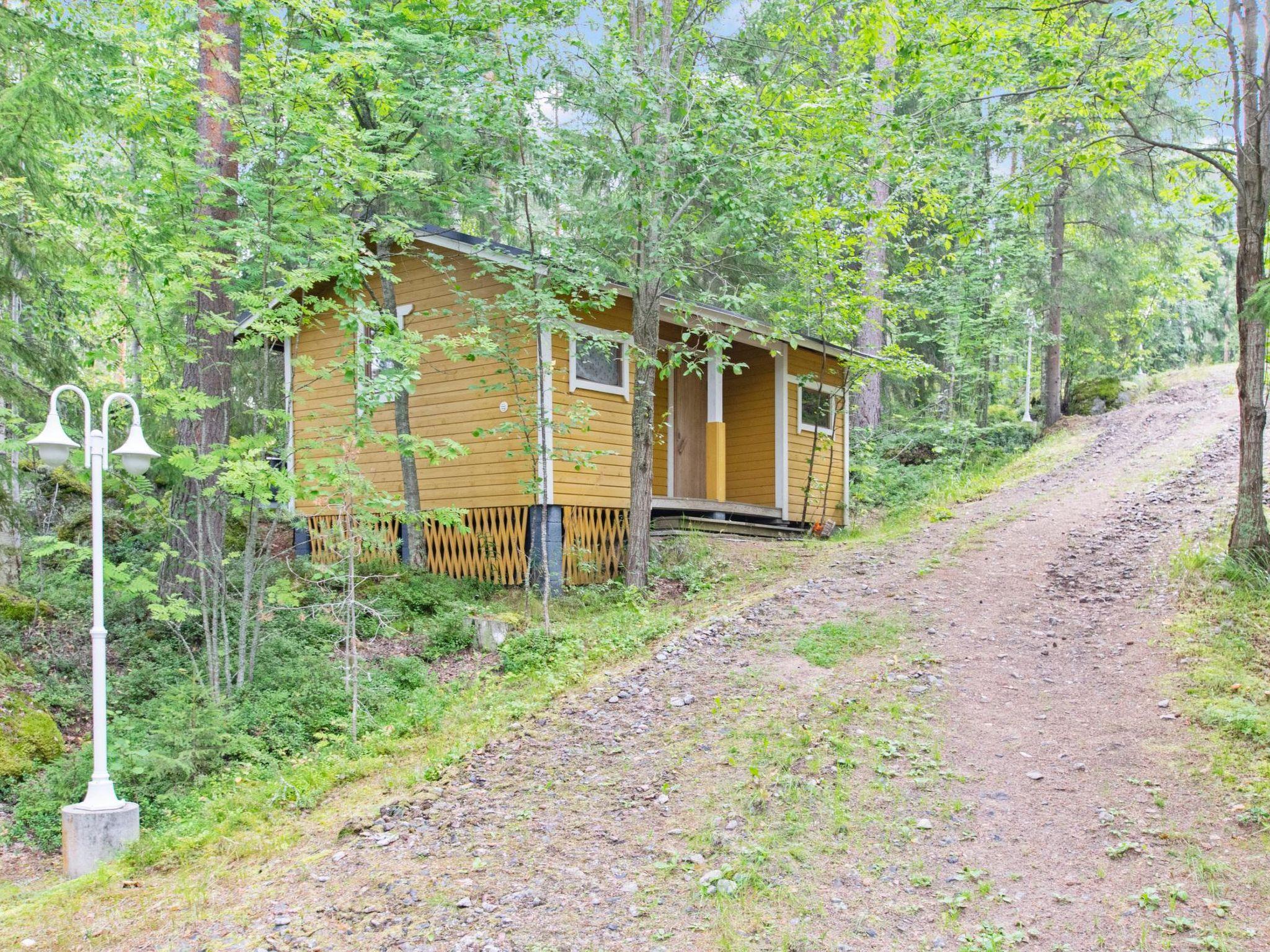 Yard building in summer use with access to an EKO toilet via a terrace. Lakeshore sauna 30 m², washroom with cold water pipe and wood-burning stove with hot water cauldron. Sauna rest room with extendible double bed, steps from terrace down to jetty.