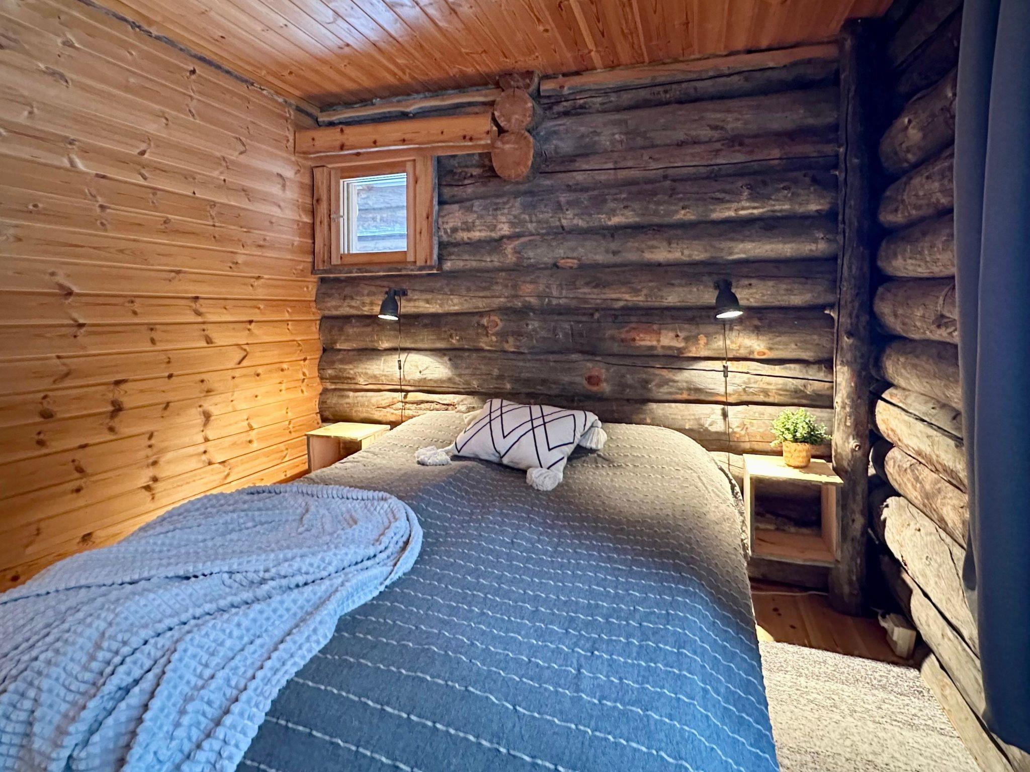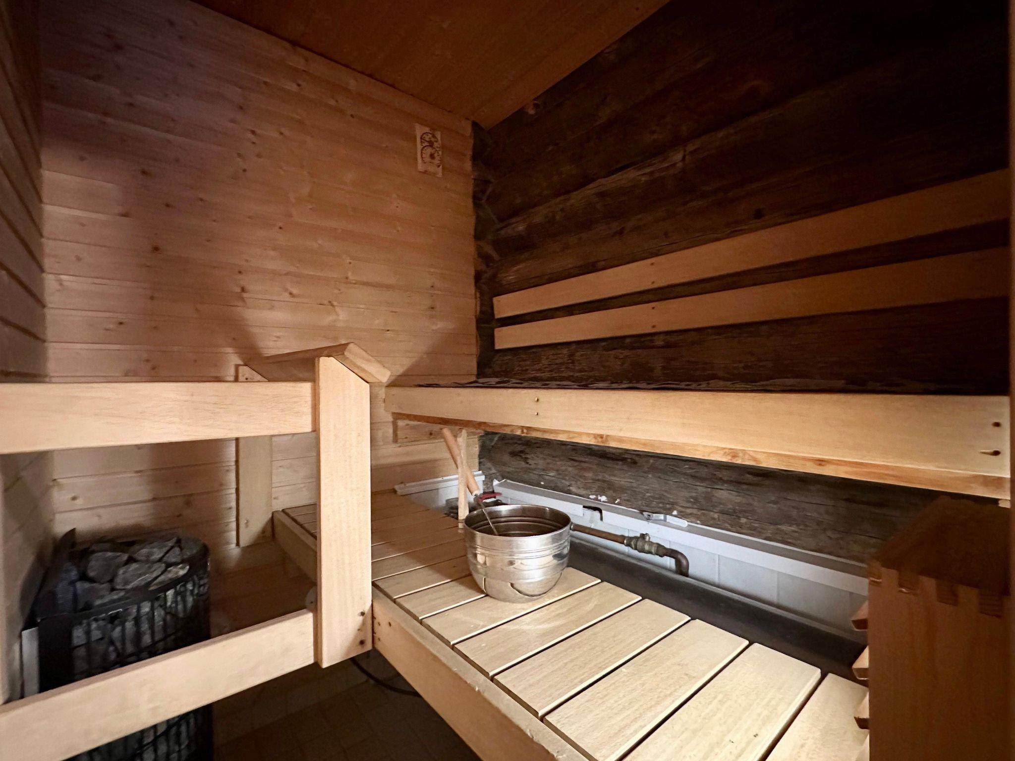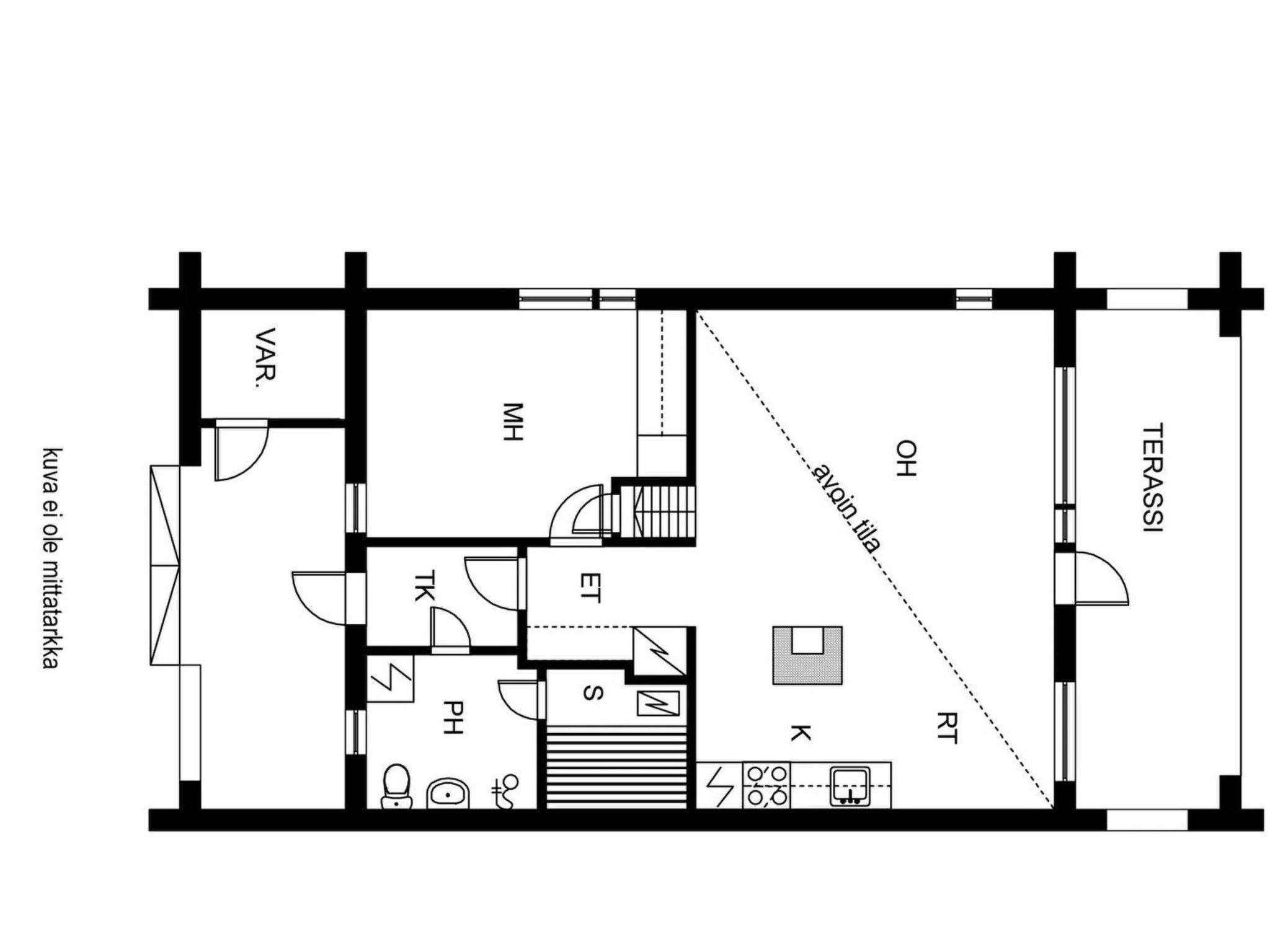 Apartment built in 1990, kitchen-living room with a fireplace, double bed and wardrobes in the bedroom. Steep stairs to the loft, with mattresses / beds for 2. Sauna with electric stove, washroom/toilet, covered terrace and storage.